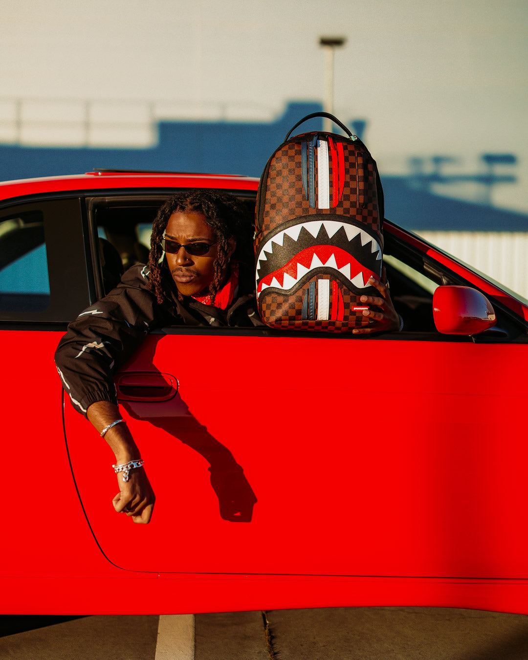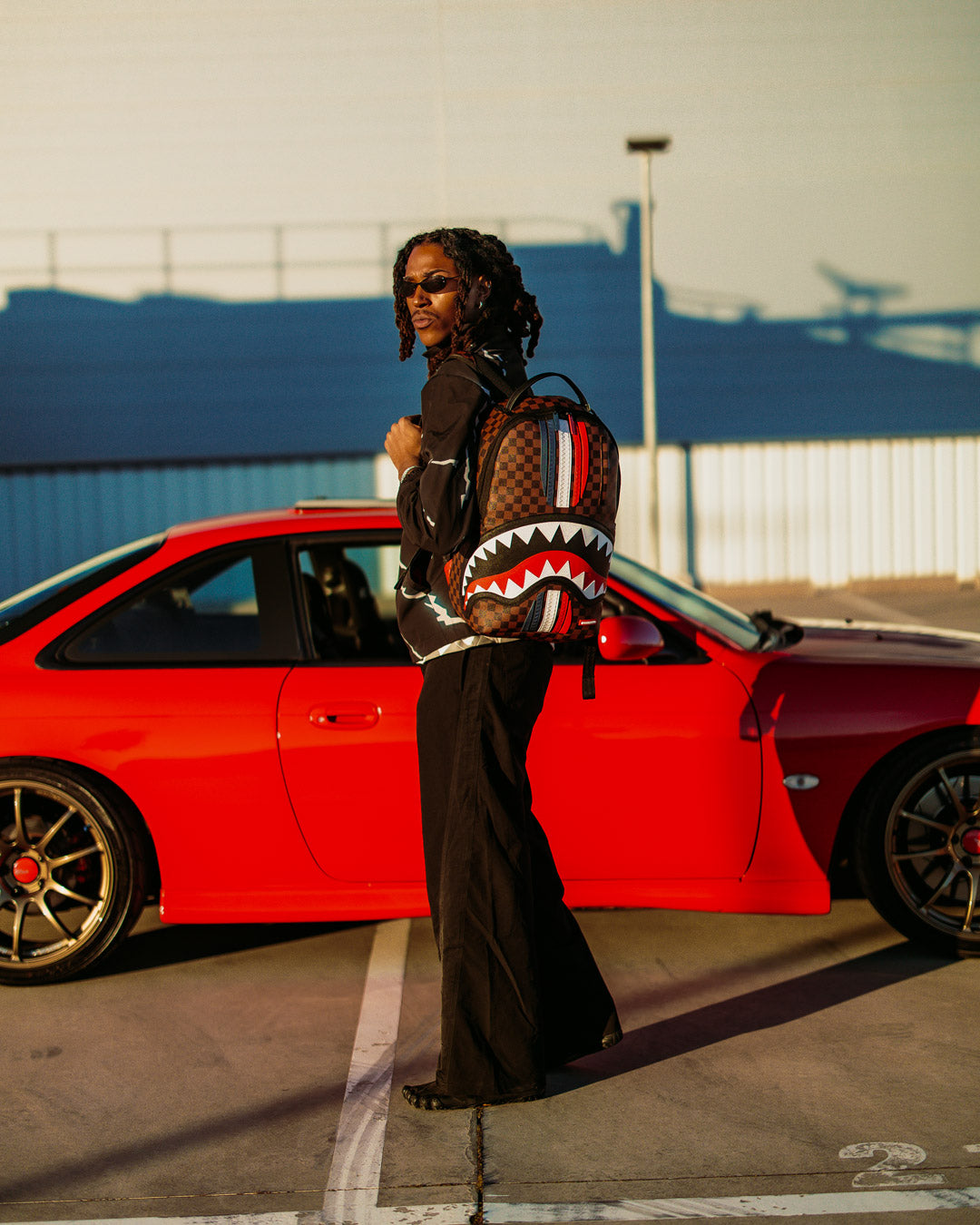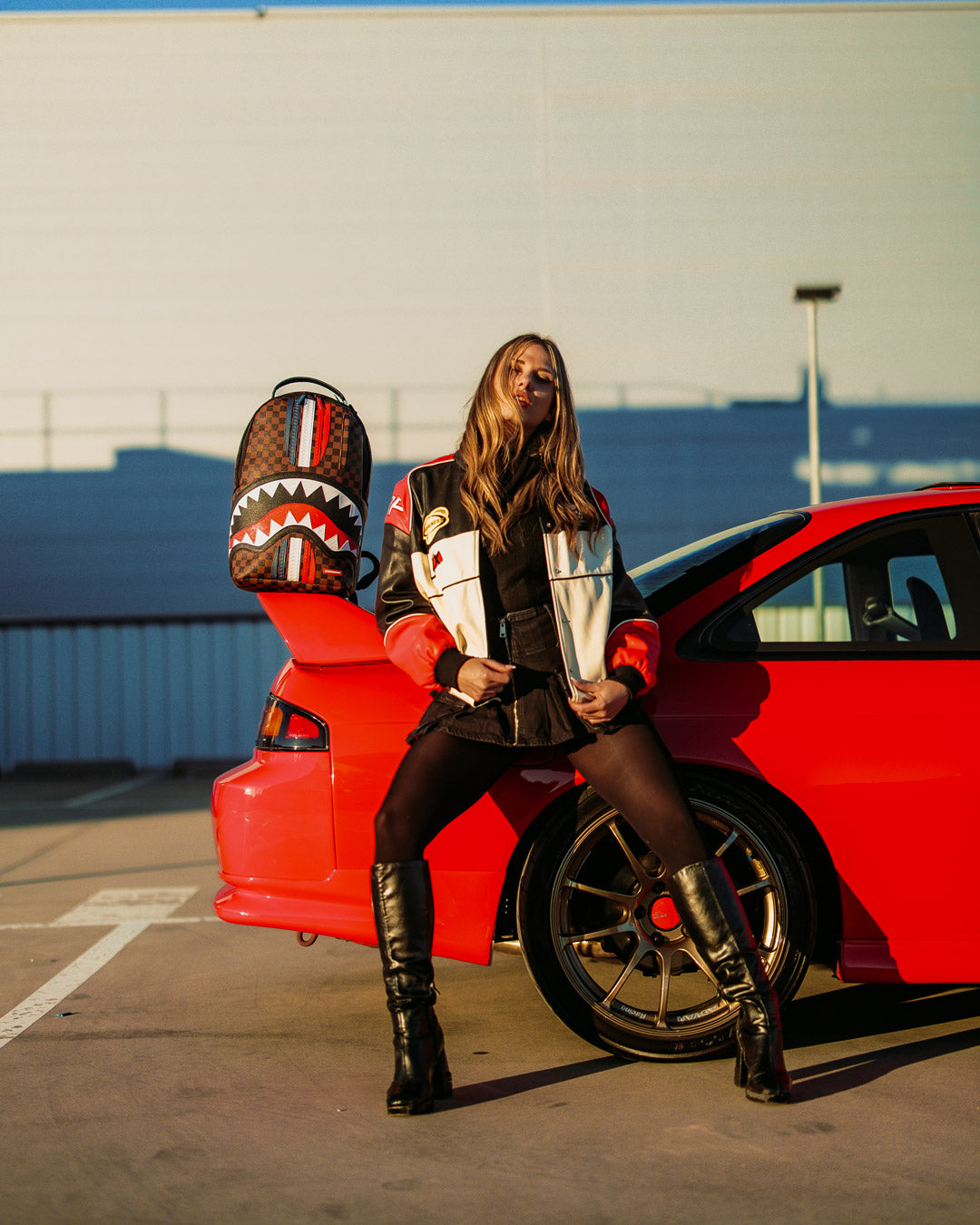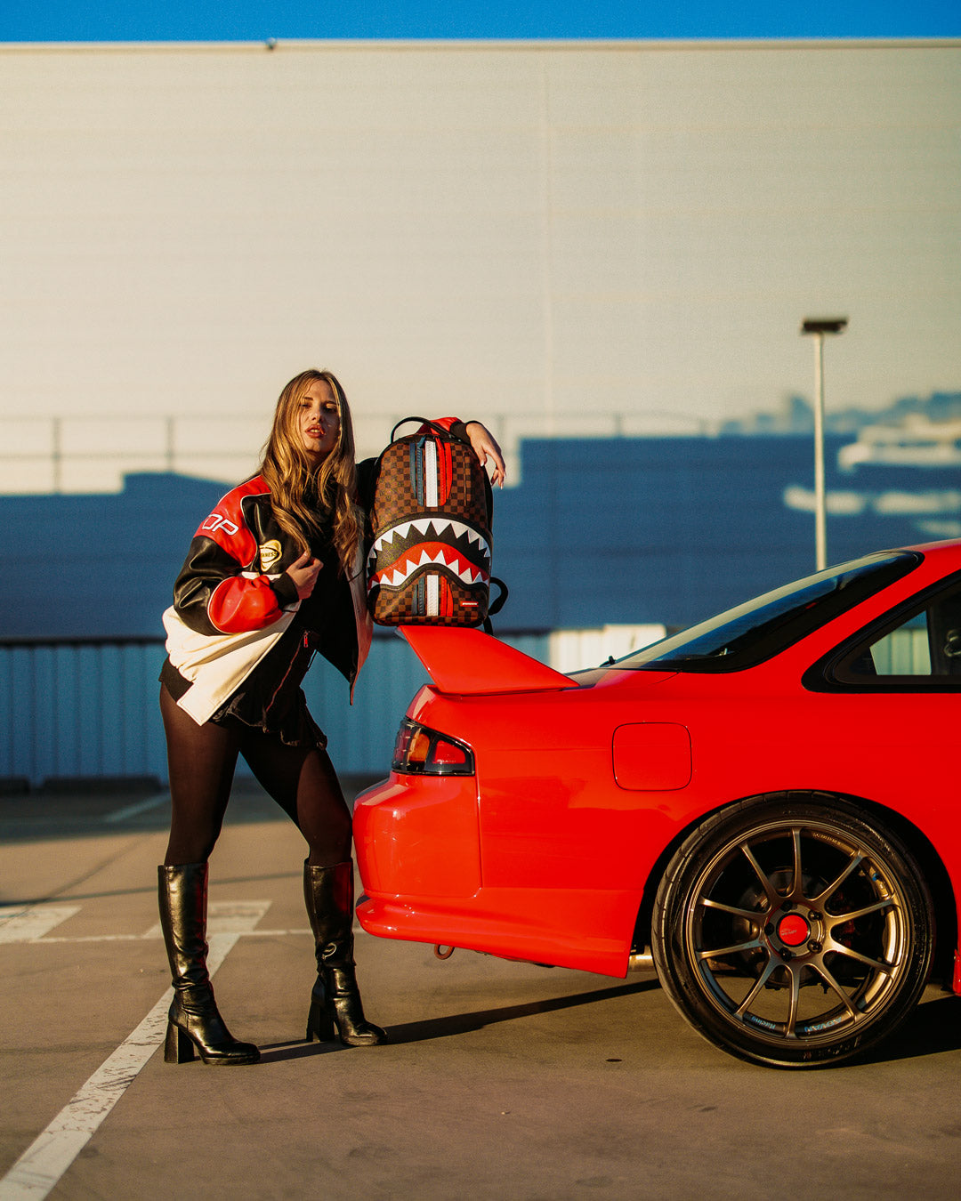 Dimensions: 18' x 6' x 11.5' • Front zipper pocket • Side pockets • Zippered Stash pocket • Separate velour sunglass compartment • Ergonomic mesh back padding • Adjustable Straps for custom sizing • Gold zippers with metal hardware • Metal 'Sprayground Authentic' badge • Slide through back sleeve connects to carry-on luggage to free your hands