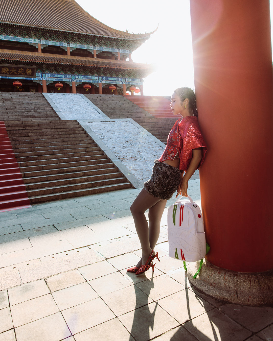 Dimensions: 18' x 6' x 11.5' • Front zipper pocket • Side pockets • Zippered Stash pocket • Separate velour sunglass compartment • Ergonomic mesh back padding • Adjustable Straps for custom sizing • Gold zippers with metal hardware • Metal 'Sprayground Authentic' badge • Slide through back sleeve connects to carry-on luggage to free your hands