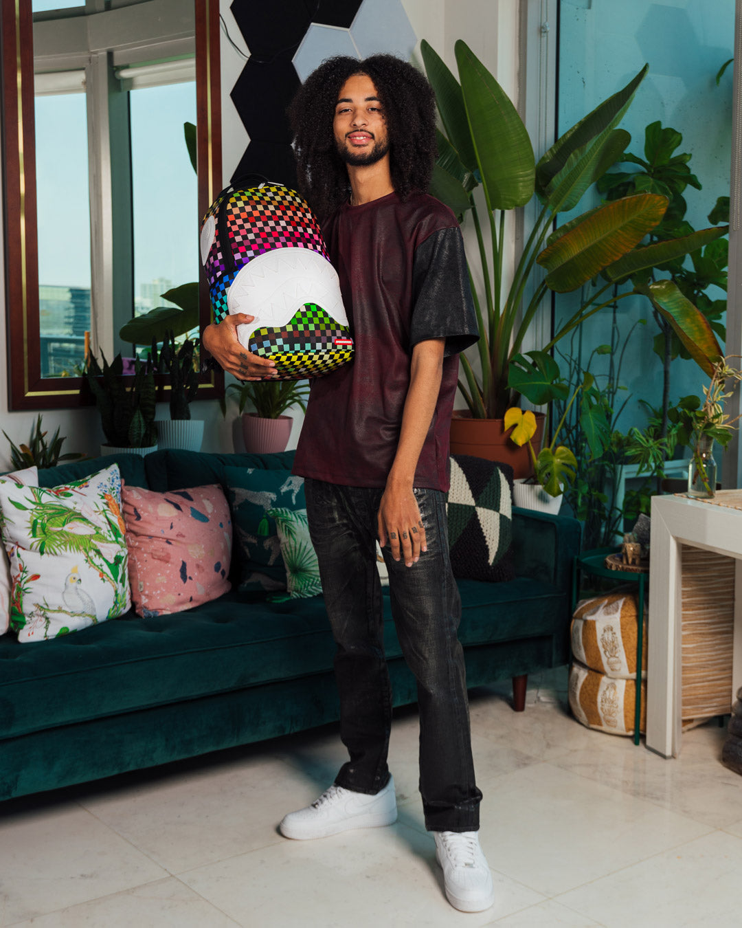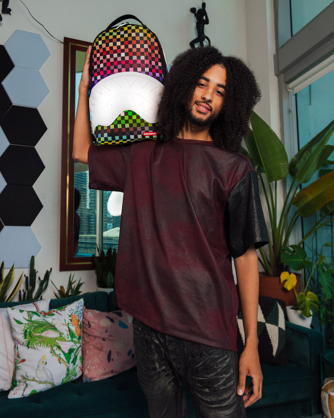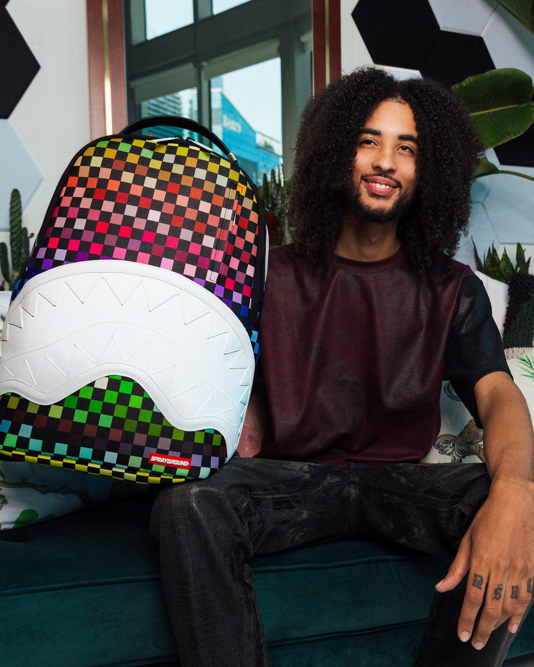 Dimensions: 18' x 6' x 11.5' • Front zipper pocket • Side pockets • Zippered Stash pocket • Separate velour sunglass compartment • Ergonomic mesh back padding • Adjustable Straps for custom sizing • Gold zippers with metal hardware • Metal 'Sprayground Authentic' badge • Slide through back sleeve connects to carry-on luggage to free your hands