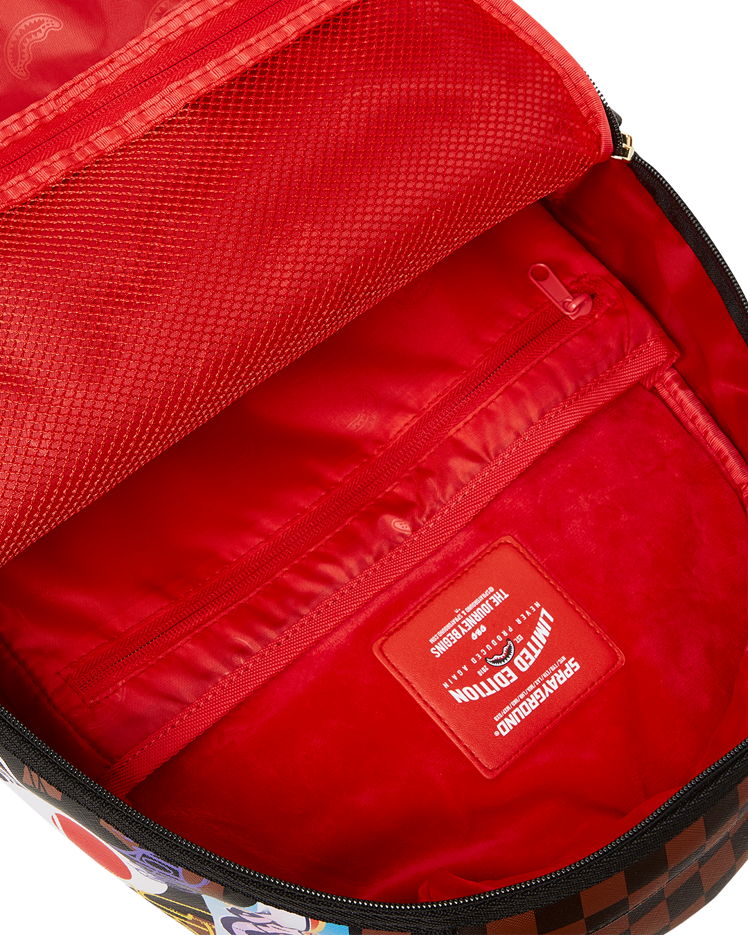 Dimensions: 18' x 6' x 11.5' • Front zipper pocket • Side pockets • Zippered Stash pocket • Separate velour sunglass compartment • Ergonomic mesh back padding • Adjustable Straps for custom sizing • Gold zippers with metal hardware • Metal 'Sprayground Authentic' badge • Slide through back sleeve connects to carry-on luggage to free your hands