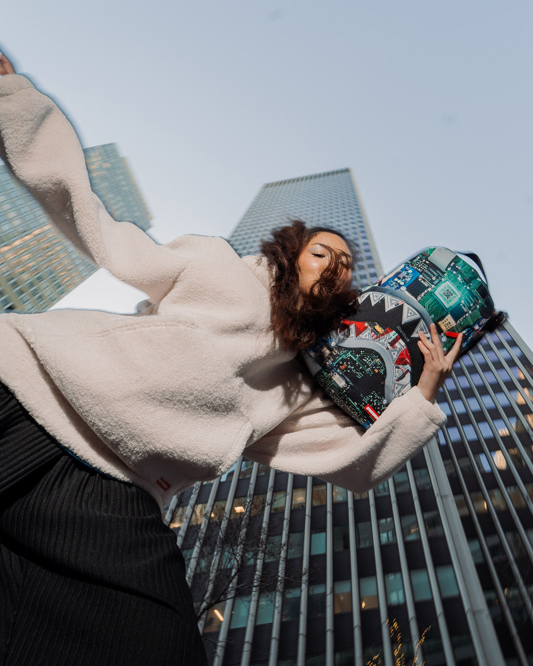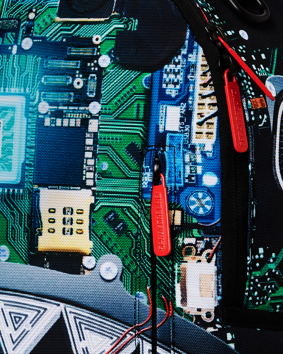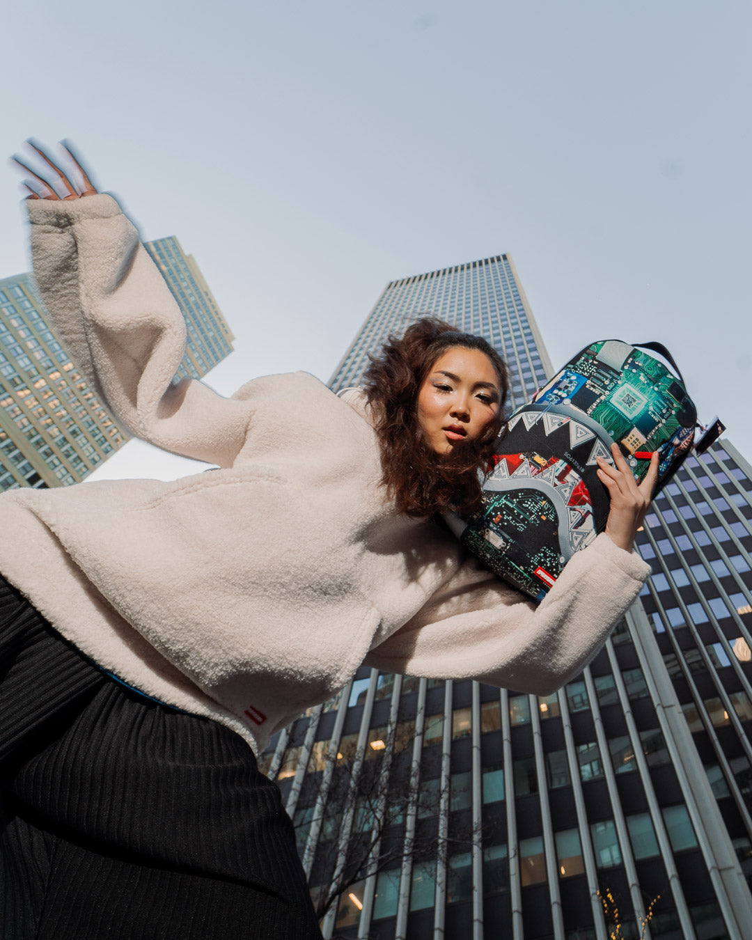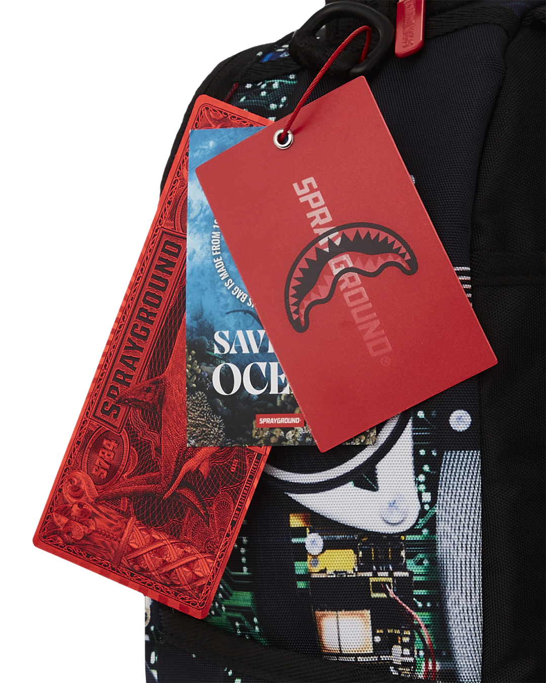 Dimensions: 18' x 6' x 11.5' • Front zipper pocket • Side pockets • Zippered Stash pocket • Separate velour sunglass compartment • Ergonomic mesh back padding • Adjustable Straps for custom sizing • Gold zippers with metal hardware • Metal 'Sprayground Authentic' badge • Slide through back sleeve connects to carry-on luggage to free your hands