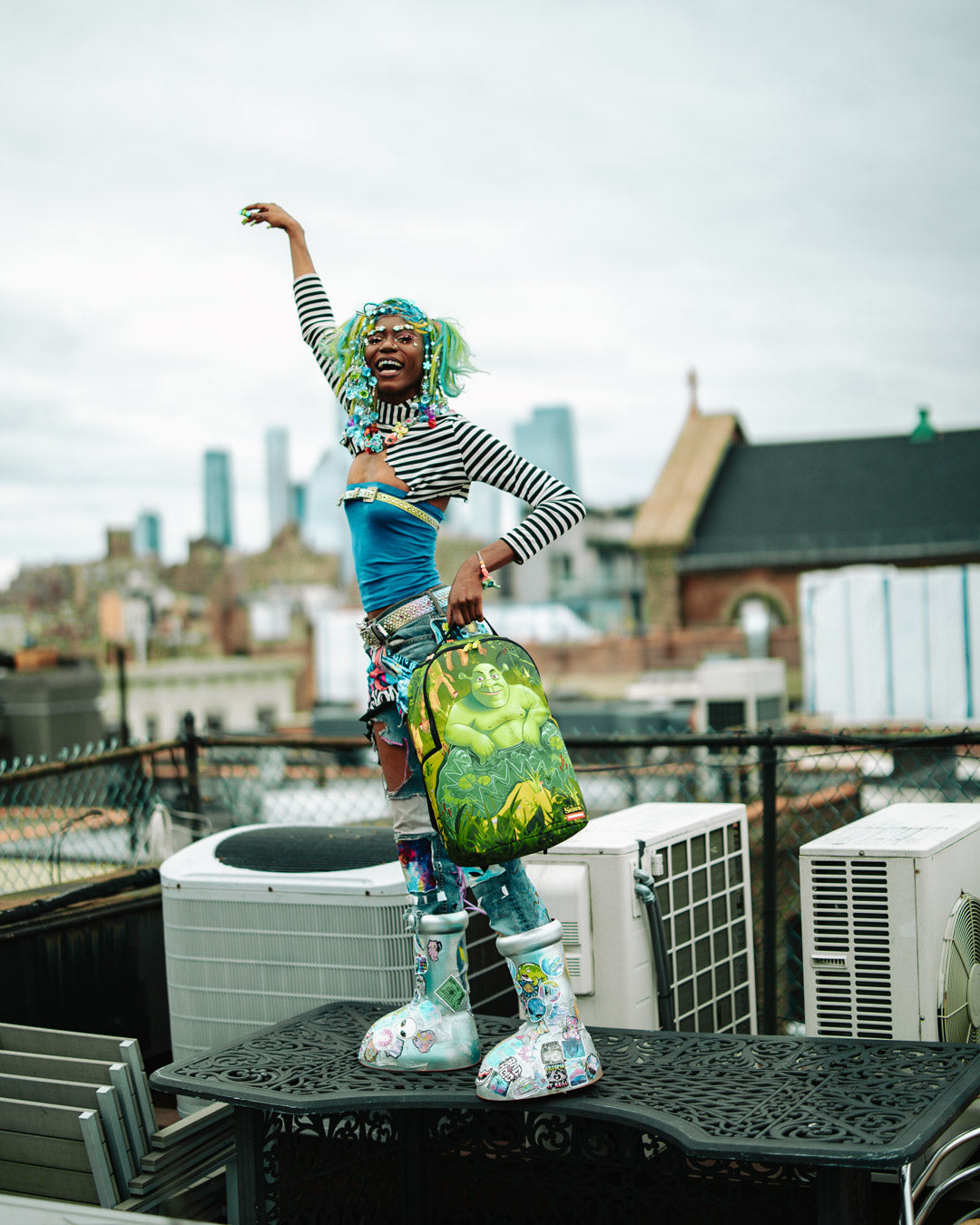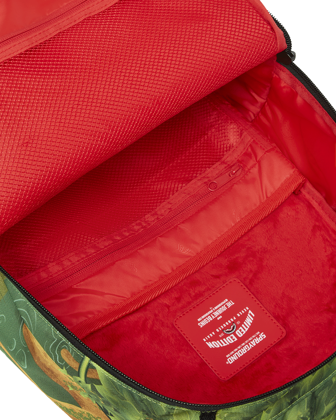 Dimensions: 18' x 6' x 11.5' • Front zipper pocket • Side pockets • Zippered Stash pocket • Separate velour sunglass compartment • Ergonomic mesh back padding • Adjustable Straps for custom sizing • Gold zippers with metal hardware • Metal 'Sprayground Authentic' badge • Slide through back sleeve connects to carry-on luggage to free your hands
