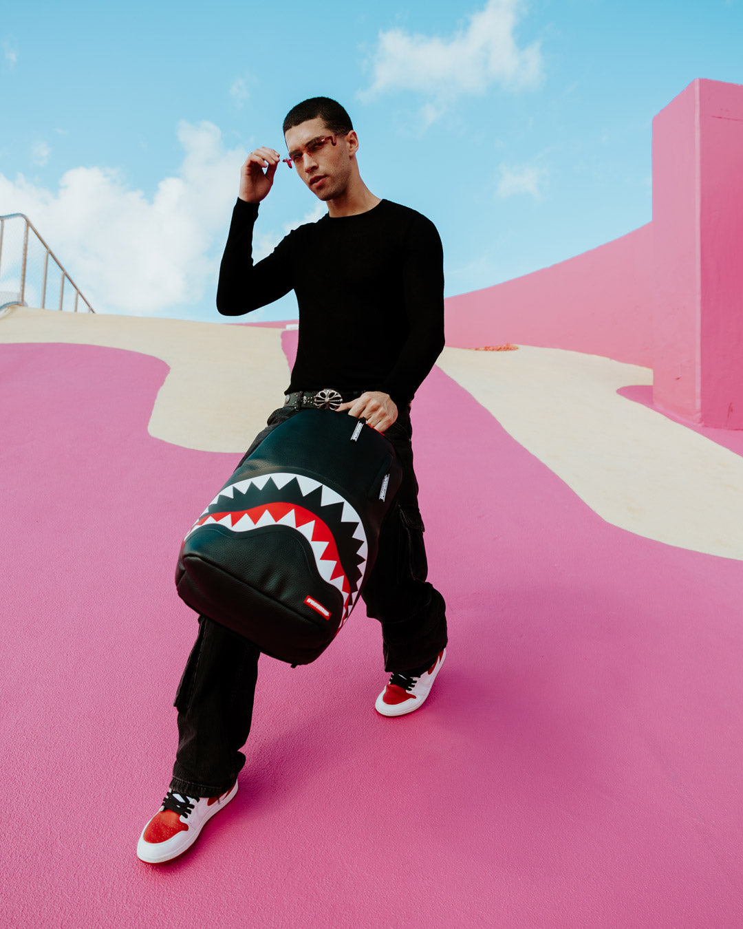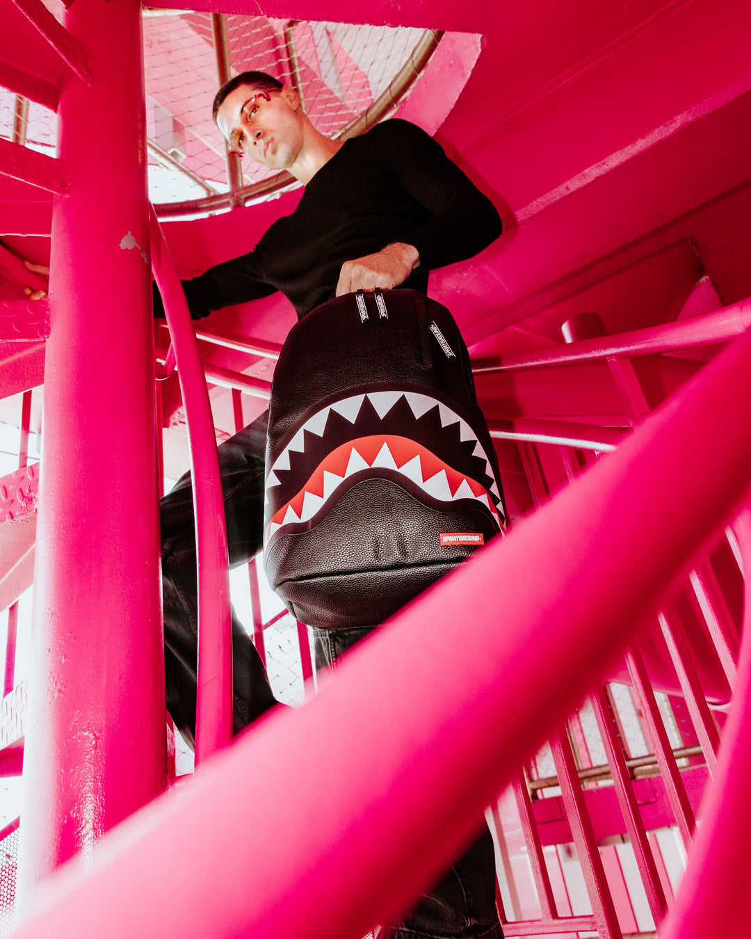 Dimensions: 18' x 6' x 11.5' • Front zipper pocket • Side pockets • Zippered Stash pocket • Separate velour sunglass compartment • Ergonomic mesh back padding • Adjustable Straps for custom sizing • Gold zippers with metal hardware • Metal 'Sprayground Authentic' badge • Slide through back sleeve connects to carry-on luggage to free your hands