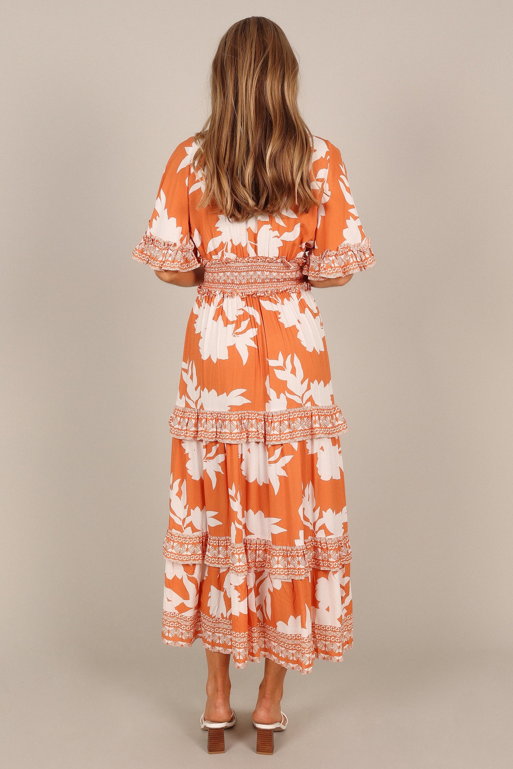 DETAILS Step into style with this gorgeous maxi length dress! Perfectly combining femininity and comfort, it features a v-neckline and short sleeves with sweet ruffle detail. Non functional buttons adorn the bodice while functional buttons run down the front of the skirt.