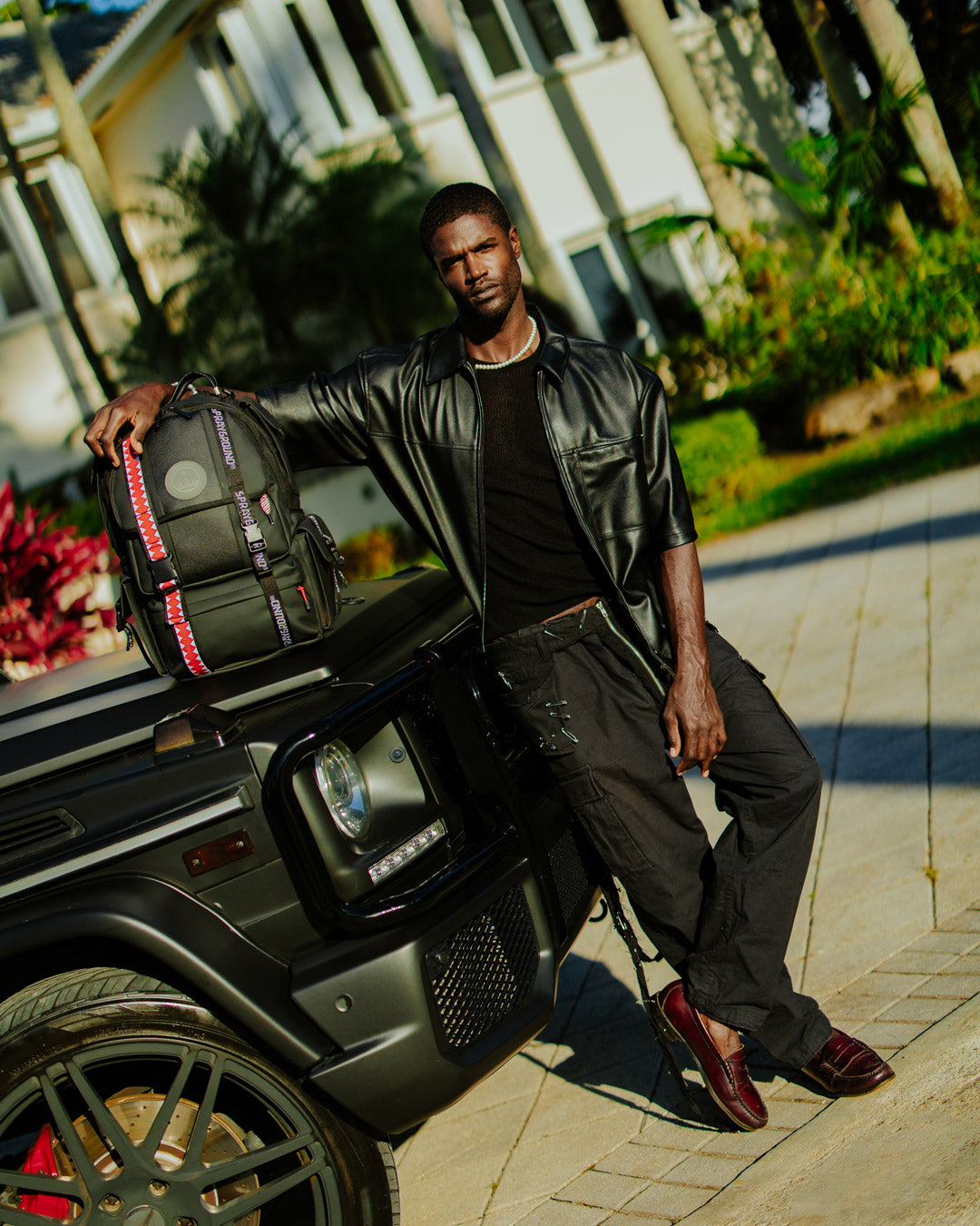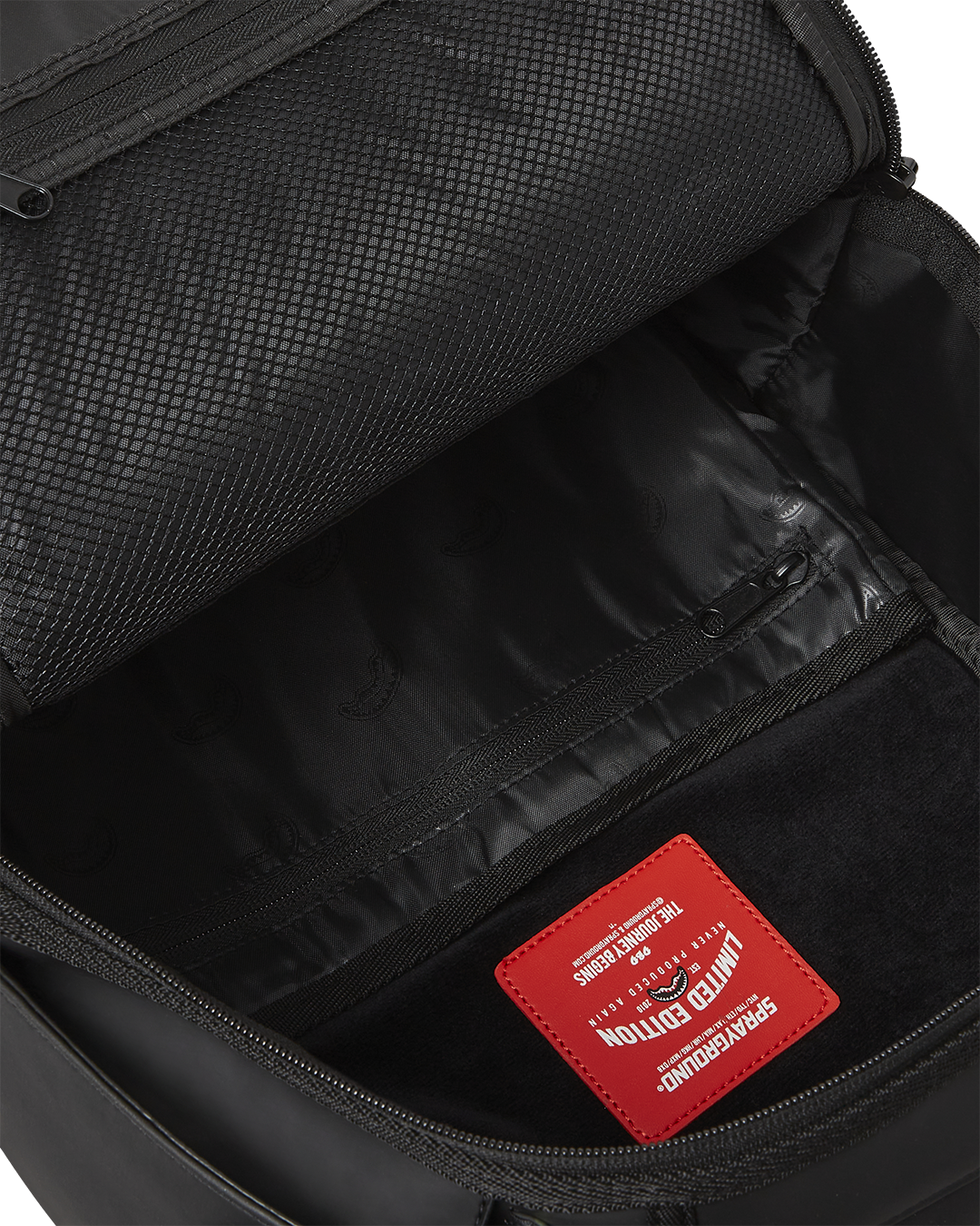 Dimensions: 18' x 6' x 11.5' • Front zipper pocket • Side pockets • Zippered Stash pocket • Separate velour sunglass compartment • Ergonomic mesh back padding • Adjustable Straps for custom sizing • Gold zippers with metal hardware • Metal 'Sprayground Authentic' badge • Slide through back sleeve connects to carry-on luggage to free your hands