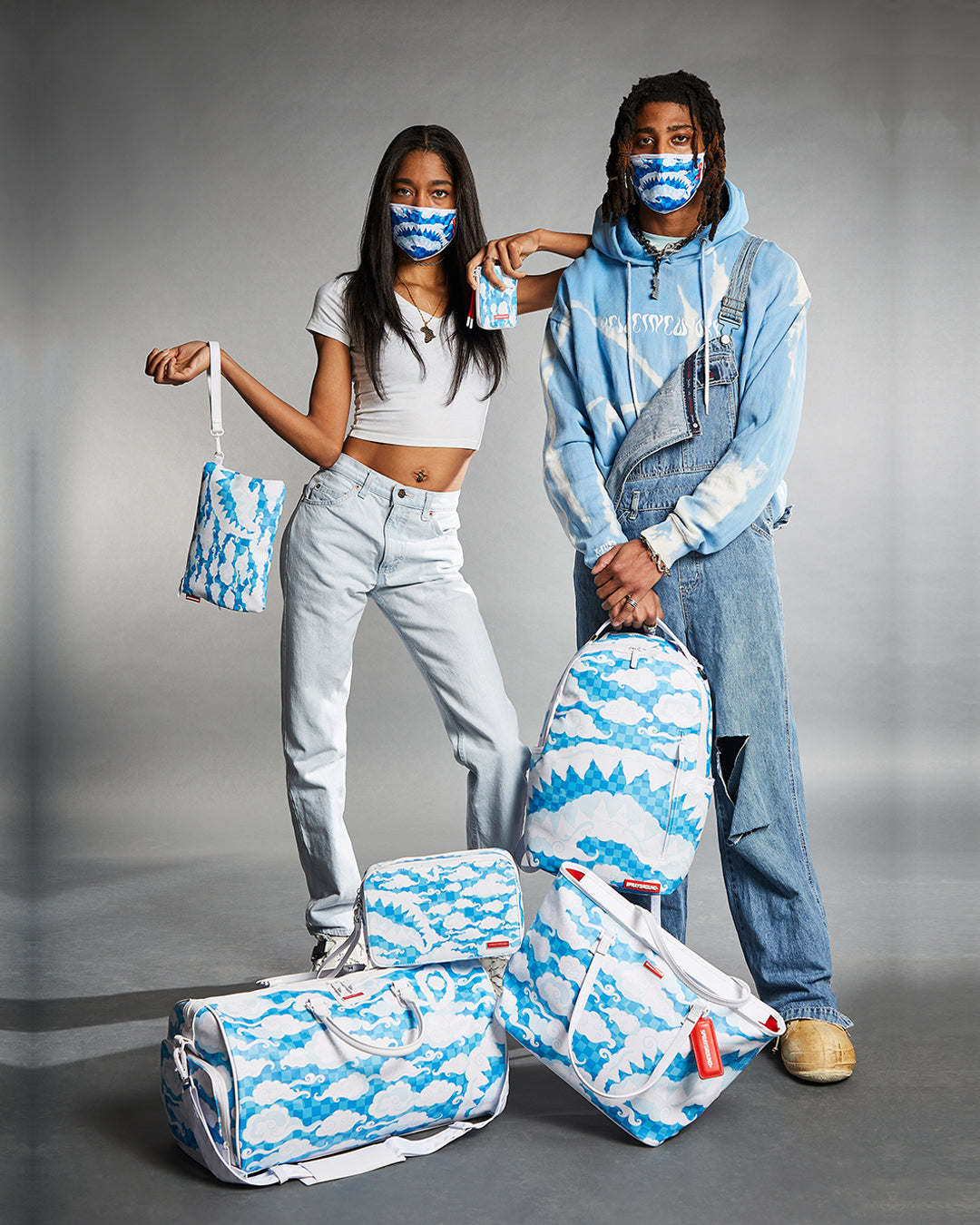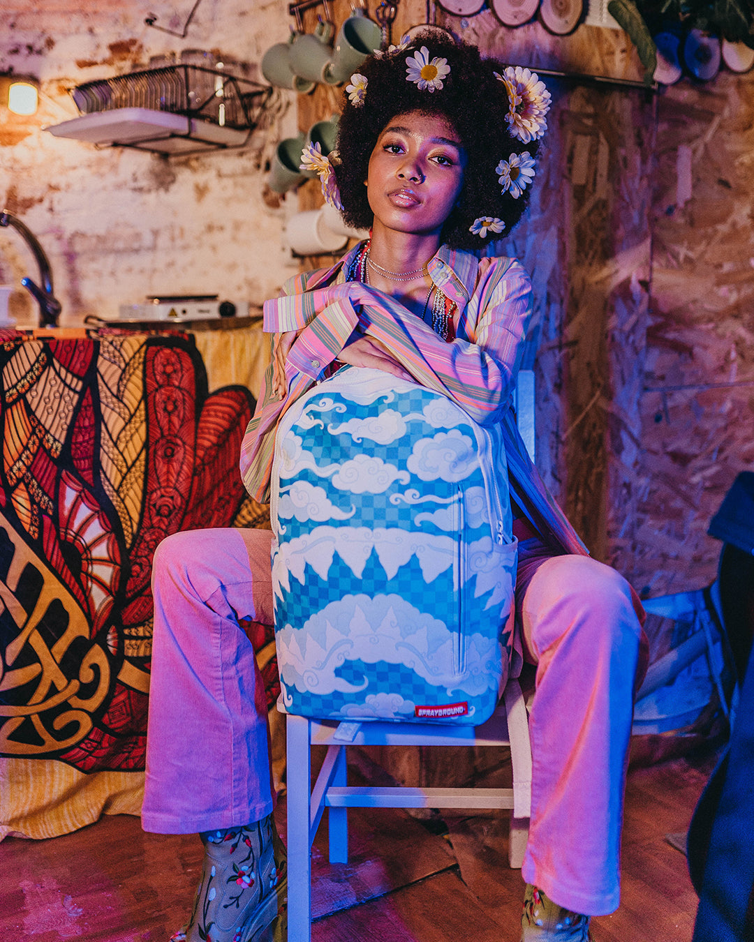 Exterior Dimensions: 18' x 6' x 11.5' • Front zipper pocket • Side pockets • Zippered Stash pocket • Separate velour sunglass compartment • Ergonomic mesh back padding • Adjustable Straps for custom sizing • Gold zippers with metal hardware • Metal 'Sprayground Authentic' badge • Slide through back sleeve connects to carry-on luggage to free your hands