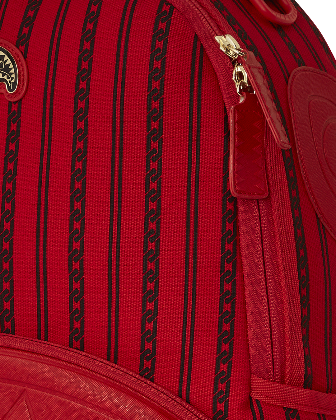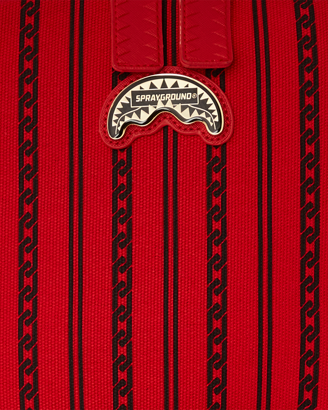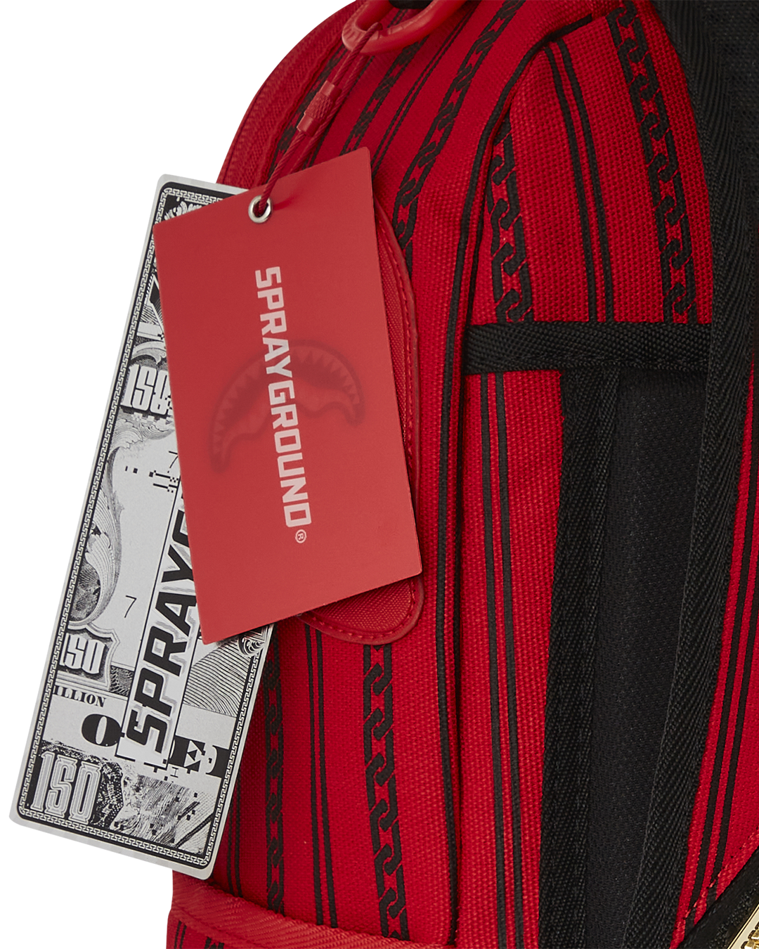Dimensions: 18' x 6' x 11.5' • Front zipper pocket • Side pockets • Zippered Stash pocket • Separate velour sunglass compartment • Ergonomic mesh back padding • Adjustable Straps for custom sizing • Gold zippers with metal hardware • Metal 'Sprayground Authentic' badge • Slide through back sleeve connects to carry-on luggage to free your hands