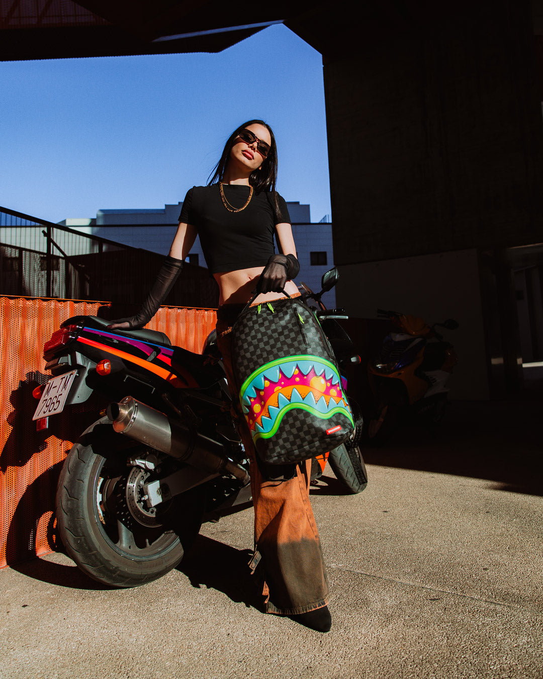 Dimensions: 18' x 6' x 11.5' • Front zipper pocket • Side pockets • Zippered Stash pocket • Separate velour sunglass compartment • Ergonomic mesh back padding • Adjustable Straps for custom sizing • Gold zippers with metal hardware • Metal 'Sprayground Authentic' badge • Slide through back sleeve connects to carry-on luggage to free your hands