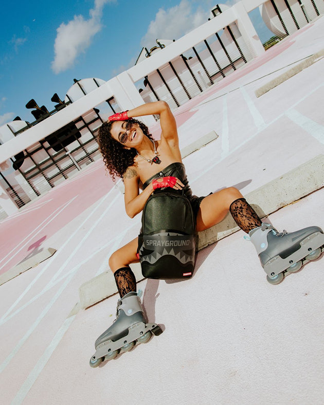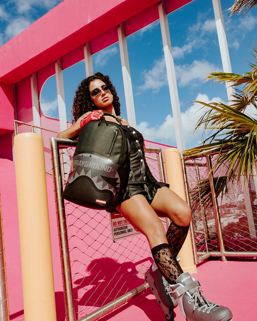 Dimensions: 18' x 6' x 11.5' • Front zipper pocket • Side pockets • Zippered Stash pocket • Separate velour sunglass compartment • Ergonomic mesh back padding • Adjustable Straps for custom sizing • Gold zippers with metal hardware • Metal 'Sprayground Authentic' badge • Slide through back sleeve connects to carry-on luggage to free your hands