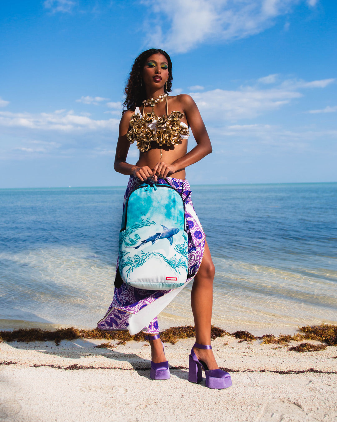 Dimensions: 18' x 6' x 11.5' • Front zipper pocket • Side pockets • Zippered Stash pocket • Separate velour sunglass compartment • Ergonomic mesh back padding • Adjustable Straps for custom sizing • Gold zippers with metal hardware • Metal 'Sprayground Authentic' badge • Slide through back sleeve connects to carry-on luggage to free your hands
