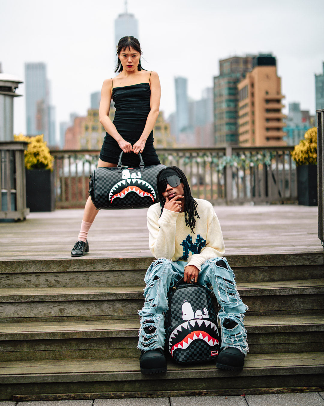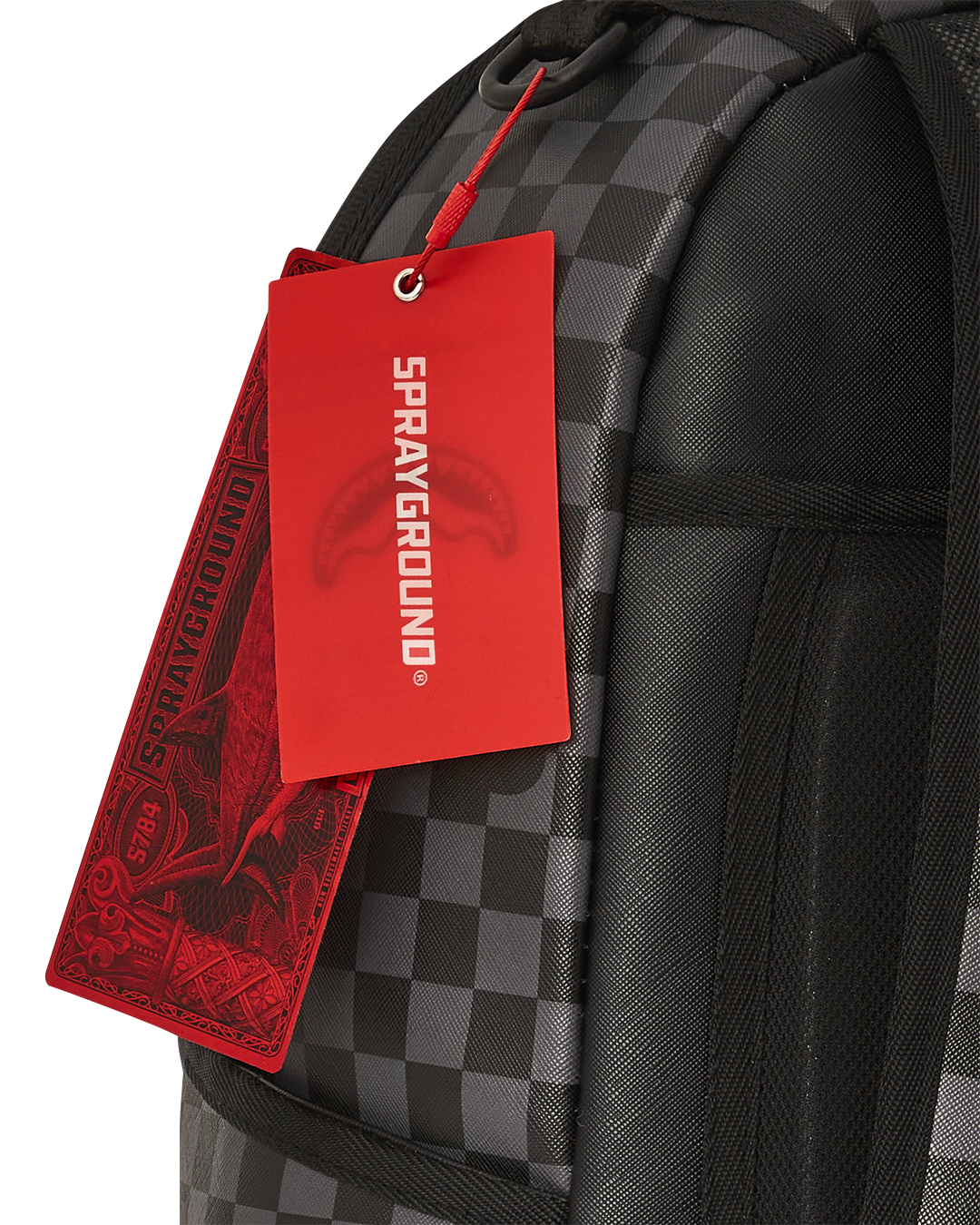 Dimensions: 18' x 6' x 11.5' • Front zipper pocket • Side pockets • Zippered Stash pocket • Separate velour sunglass compartment • Ergonomic mesh back padding • Adjustable Straps for custom sizing • Gold zippers with metal hardware • Metal 'Sprayground Authentic' badge • Slide through back sleeve connects to carry-on luggage to free your hands