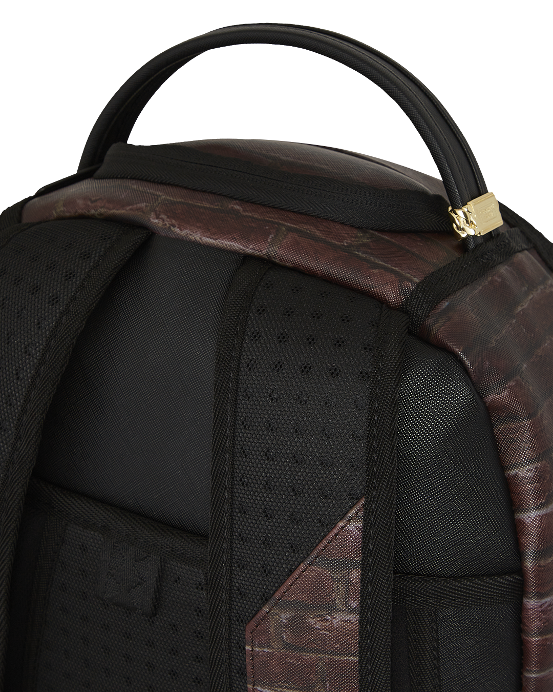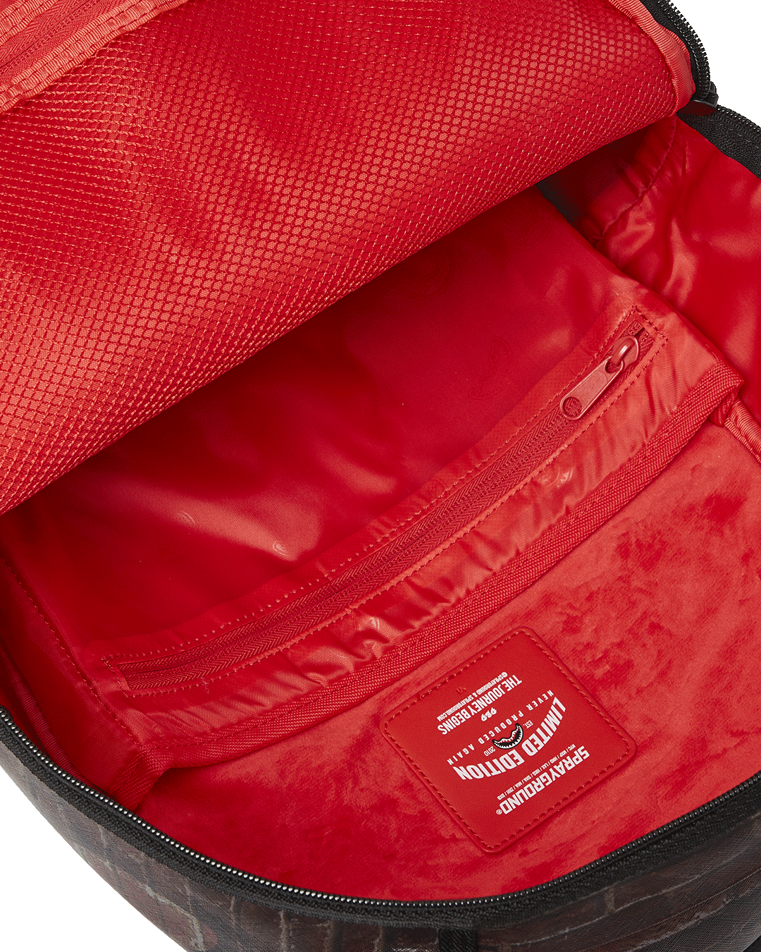 Dimensions: 18' x 6' x 11.5' • Front zipper pocket • Side pockets • Zippered Stash pocket • Separate velour sunglass compartment • Ergonomic mesh back padding • Adjustable Straps for custom sizing • Gold zippers with metal hardware • Metal 'Sprayground Authentic' badge • Slide through back sleeve connects to carry-on luggage to free your hands