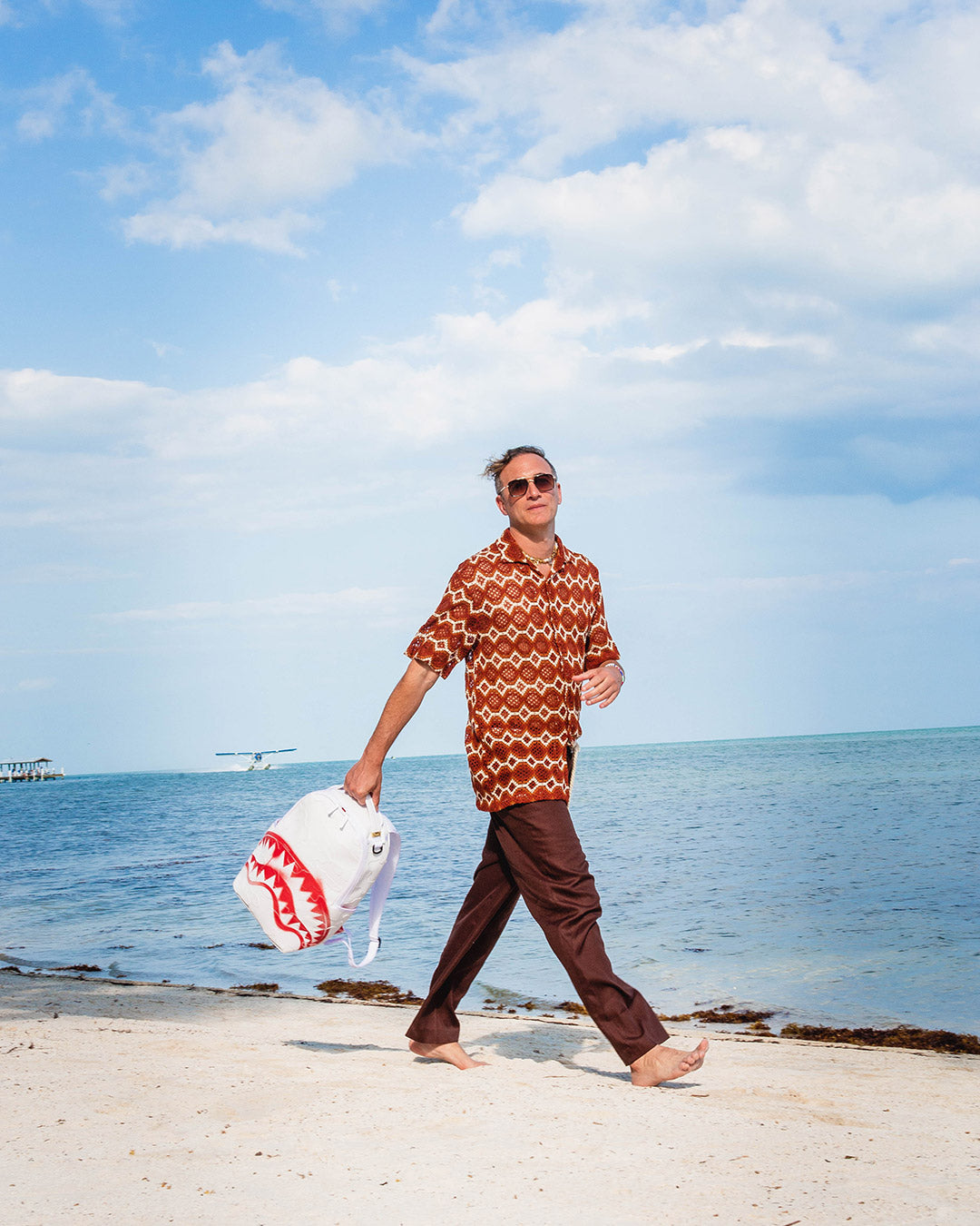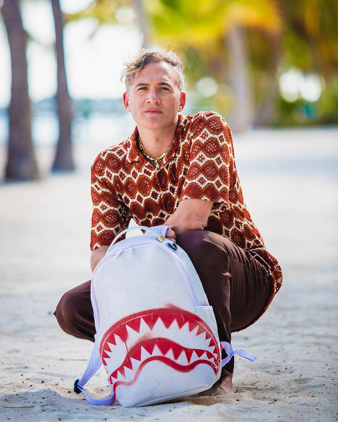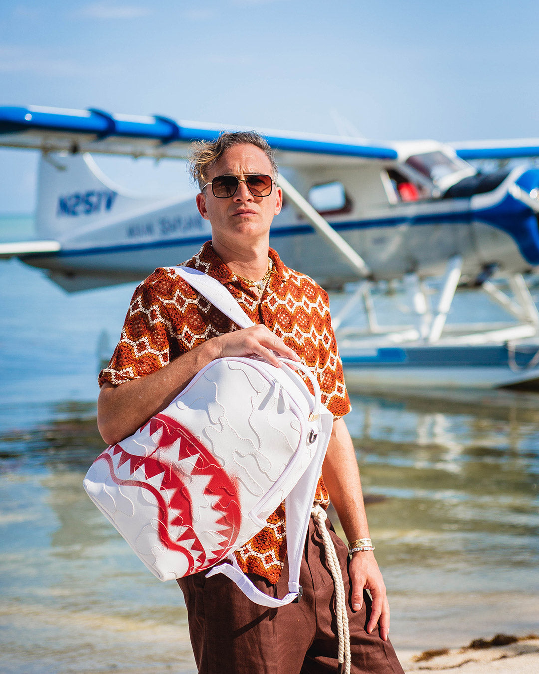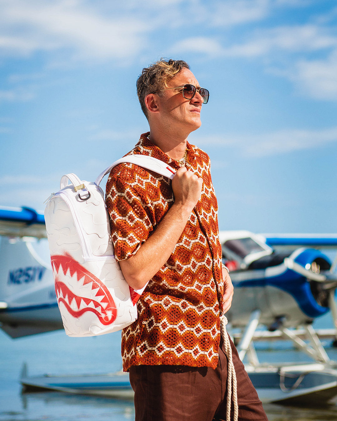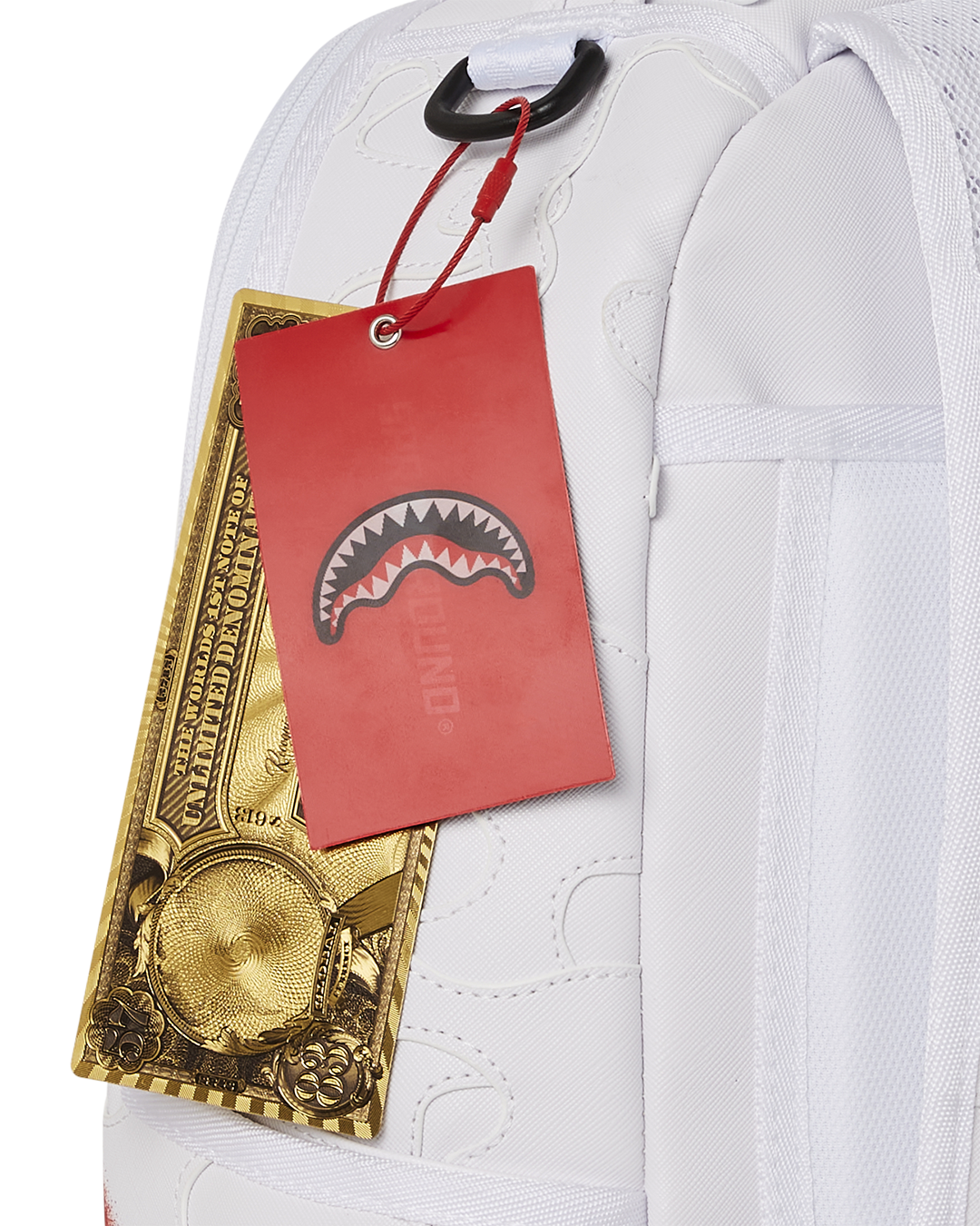 Dimensions: 18' x 6' x 11.5' • Front zipper pocket • Side pockets • Zippered Stash pocket • Separate velour sunglass compartment • Ergonomic mesh back padding • Adjustable Straps for custom sizing • Gold zippers with metal hardware • Metal 'Sprayground Authentic' badge • Slide through back sleeve connects to carry-on luggage to free your hands