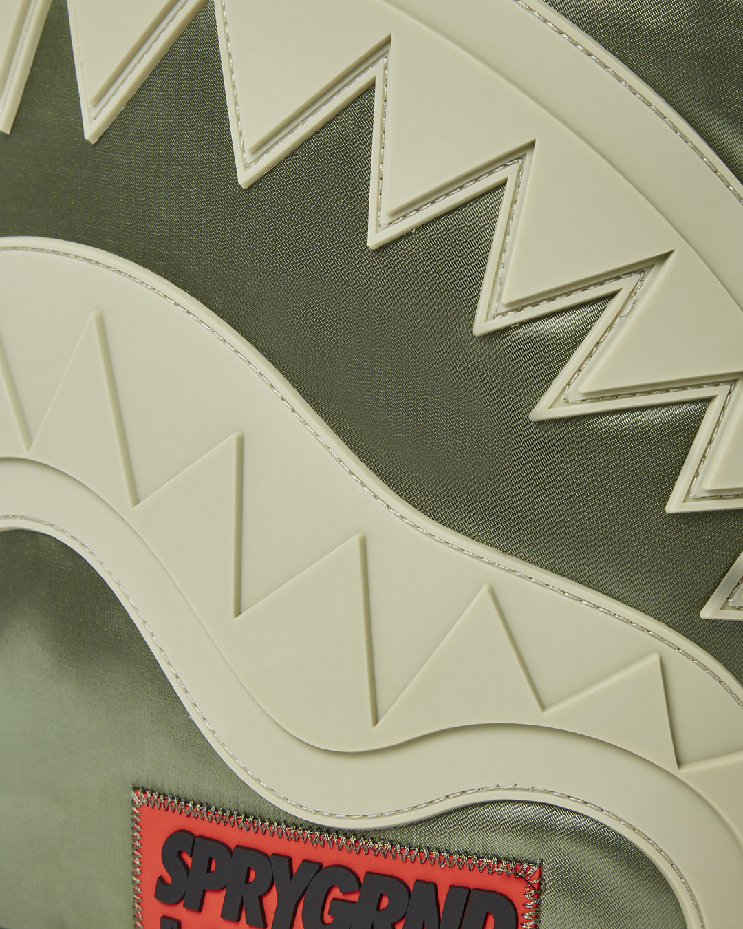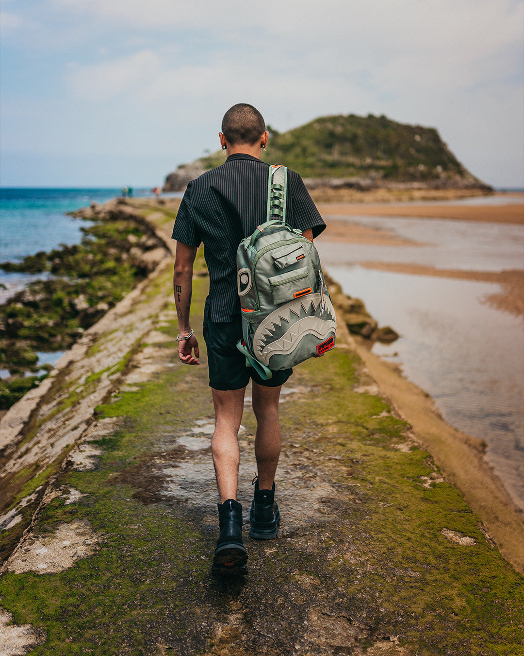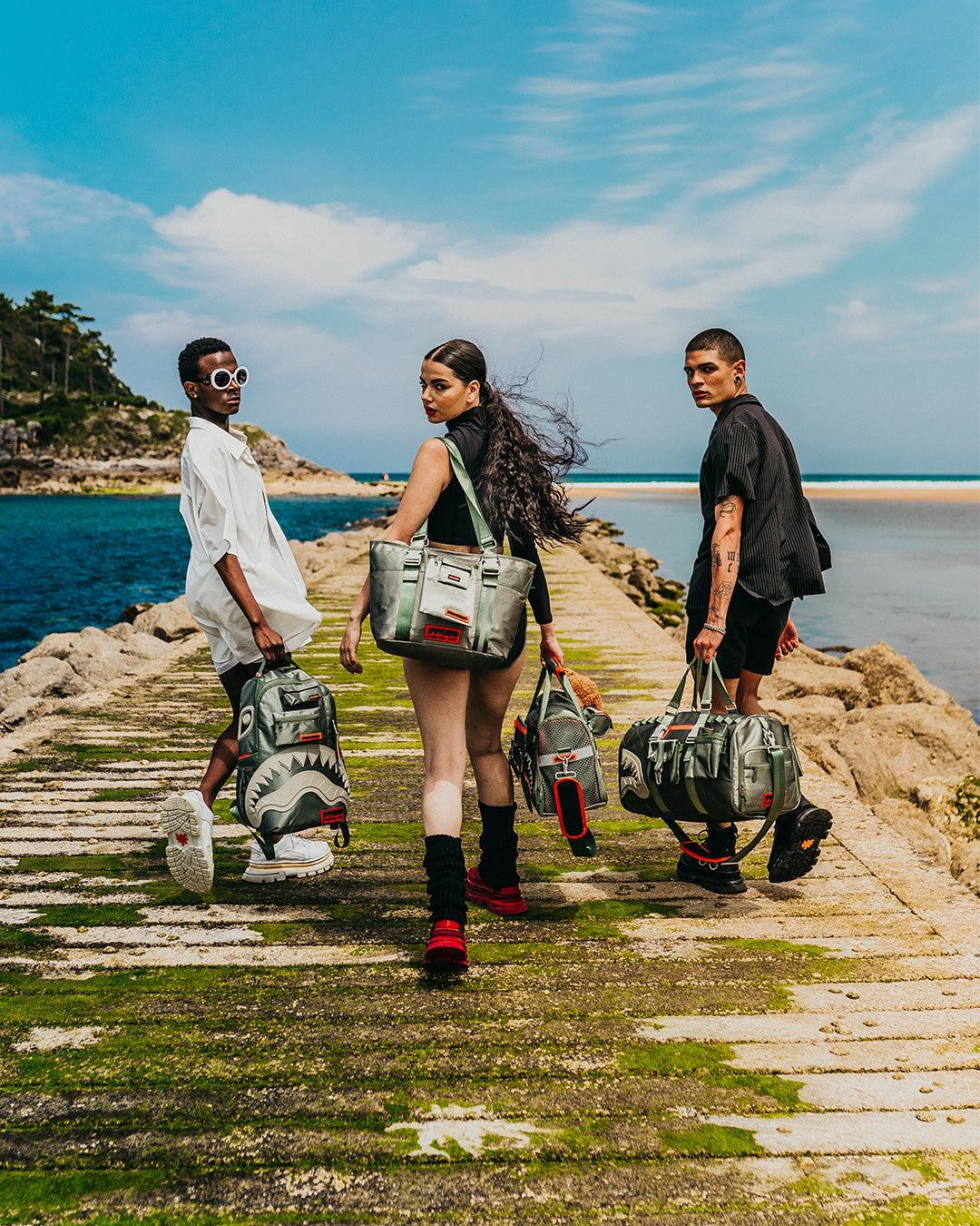 Dimensions: 18' x 6' x 11.5' • Front zipper pocket • Side pockets • Zippered Stash pocket • Separate velour sunglass compartment • Ergonomic mesh back padding • Adjustable Straps for custom sizing • Red zippers with metal hardware • Metal 'Sprayground Authentic' badge • Slide through back sleeve connects to carry-on luggage to free your hands