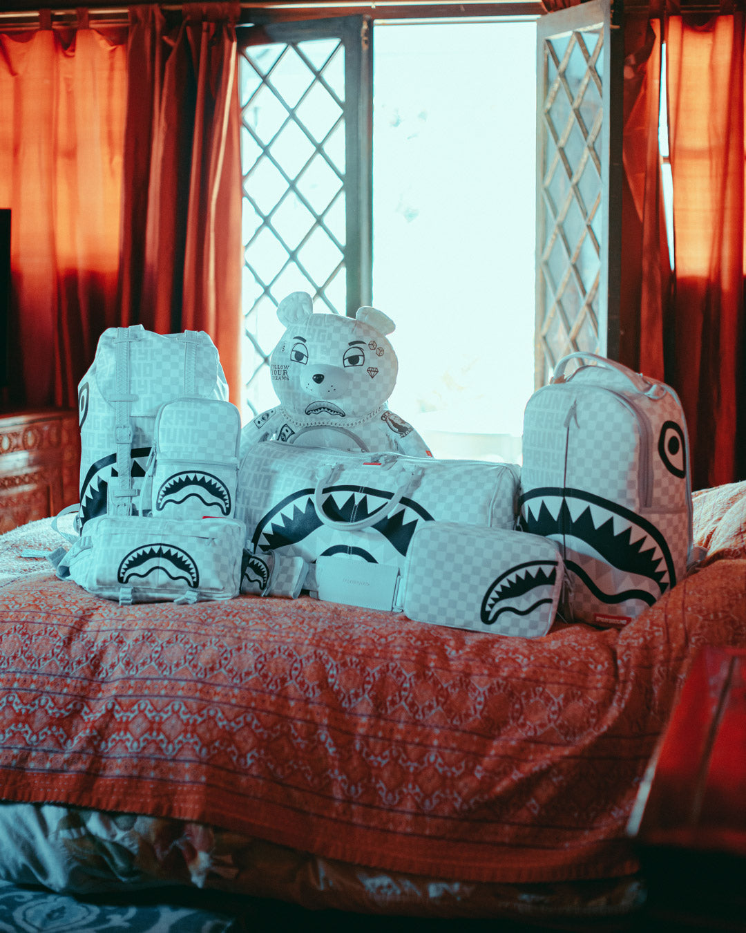 Dimensions: 18' x 6' x 11.5' • Front zipper pocket • Side pockets • Zippered Stash pocket • Separate velour sunglass compartment • Ergonomic mesh back padding • Adjustable Straps for custom sizing • Gold zippers with metal hardware • Metal 'Sprayground Authentic' badge • Slide through back sleeve connects to carry-on luggage to free your hands