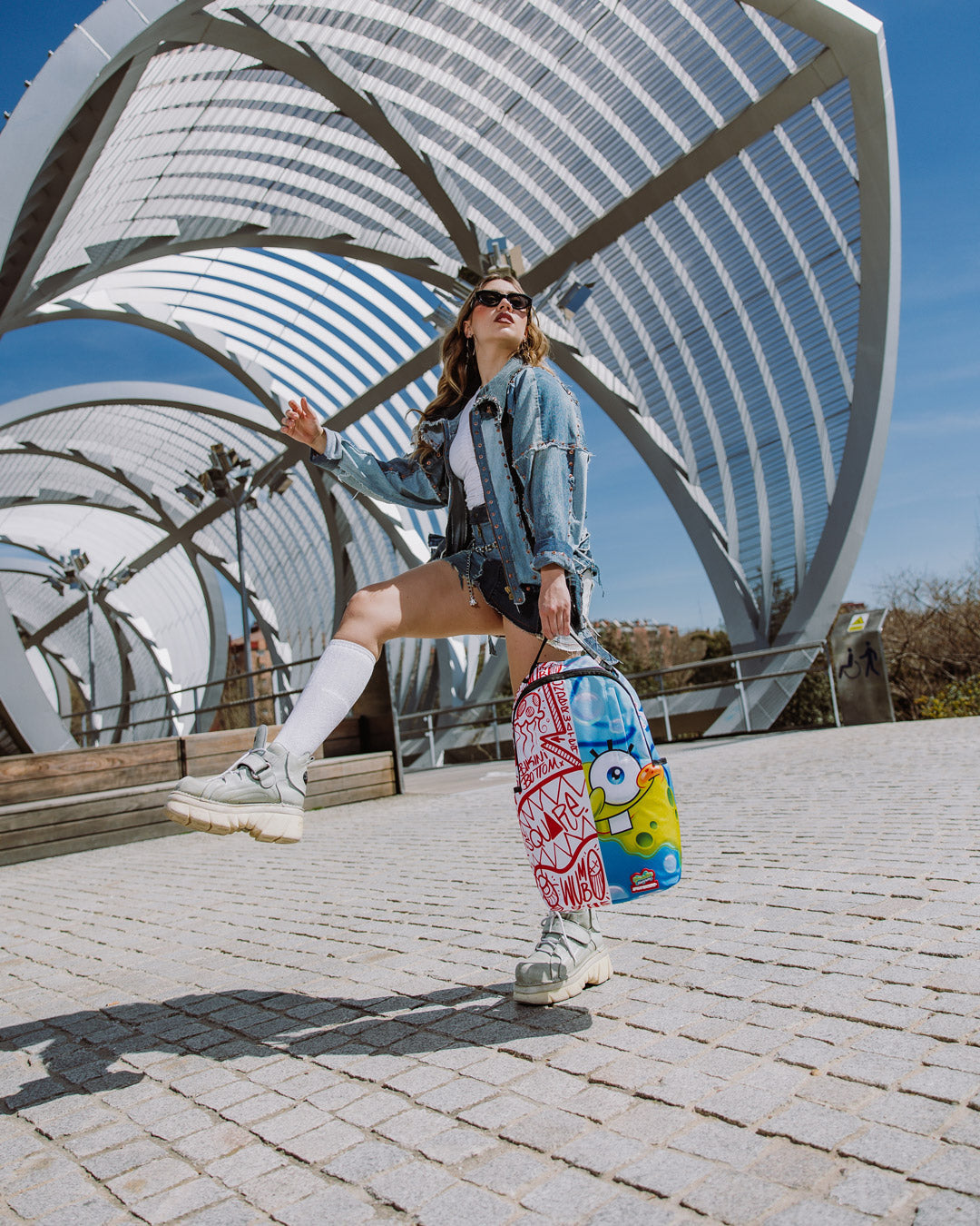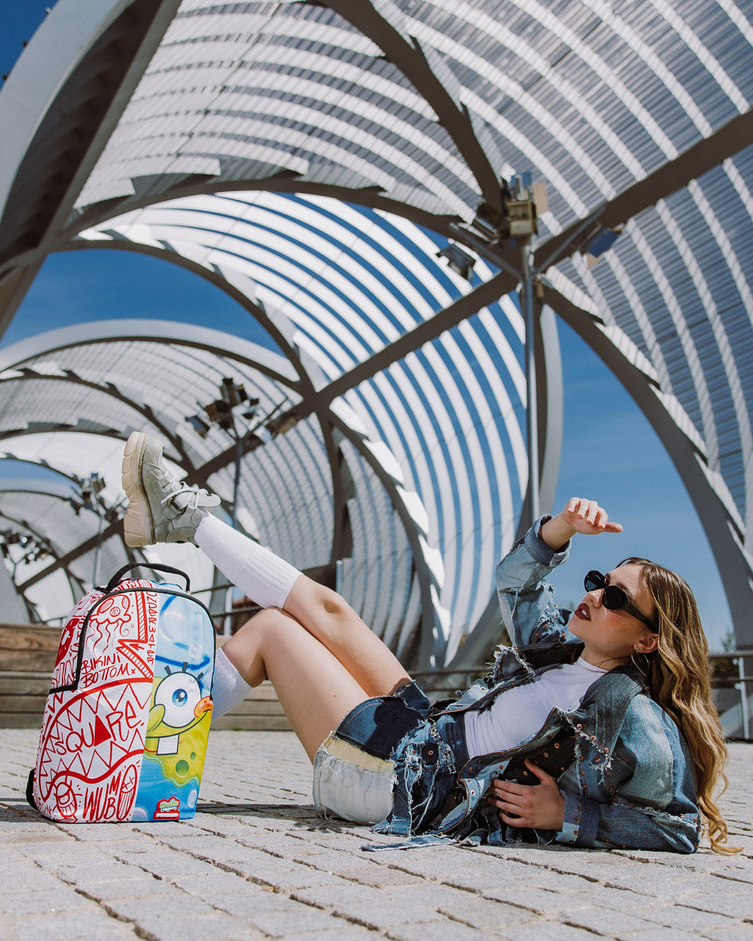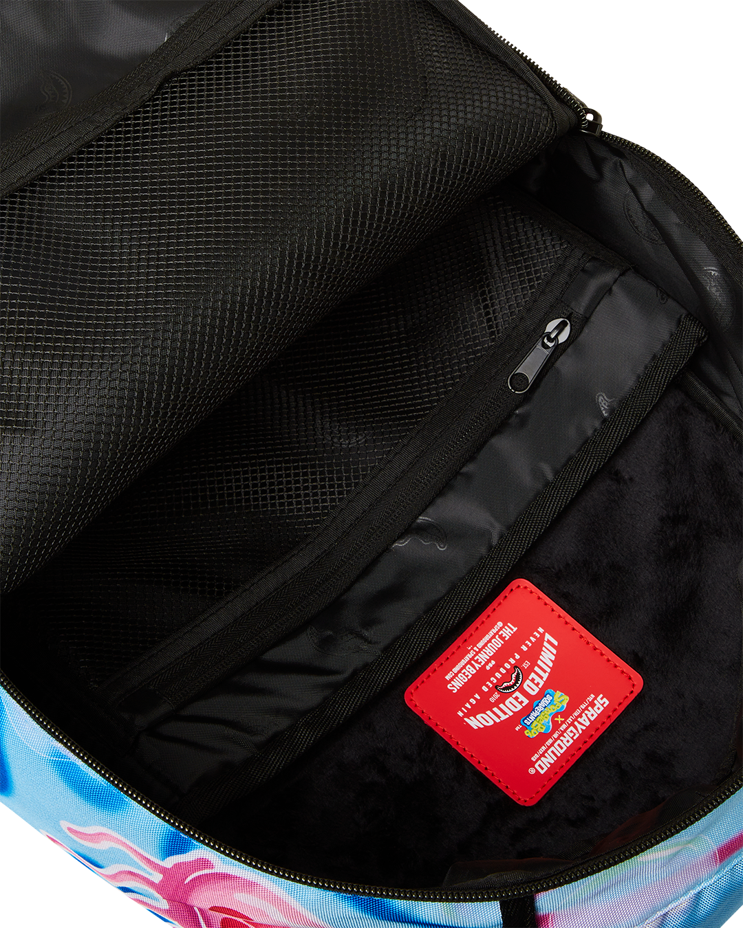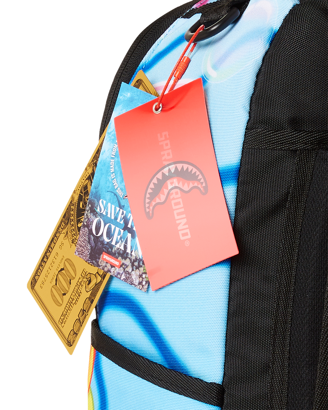Dimensions: 18' x 6' x 11.5' • Front zipper pocket • Side pockets • Zippered Stash pocket • Separate velour sunglass compartment • Ergonomic mesh back padding • Adjustable Straps for custom sizing • Gold zippers with metal hardware • Metal 'Sprayground Authentic' badge • Slide through back sleeve connects to carry-on luggage to free your hands