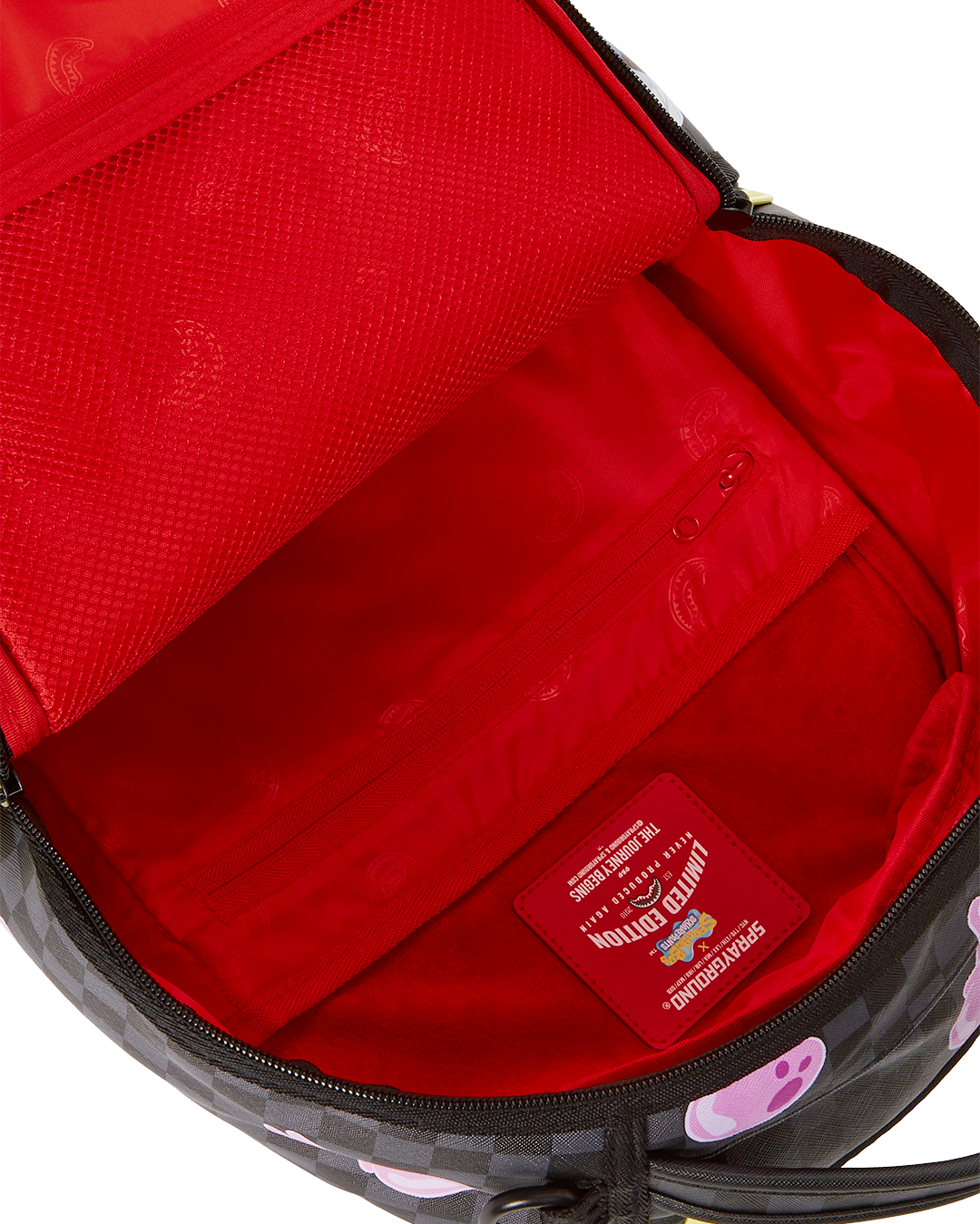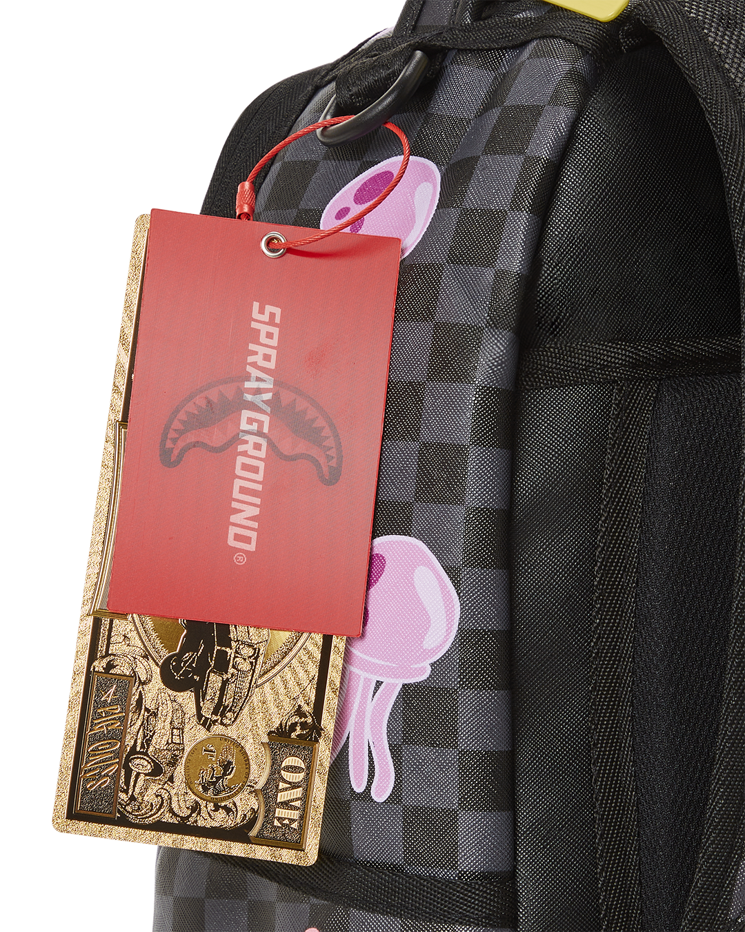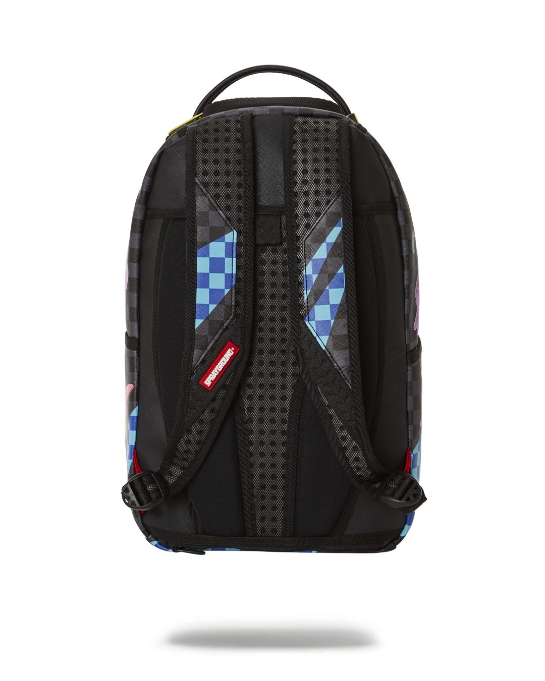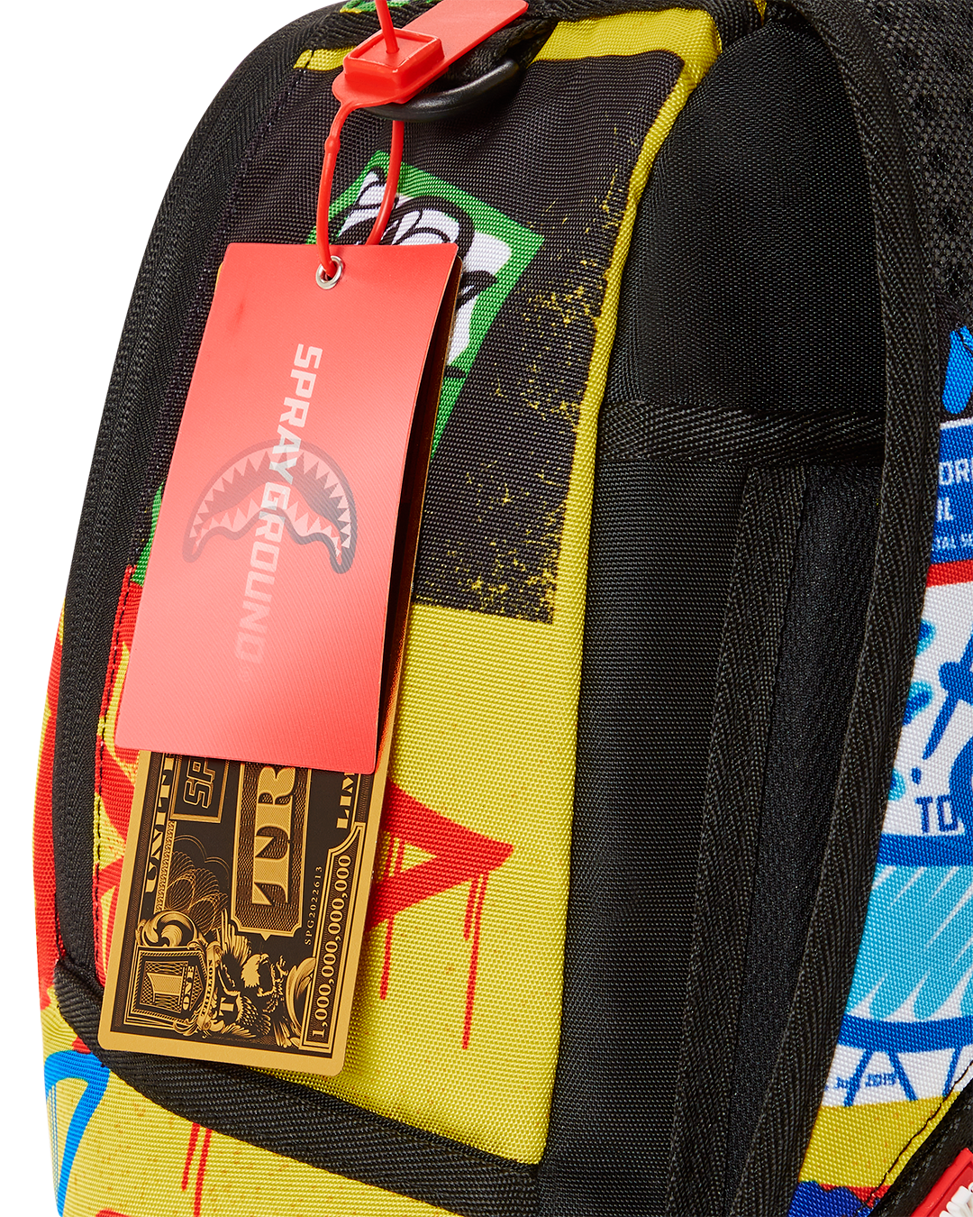 Dimensions: 18' x 6' x 11.5' • Front zipper pocket • Side pockets • Zippered Stash pocket • Separate velour sunglass compartment • Ergonomic mesh back padding • Adjustable Straps for custom sizing • Gold zippers with metal hardware • Metal 'Sprayground Authentic' badge • Slide through back sleeve connects to carry-on luggage to free your hands
