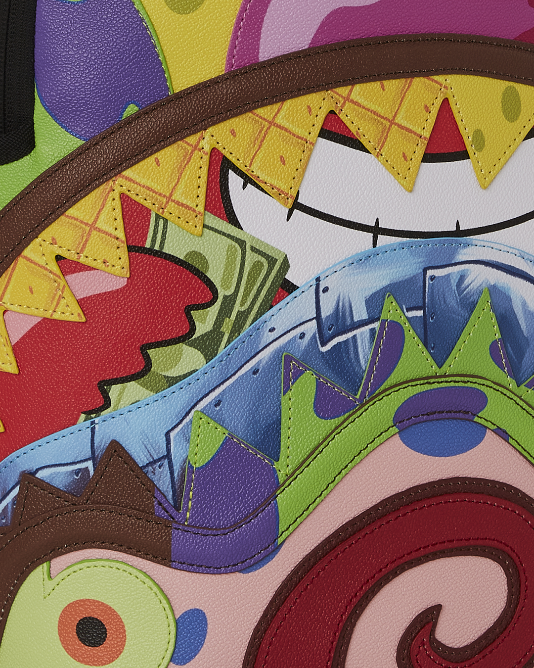 Dimensions: 18' x 6' x 11.5' • Front zipper pocket • Side pockets • Zippered Stash pocket • Separate velour sunglass compartment • Ergonomic mesh back padding • Adjustable Straps for custom sizing • Gold zippers with metal hardware • Metal 'Sprayground Authentic' badge • Slide through back sleeve connects to carry-on luggage to free your hands