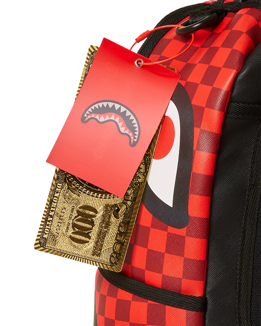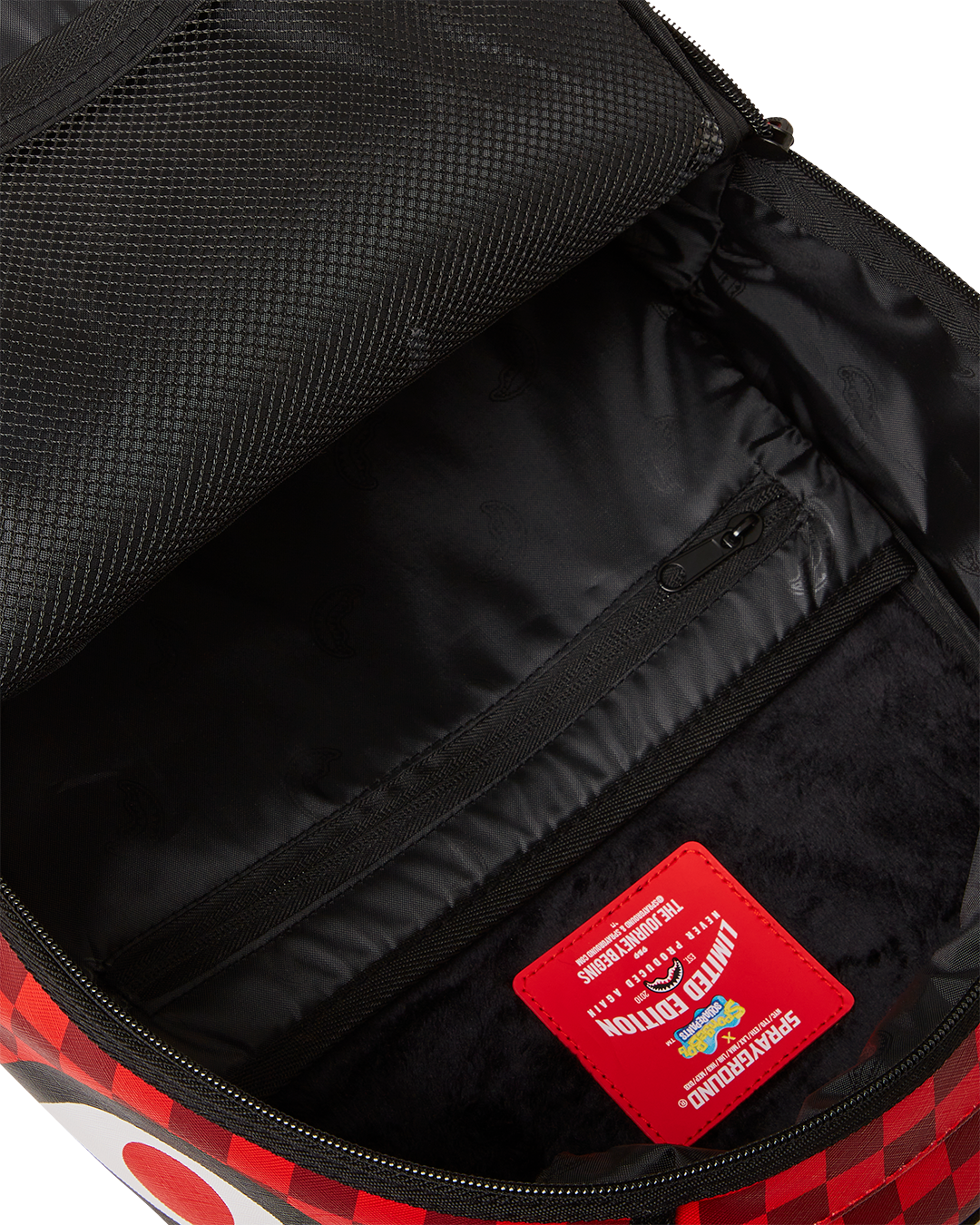 Dimensions: 18' x 6' x 11.5' • Front zipper pocket • Side pockets • Zippered Stash pocket • Separate velour sunglass compartment • Ergonomic mesh back padding • Adjustable Straps for custom sizing • Gold zippers with metal hardware • Metal 'Sprayground Authentic' badge • Slide through back sleeve connects to carry-on luggage to free your hands