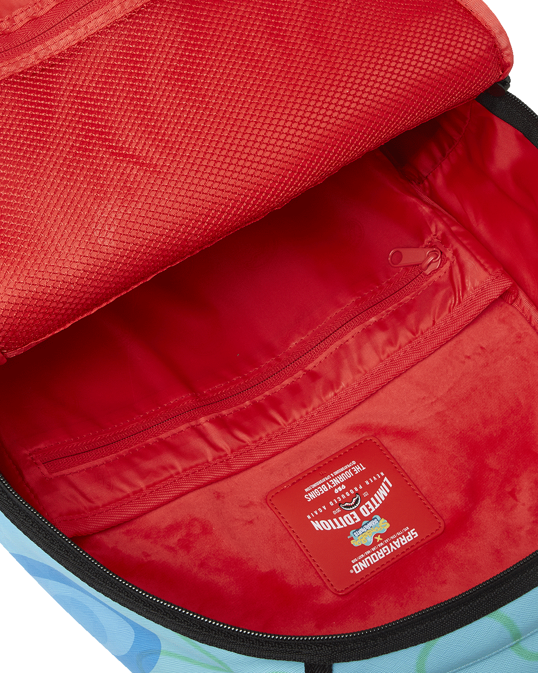 Dimensions: 18' x 6' x 11.5' • Front zipper pocket • Side pockets • Zippered Stash pocket • Separate velour sunglass compartment • Ergonomic mesh back padding • Adjustable Straps for custom sizing • Gold zippers with metal hardware • Metal 'Sprayground Authentic' badge • Slide through back sleeve connects to carry-on luggage to free your hands