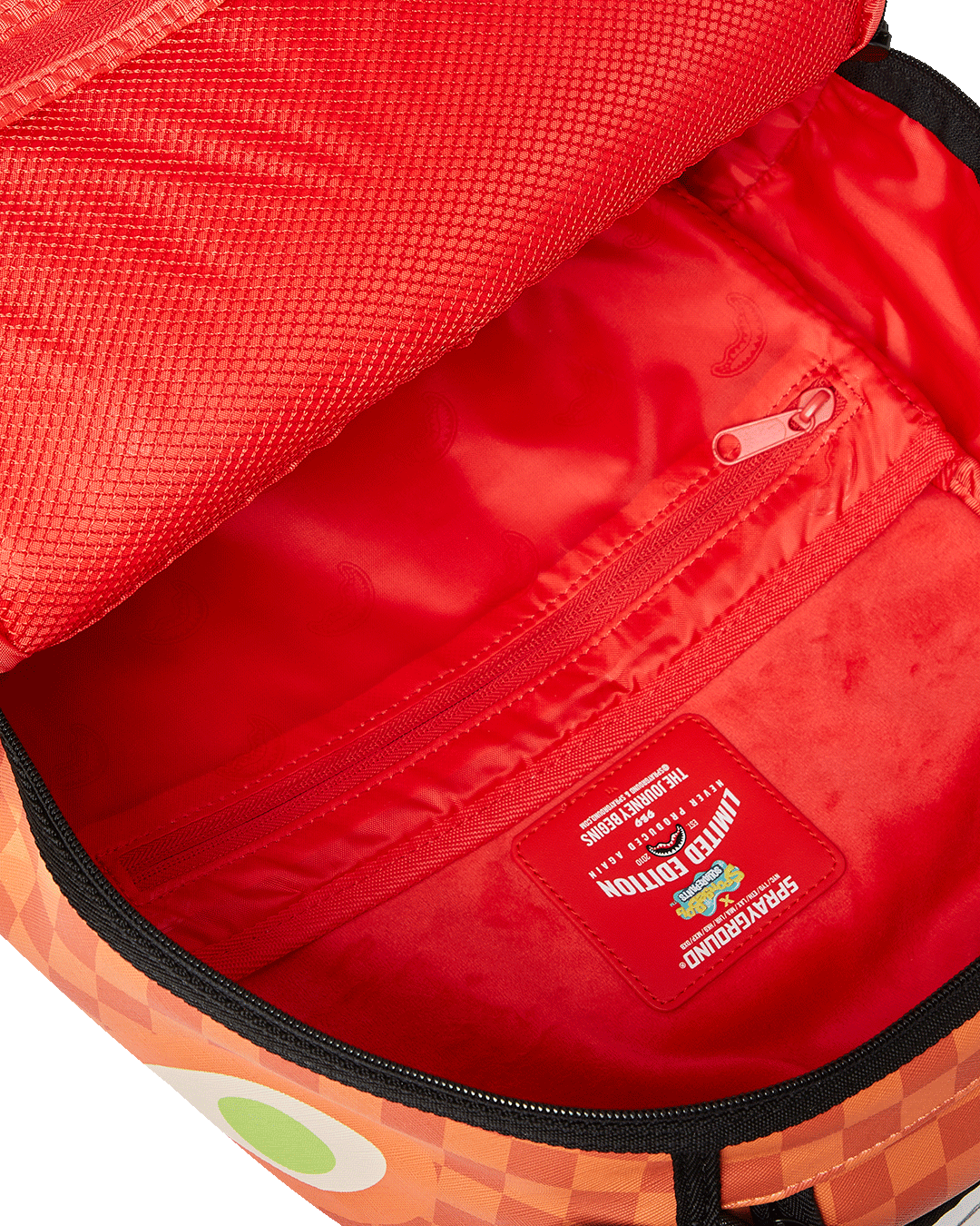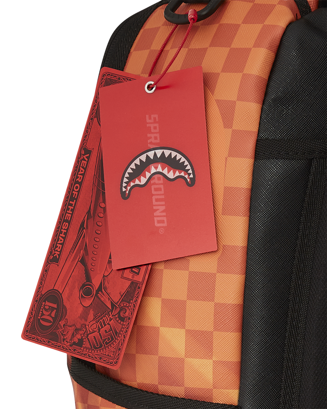 Dimensions: 18' x 6' x 11.5' • Front zipper pocket • Side pockets • Zippered Stash pocket • Separate velour sunglass compartment • Ergonomic mesh back padding • Adjustable Straps for custom sizing • Gold zippers with metal hardware • Metal 'Sprayground Authentic' badge • Slide through back sleeve connects to carry-on luggage to free your hands