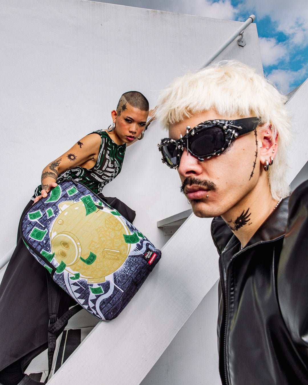 Dimensions: 18' x 6' x 11.5' • Front zipper pocket • Side pockets • Zippered Stash pocket • Separate velour sunglass compartment • Ergonomic mesh back padding • Adjustable Straps for custom sizing • Gold zippers with metal hardware • Metal 'Sprayground Authentic' badge • Slide through back sleeve connects to carry-on luggage to free your hands