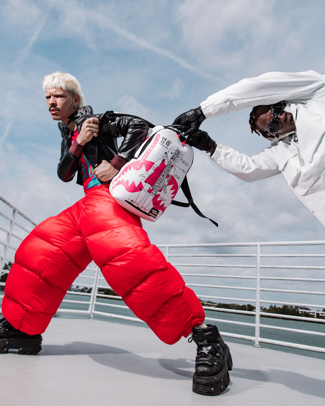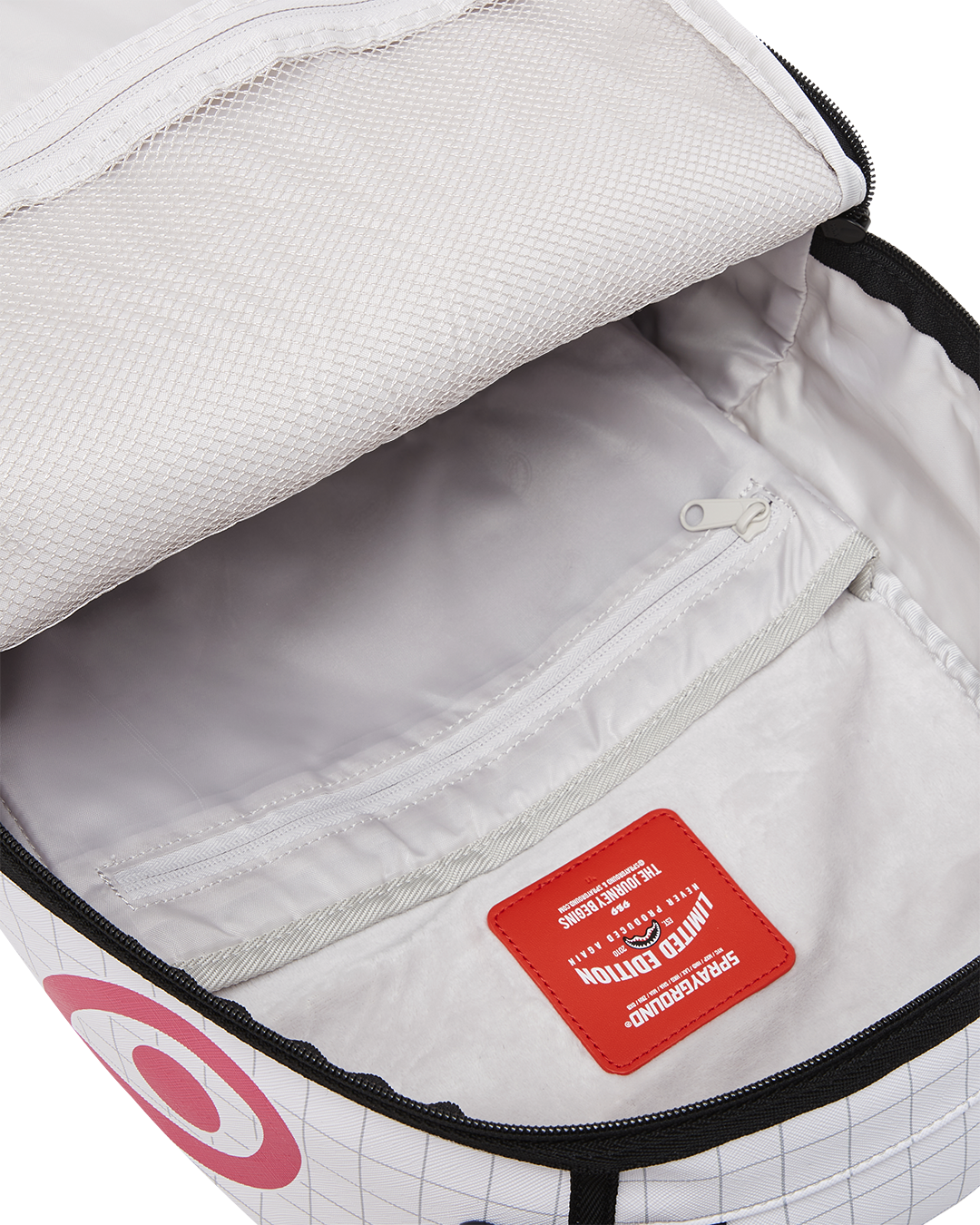 Dimensions: 18' x 6' x 11.5' • Front zipper pocket • Side pockets • Zippered Stash pocket • Separate velour sunglass compartment • Ergonomic mesh back padding • Adjustable Straps for custom sizing • Gold zippers with metal hardware • Metal 'Sprayground Authentic' badge • Slide through back sleeve connects to carry-on luggage to free your hands