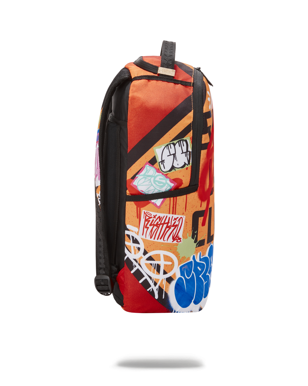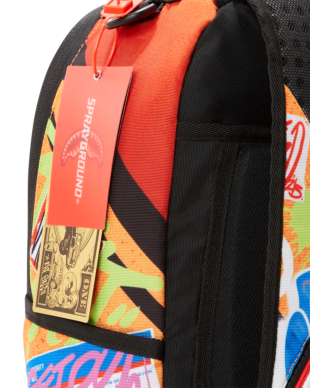 ExteriorDimensions: 18' x 6' x 11.5' • Front zipper pocket • Side pockets • Zippered Stash pocket • Separate velour sunglass compartment • Ergonomic mesh back padding • Adjustable Straps for custom sizing • Green zippers with metal hardware • Metal 'Sprayground Authentic' badge • Slide through back sleeve connects to carry on luggage to free your hands
