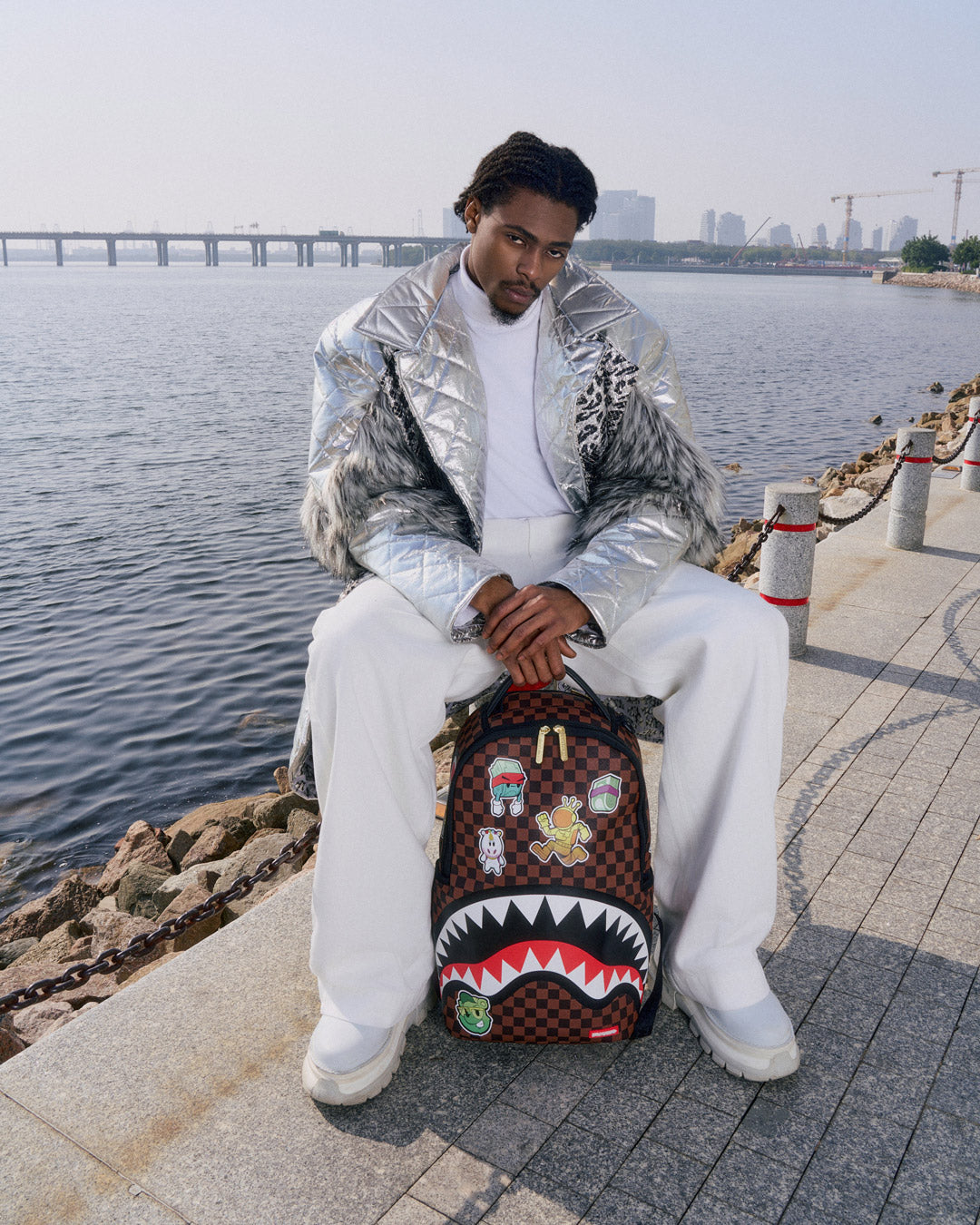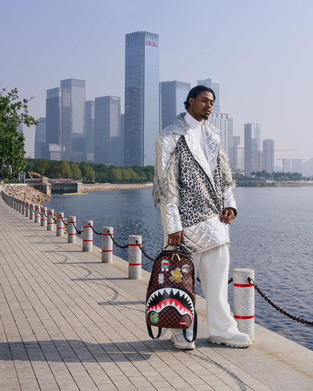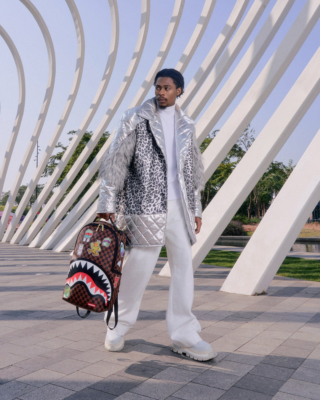 Dimensions: 18' x 6' x 11.5' • Front zipper pocket • Side pockets • Zippered Stash pocket • Separate velour sunglass compartment • Ergonomic mesh back padding • Adjustable Straps for custom sizing • Gold zippers with metal hardware • Metal 'Sprayground Authentic' badge • Slide through back sleeve connects to carry-on luggage to free your hands