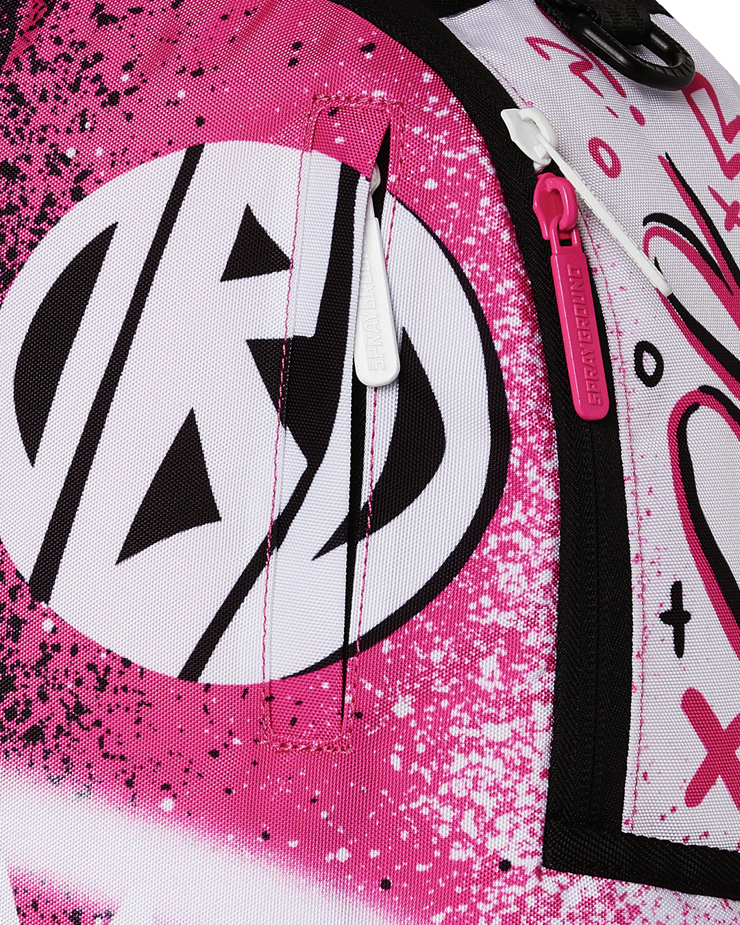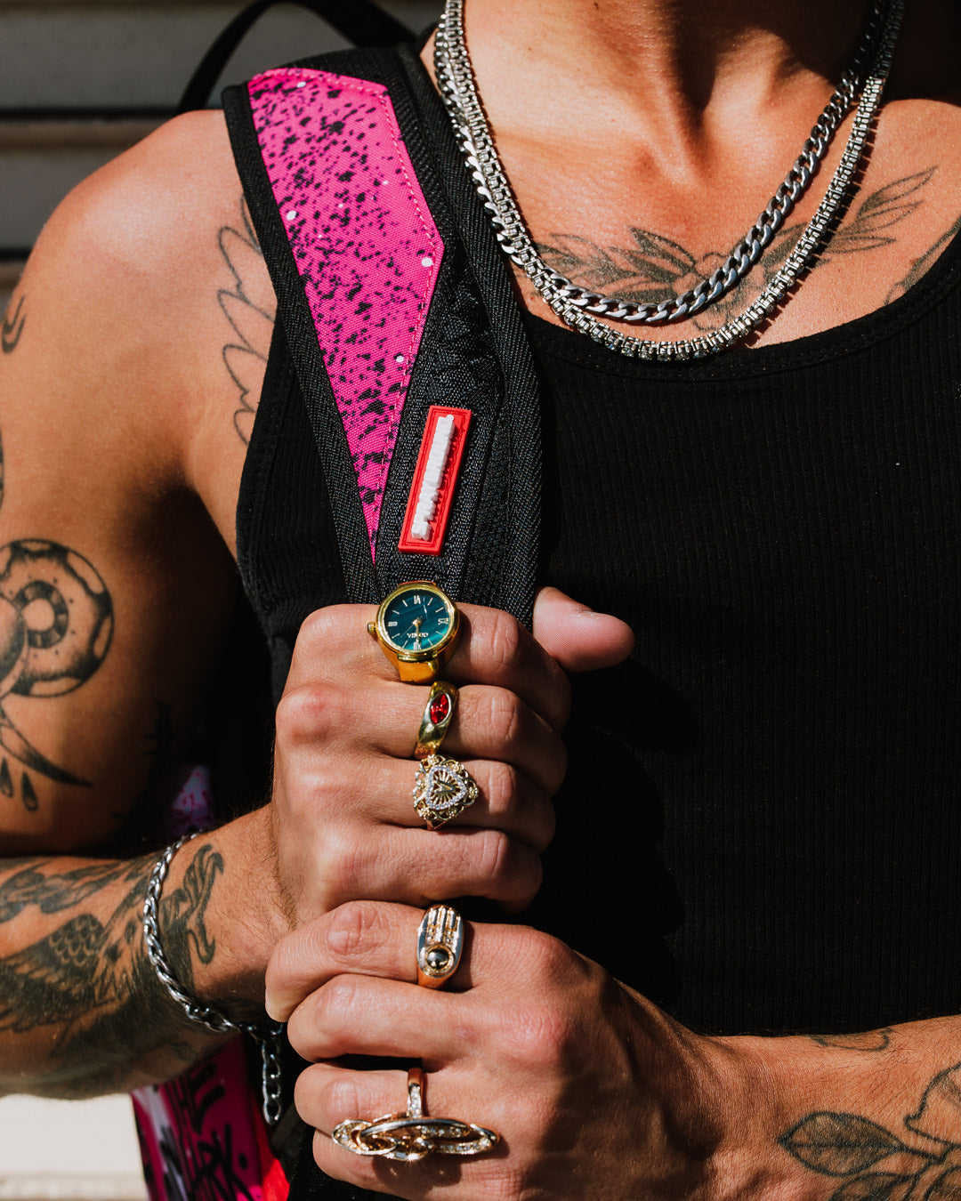 Dimensions: 18' x 6' x 11.5' • Front zipper pocket • Side pockets • Zippered Stash pocket • Separate velour sunglass compartment • Ergonomic mesh back padding • Adjustable Straps for custom sizing • Gold zippers with metal hardware • Metal 'Sprayground Authentic' badge • Slide through back sleeve connects to carry-on luggage to free your hands