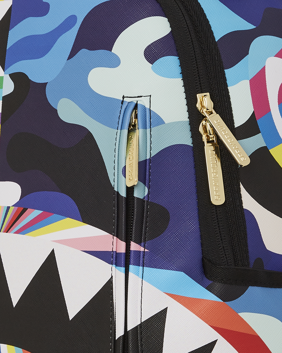 Dimensions: 18' x 6' x 11.5' • Front zipper pocket • Side pockets • Zippered Stash pocket • Separate velour sunglass compartment • Ergonomic mesh back padding • Adjustable Straps for custom sizing • Gold zippers with metal hardware • Metal 'Sprayground Authentic' badge • Slide through back sleeve connects to carry-on luggage to free your hands