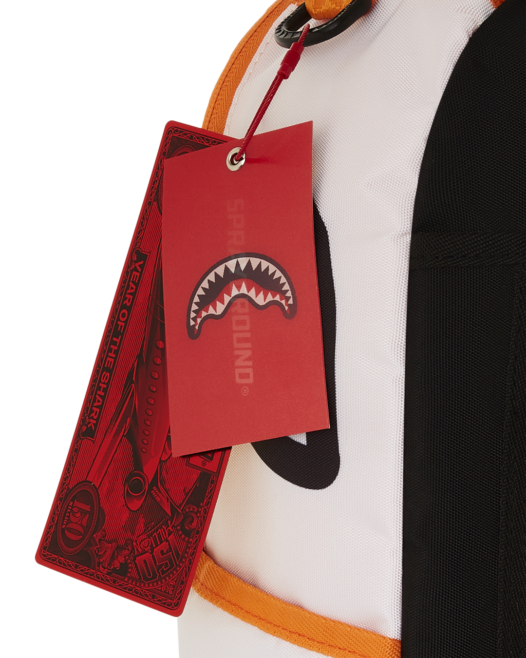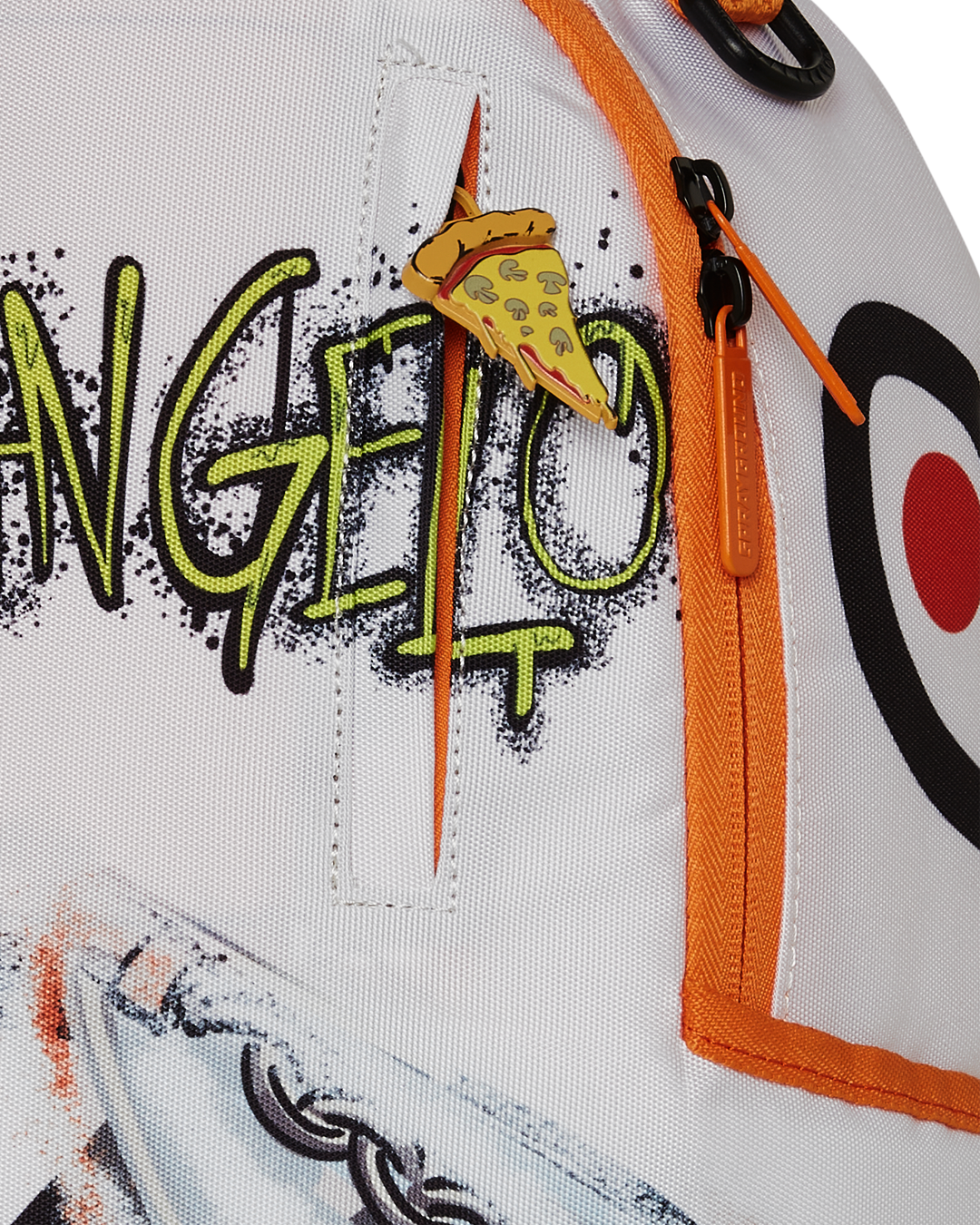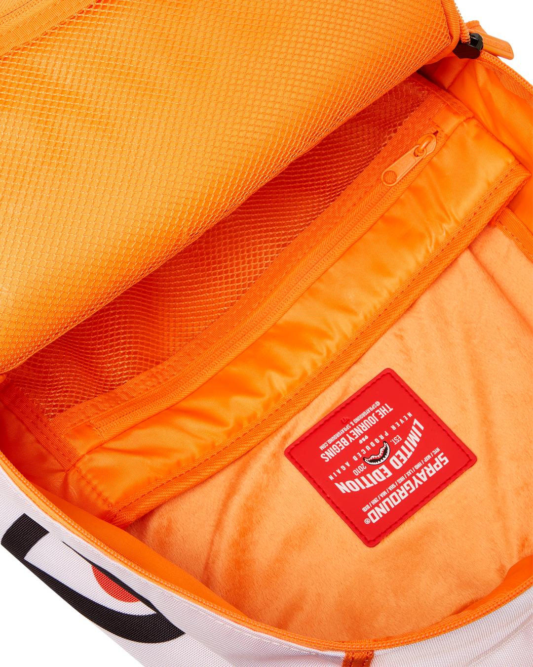 Dimensions: 18' x 6' x 11.5' • Front zipper pocket • Side pockets • Zippered Stash pocket • Separate velour sunglass compartment • Ergonomic mesh back padding • Adjustable Straps for custom sizing • Gold zippers with metal hardware • Metal 'Sprayground Authentic' badge • Slide through back sleeve connects to carry-on luggage to free your hands