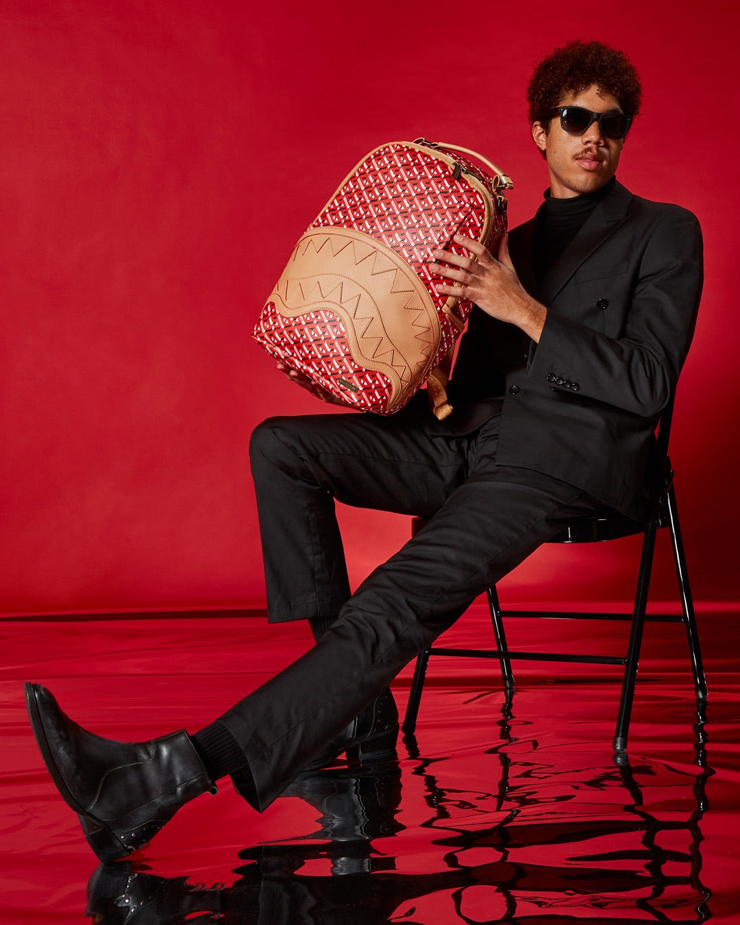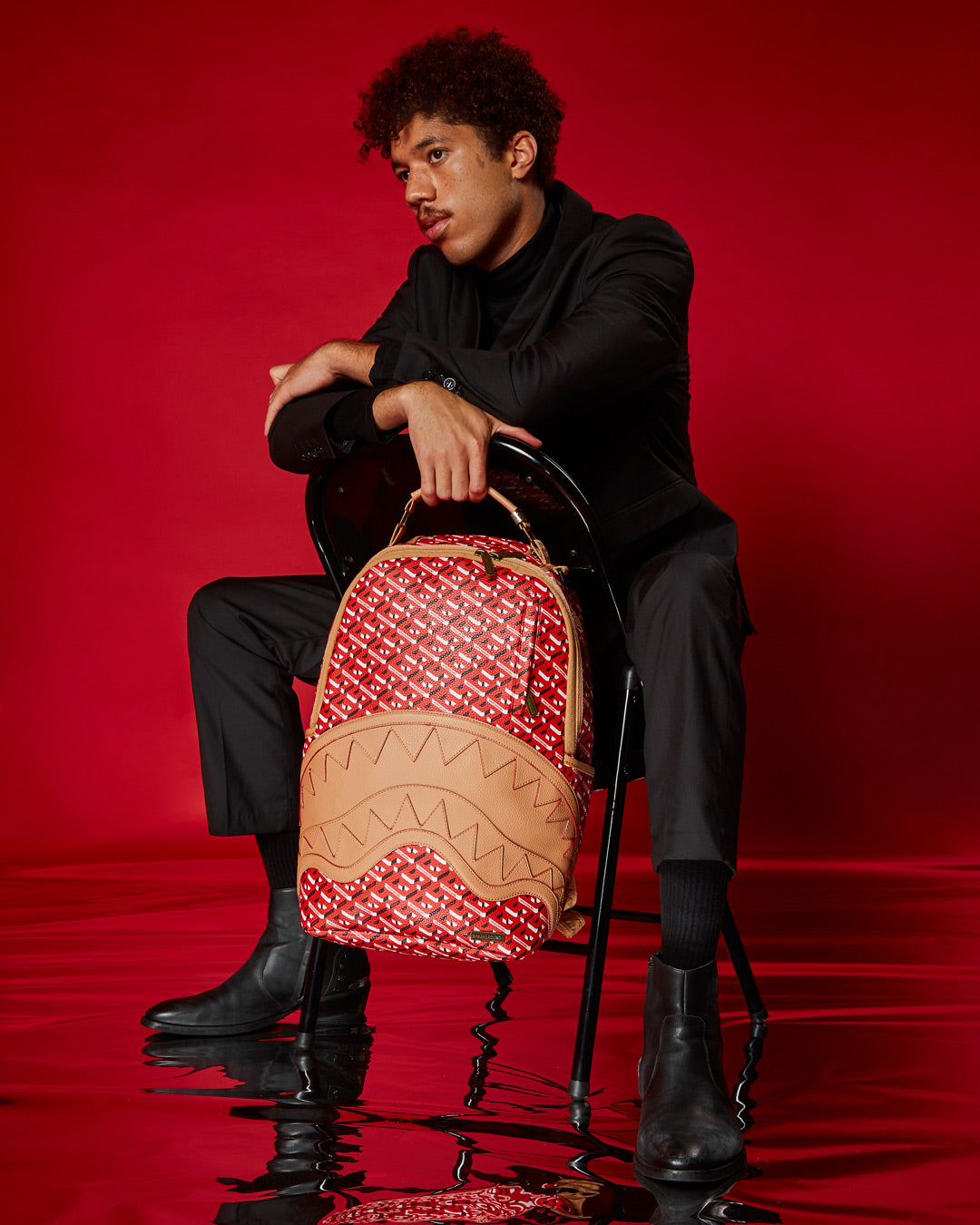 Dimensions: 18' x 6' x 11.5' • Front zipper pocket • Side pockets • Zippered Stash pocket • Separate velour sunglass compartment • Ergonomic mesh back padding • Adjustable Straps for custom sizing • Gold zippers with metal hardware • Metal 'Sprayground Authentic' badge • Slide through back sleeve connects to carry-on luggage to free your hands