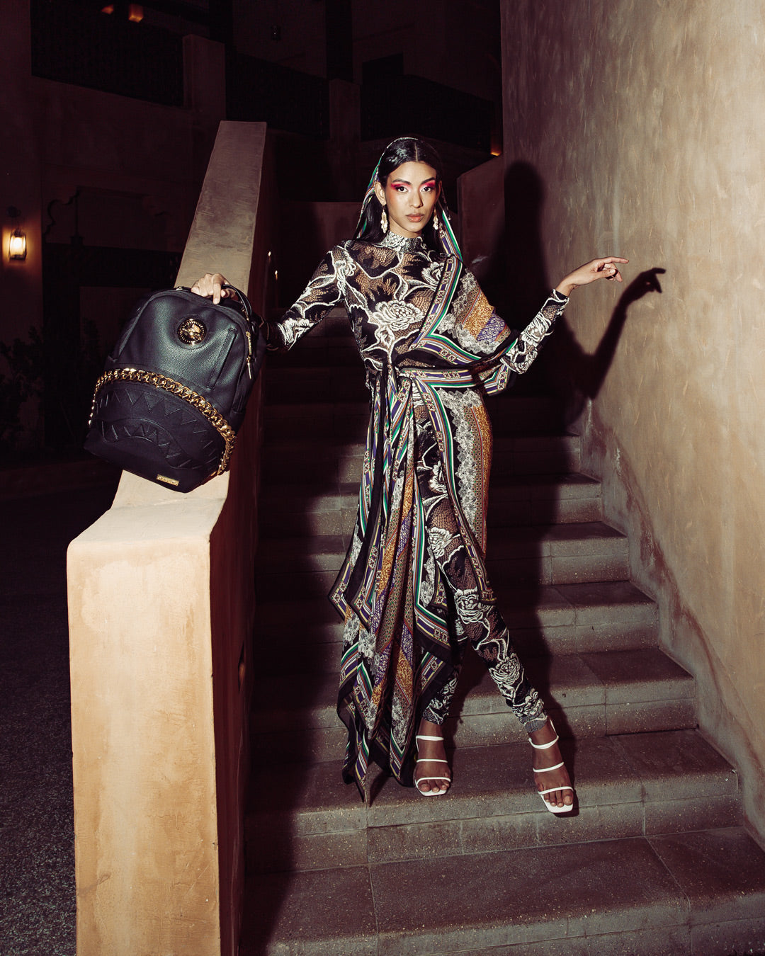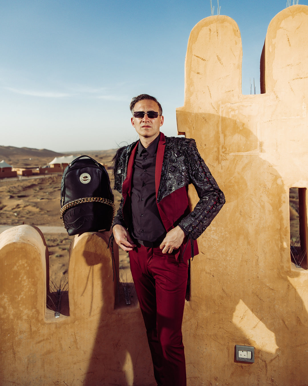 Dimensions: 18' x 6' x 11.5' • Front zipper pocket • Side pockets • Zippered Stash pocket • Separate velour sunglass compartment • Ergonomic mesh back padding • Adjustable Straps for custom sizing • Gold zippers with metal hardware • Metal 'Sprayground Authentic' badge • Slide through back sleeve connects to carry-on luggage to free your hands
