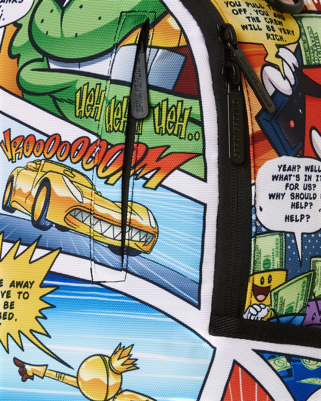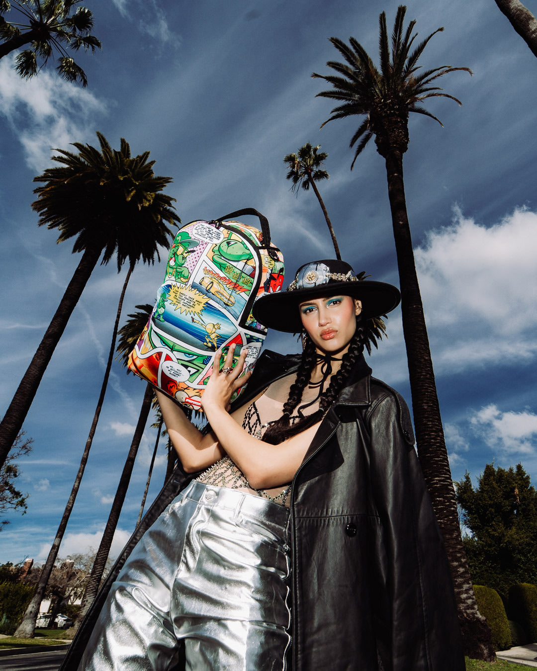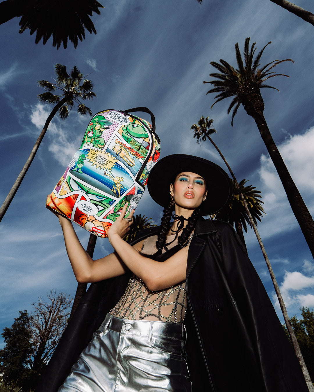 Dimensions: 18' x 6' x 11.5' • Front zipper pocket • Side pockets • Zippered Stash pocket • Separate velour sunglass compartment • Ergonomic mesh back padding • Adjustable Straps for custom sizing • Gold zippers with metal hardware • Metal 'Sprayground Authentic' badge • Slide through back sleeve connects to carry-on luggage to free your hands
