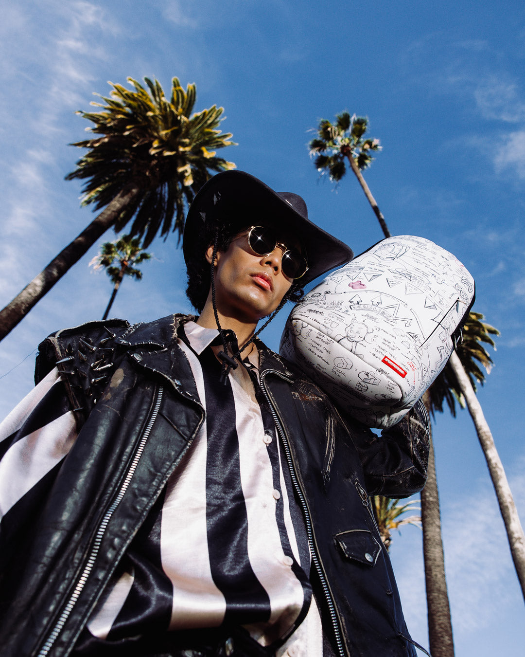 Dimensions: 18' x 6' x 11.5' • Front zipper pocket • Side pockets • Zippered Stash pocket • Separate velour sunglass compartment • Ergonomic mesh back padding • Adjustable Straps for custom sizing • Gold zippers with metal hardware • Metal 'Sprayground Authentic' badge • Slide through back sleeve connects to carry-on luggage to free your hands