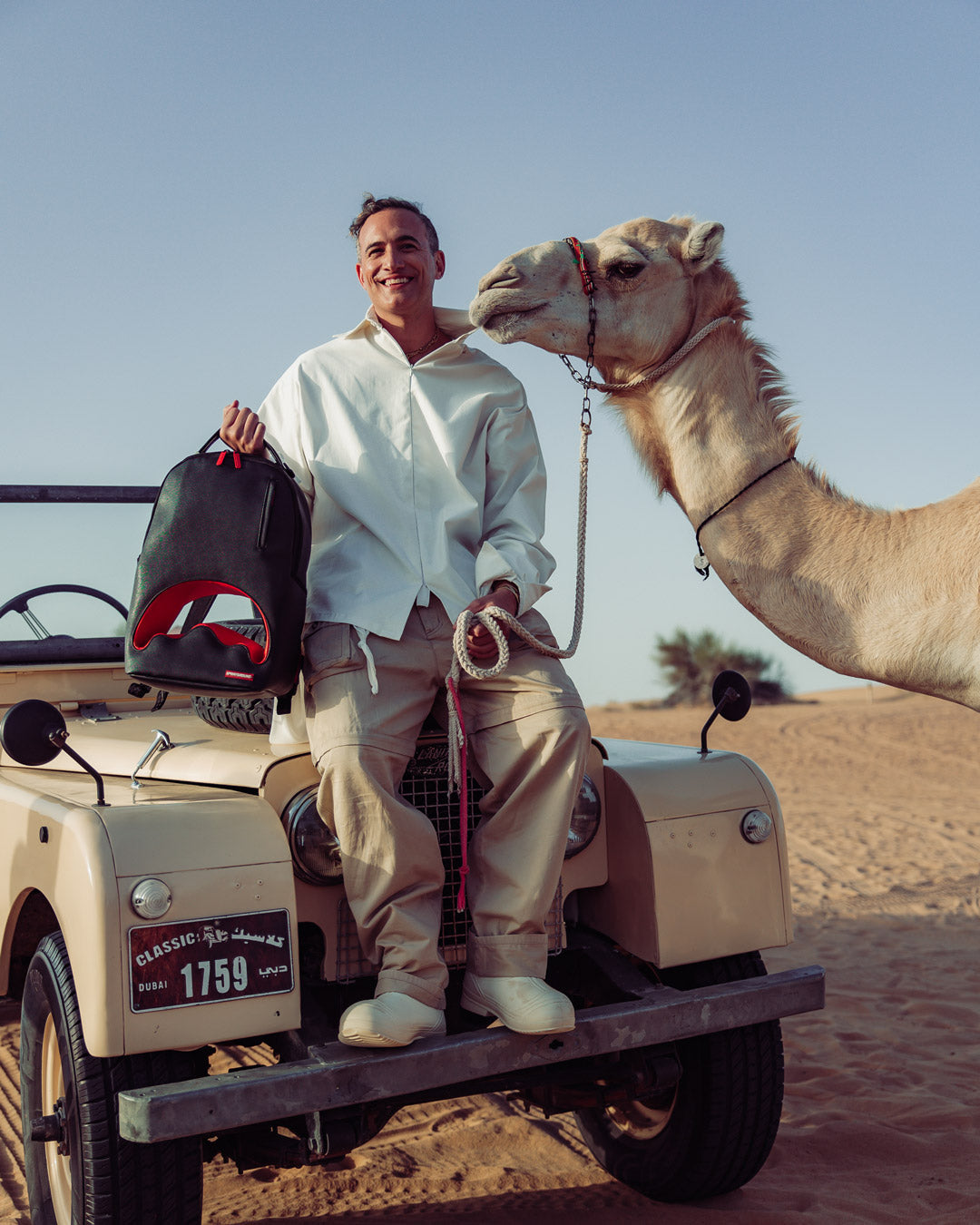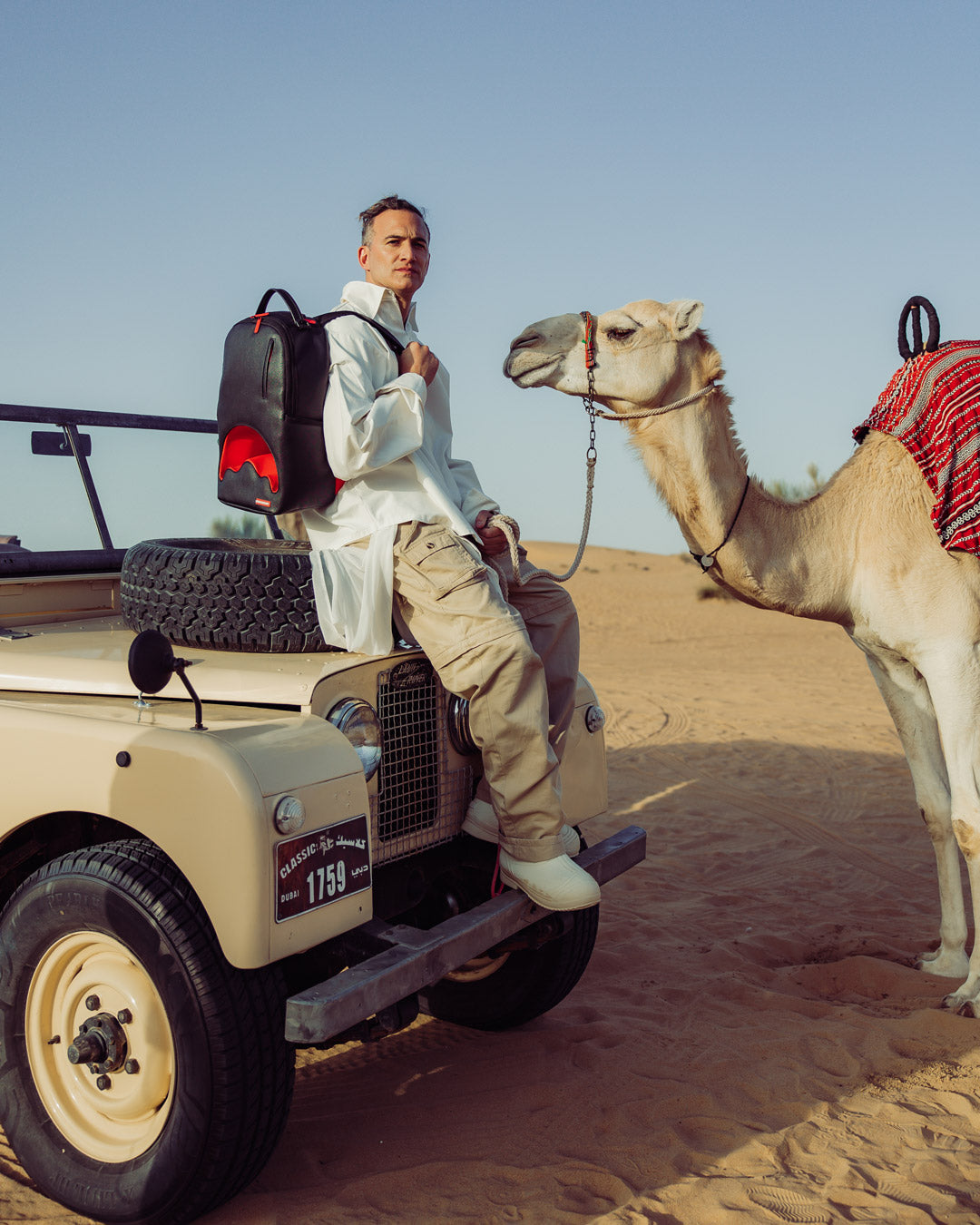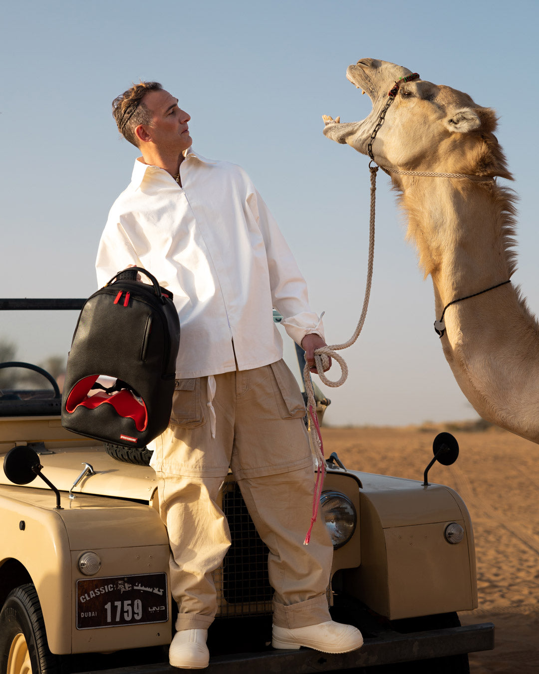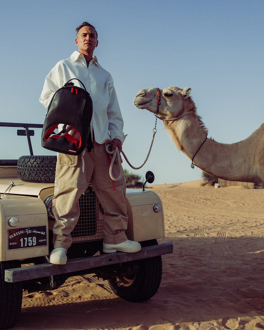 Dimensions: 18' x 6' x 11.5' • Front zipper pocket • Side pockets • Zippered Stash pocket • Separate velour sunglass compartment • Ergonomic mesh back padding • Adjustable Straps for custom sizing • Gold zippers with metal hardware • Metal 'Sprayground Authentic' badge • Slide through back sleeve connects to carry-on luggage to free your hands