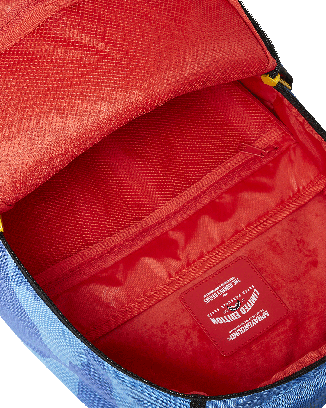 Dimensions: 18' x 6' x 11.5' • Front zipper pocket • Side pockets • Zippered Stash pocket • Separate velour sunglass compartment • Ergonomic mesh back padding • Adjustable Straps for custom sizing • Gold zippers with metal hardware • Metal 'Sprayground Authentic' badge • Slide through back sleeve connects to carry-on luggage to free your hands