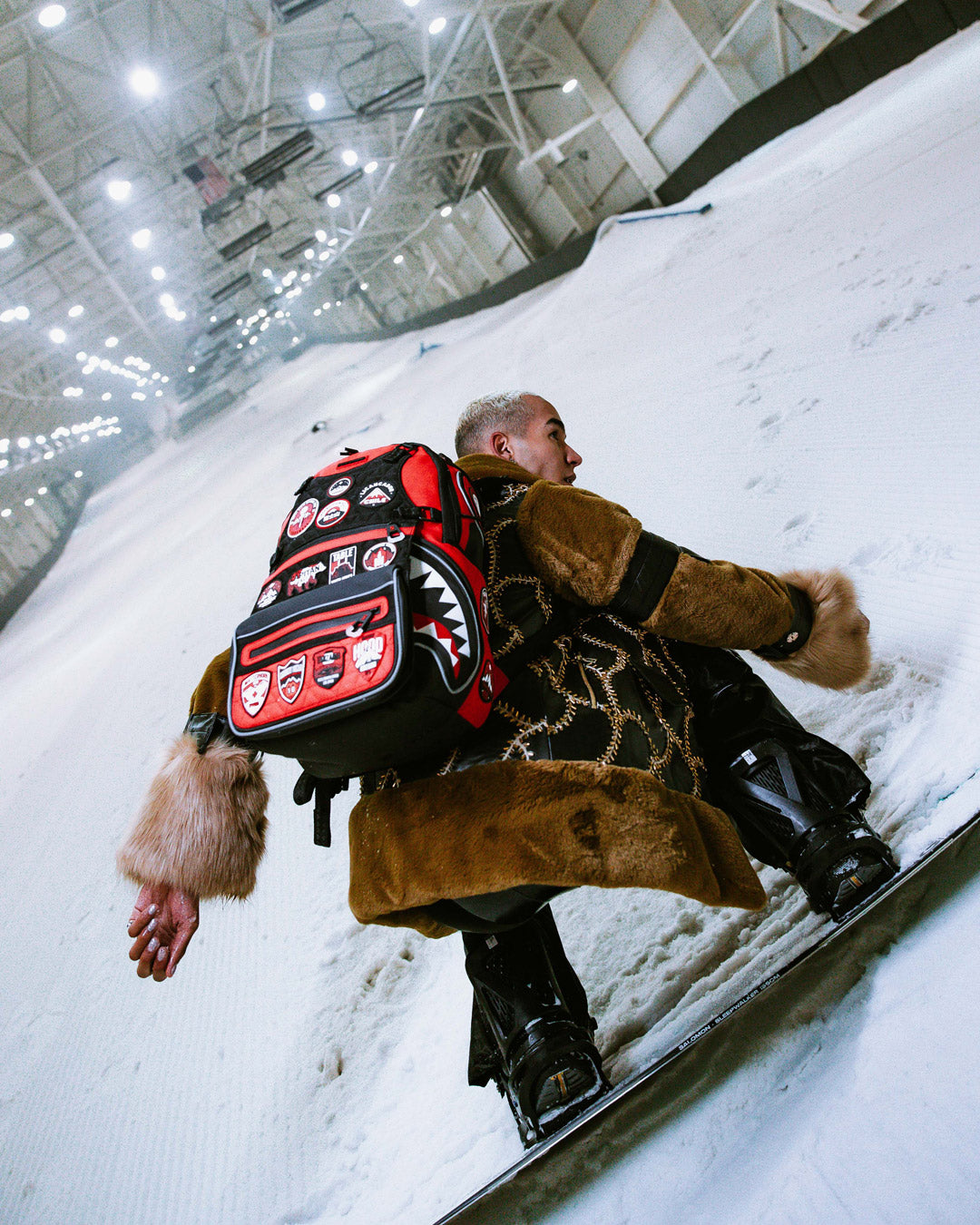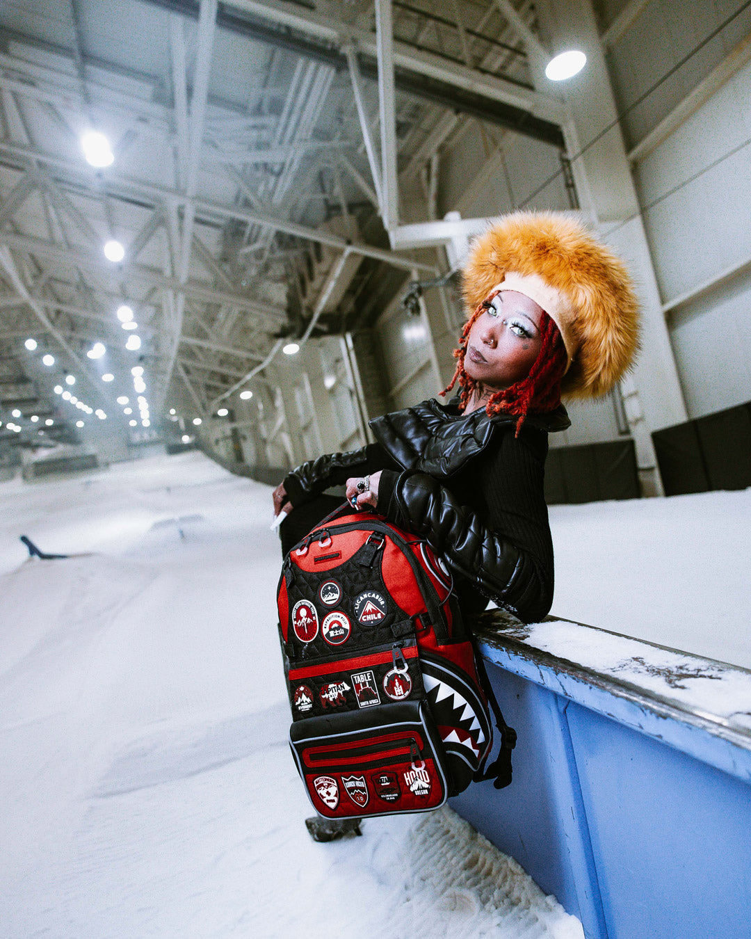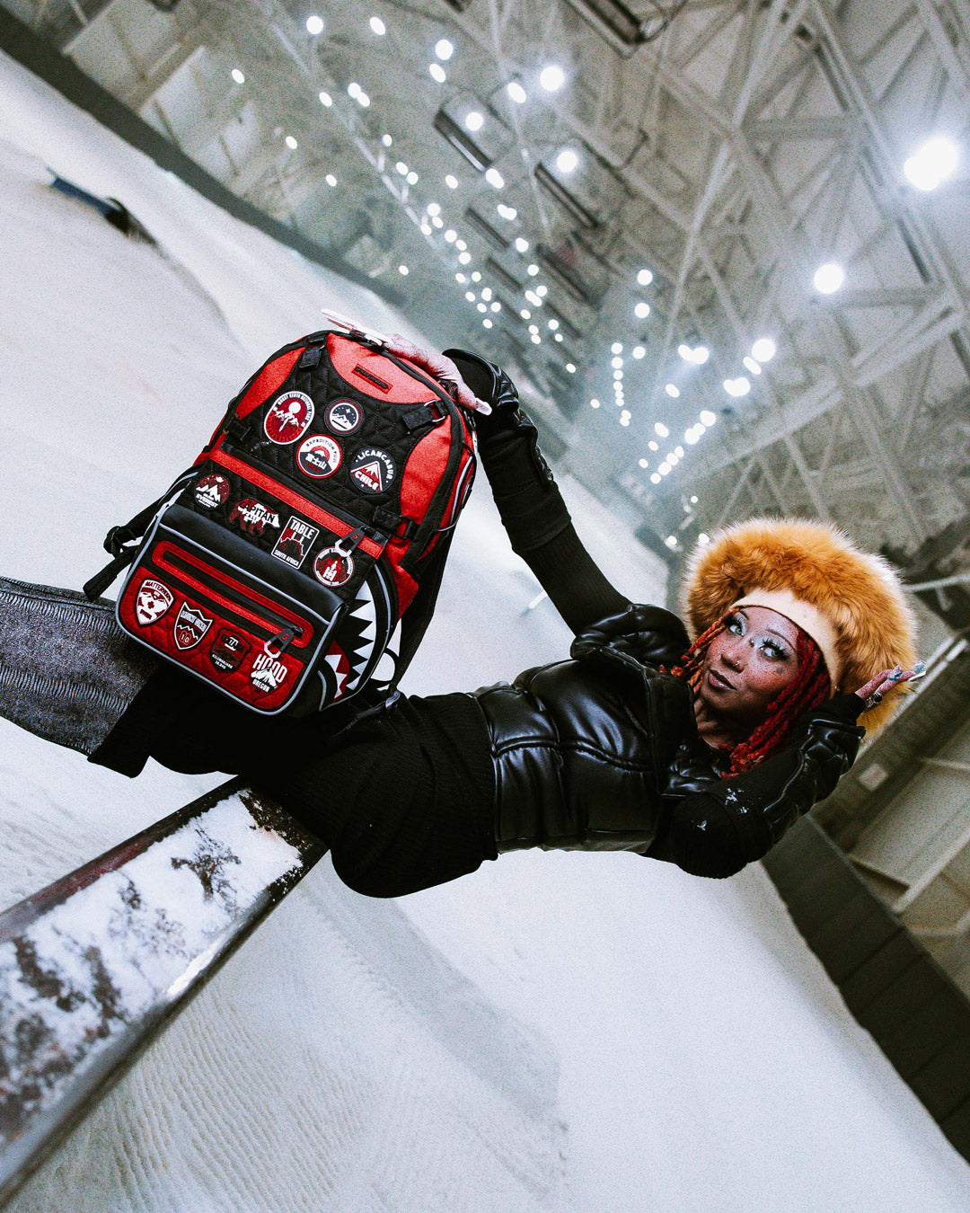 Dimensions: 18' x 6' x 11.5' • Front zipper pocket • Side pockets • Zippered Stash pocket • Separate velour sunglass compartment • Ergonomic mesh back padding • Adjustable Straps for custom sizing • Gold zippers with metal hardware • Metal 'Sprayground Authentic' badge • Slide through back sleeve connects to carry-on luggage to free your hands