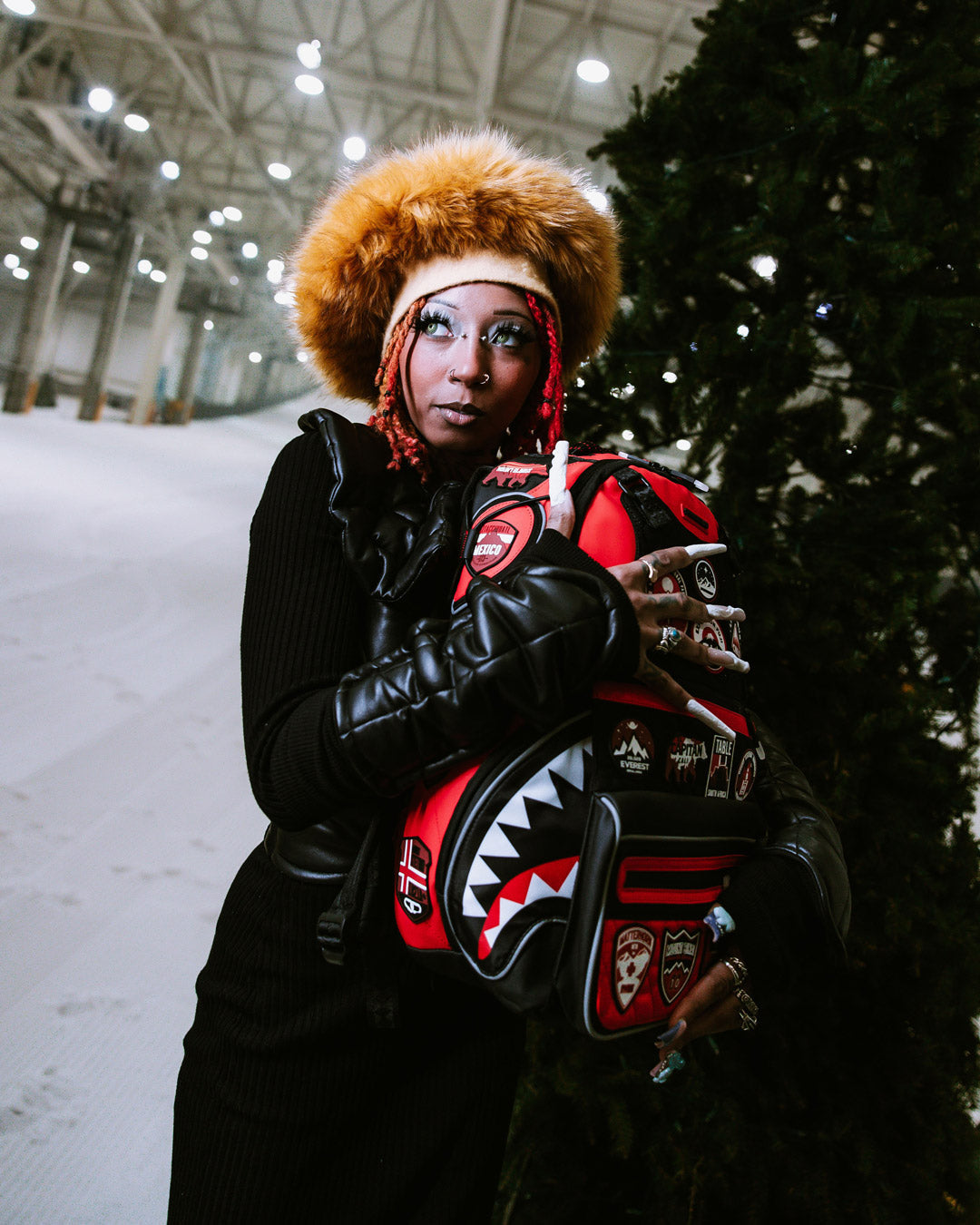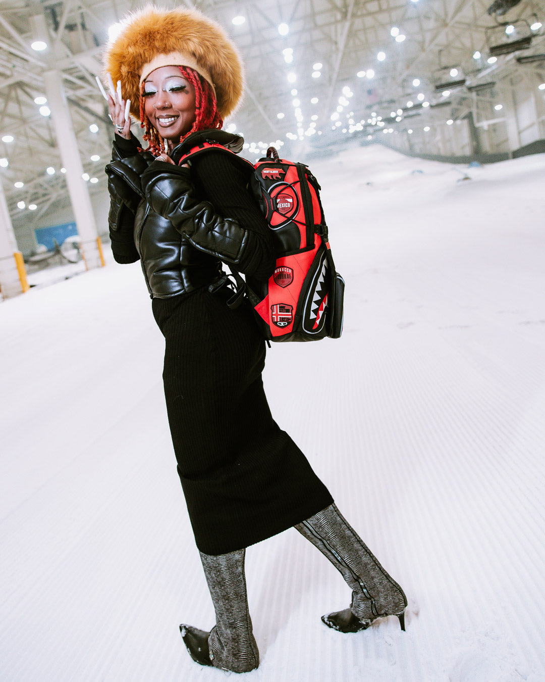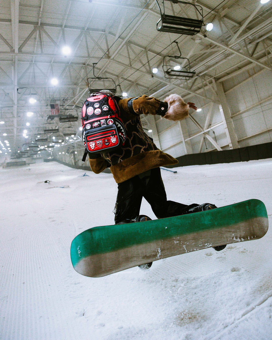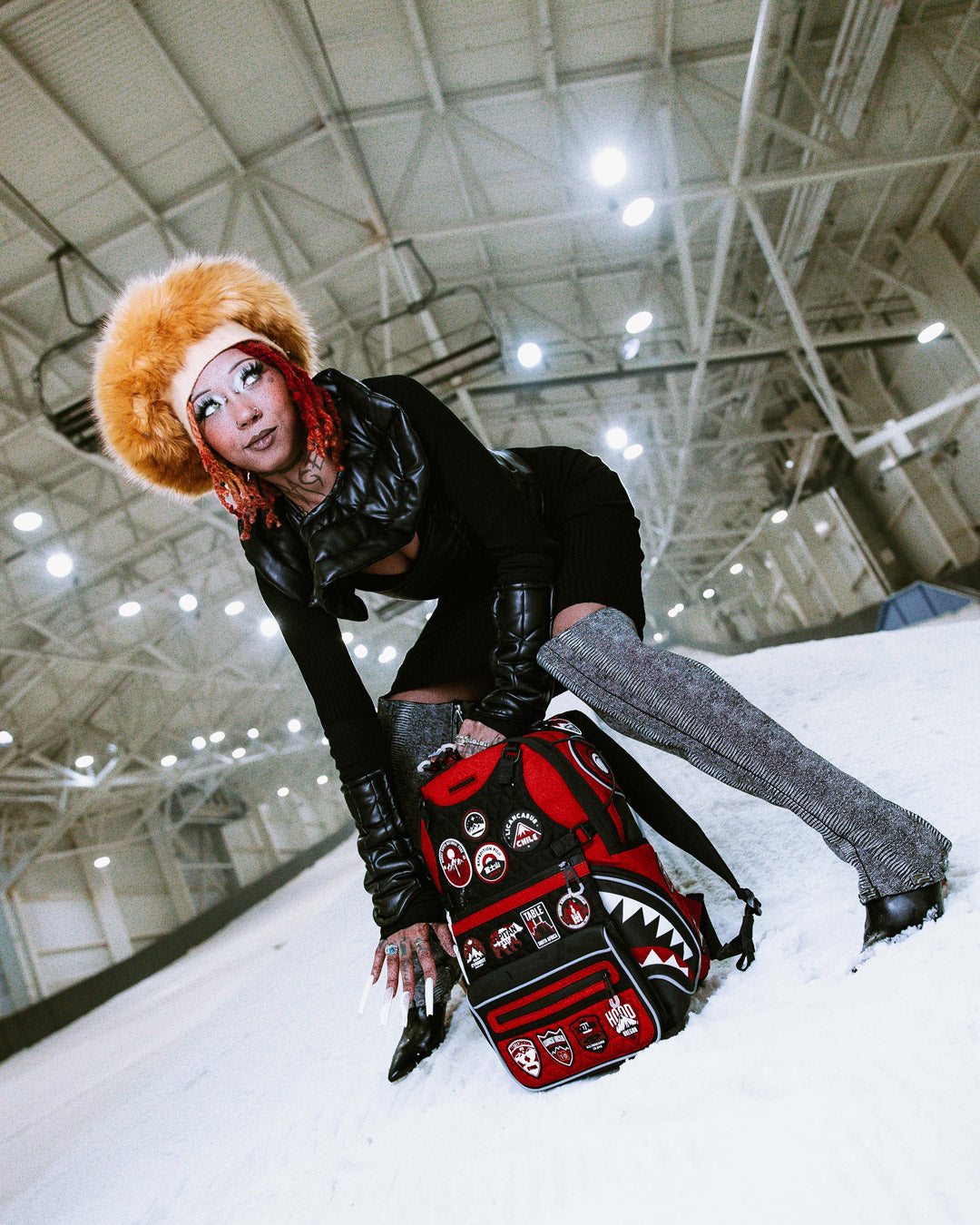 Dimensions: 18' x 6' x 11.5' • Front zipper pocket • Side pockets • Zippered Stash pocket • Separate velour sunglass compartment • Ergonomic mesh back padding • Adjustable Straps for custom sizing • Gold zippers with metal hardware • Metal 'Sprayground Authentic' badge • Slide through back sleeve connects to carry-on luggage to free your hands