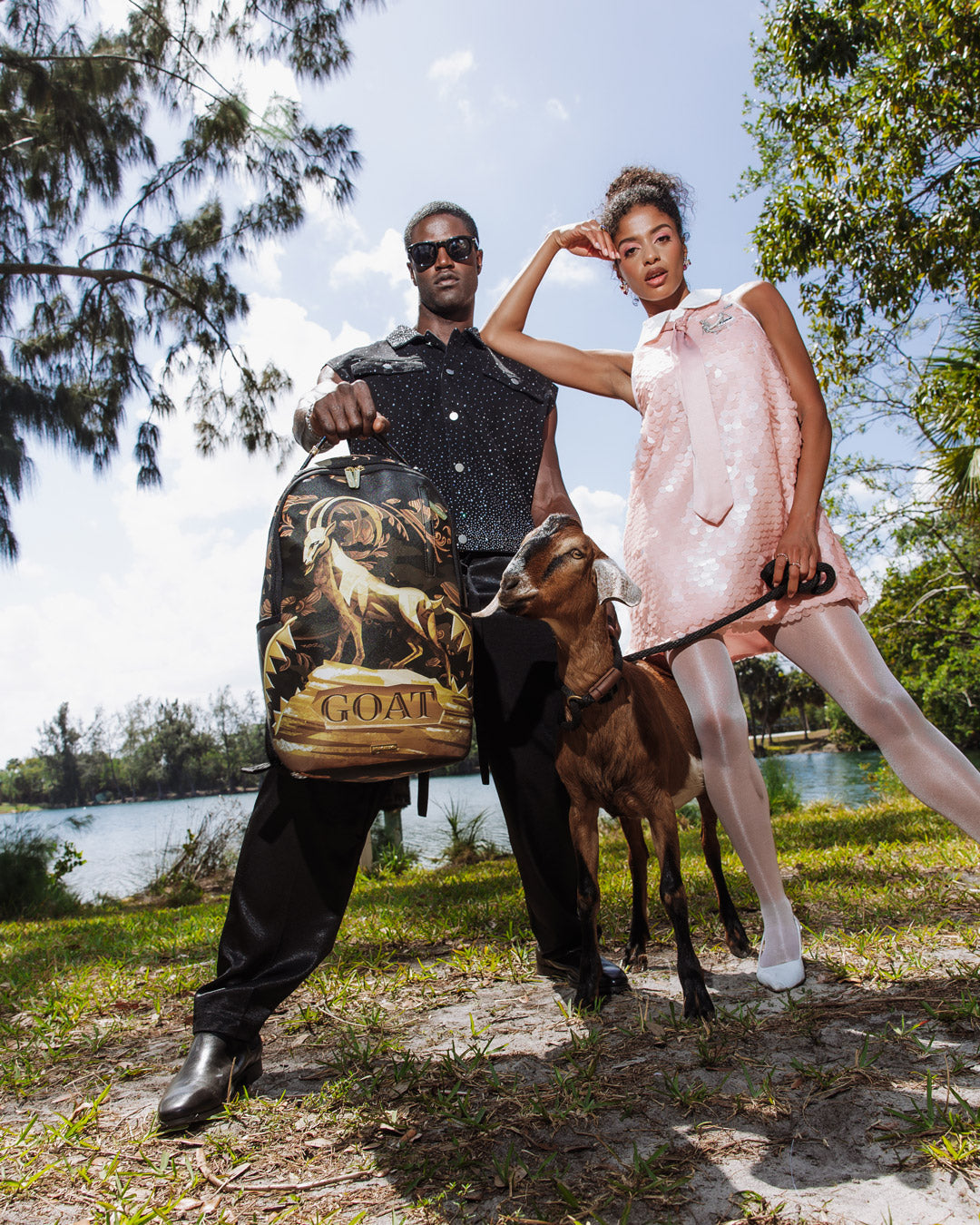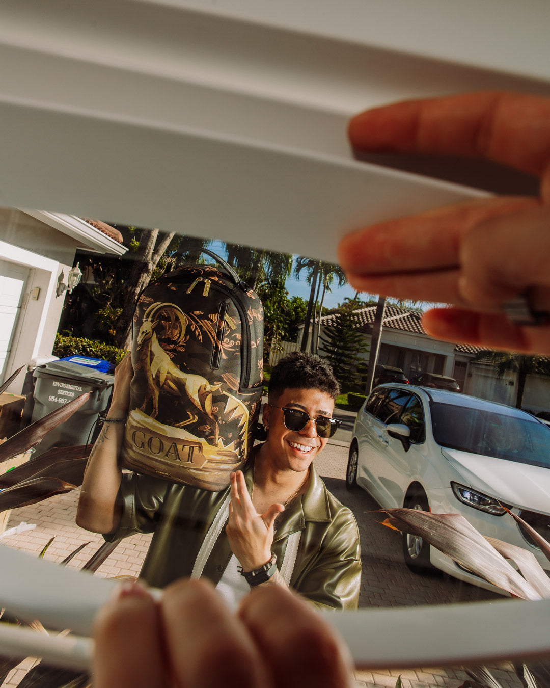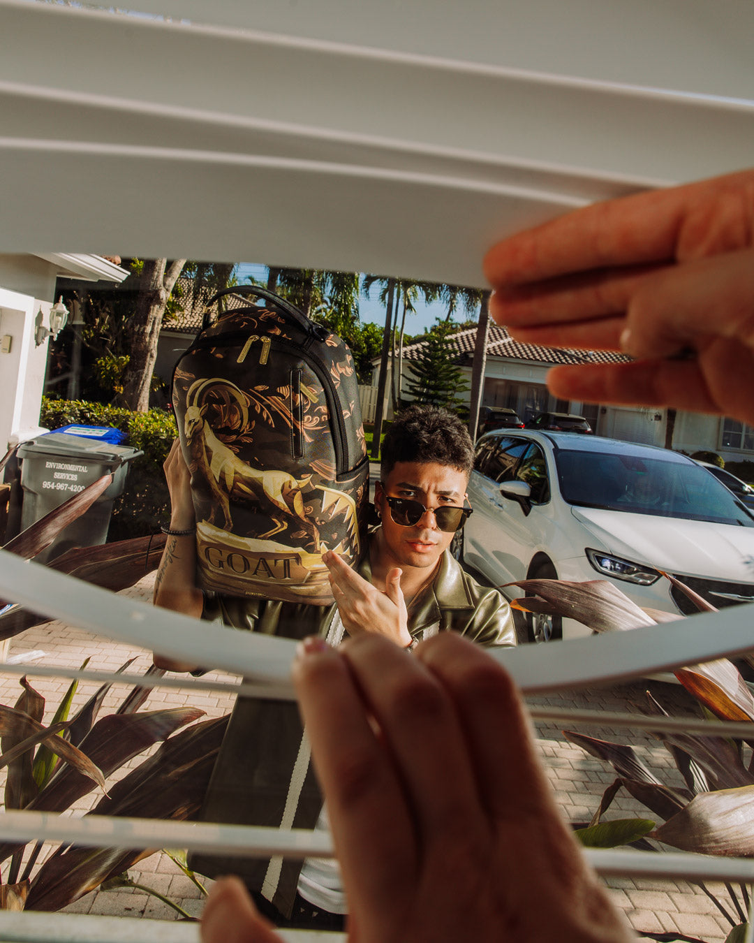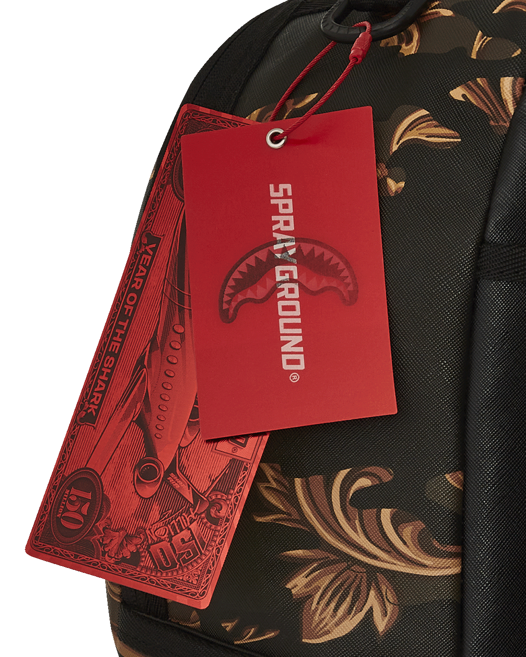 Dimensions: 18' x 6' x 11.5' • Front zipper pocket • Side pockets • Zippered Stash pocket • Separate velour sunglass compartment • Ergonomic mesh back padding • Adjustable Straps for custom sizing • Gold zippers with metal hardware • Metal 'Sprayground Authentic' badge • Slide through back sleeve connects to carry-on luggage to free your hands