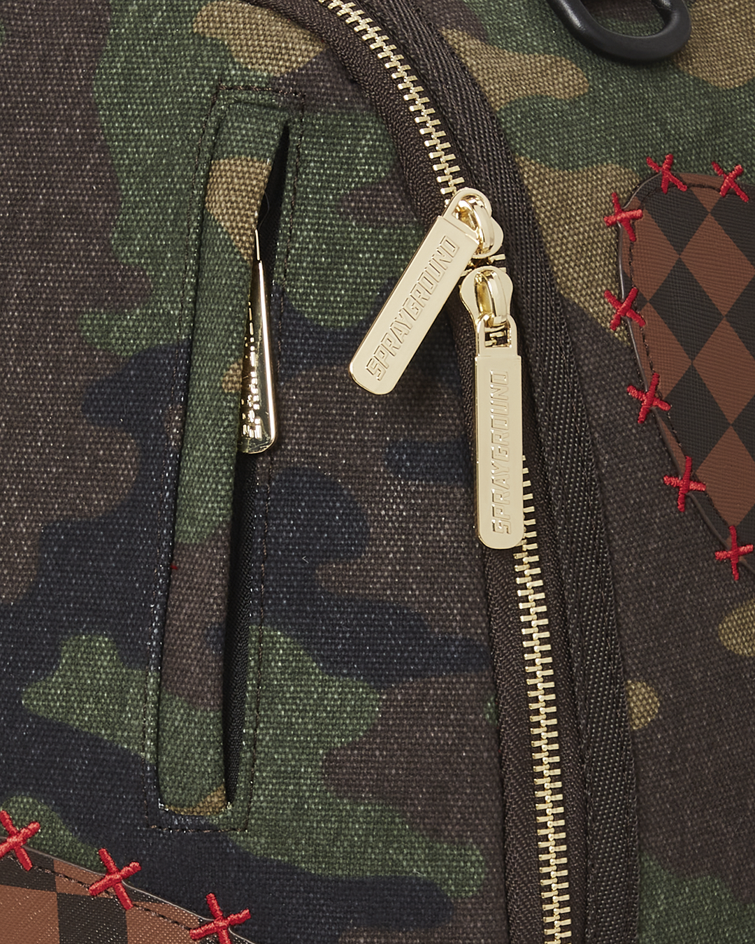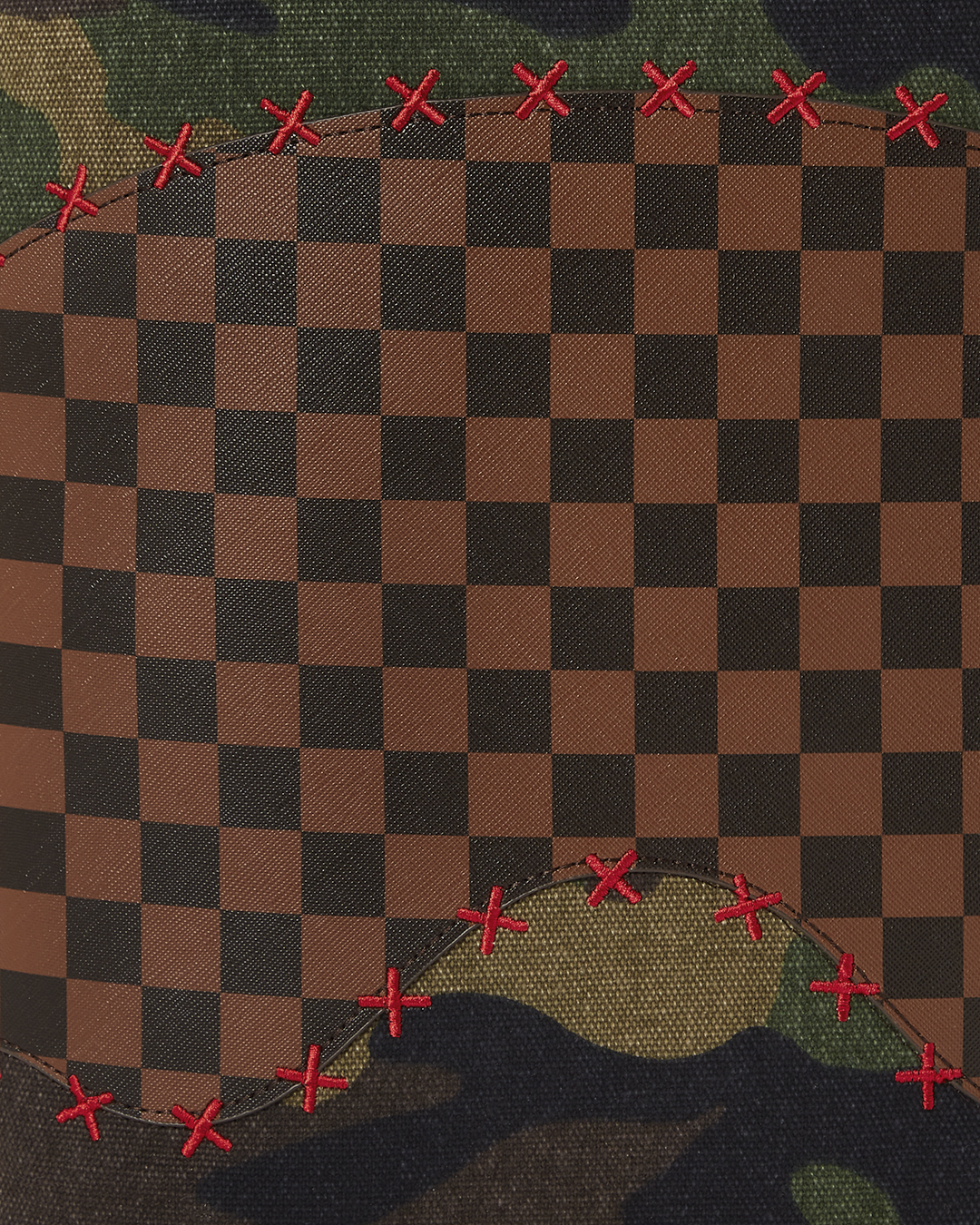 Dimensions: 18' x 6' x 11.5' • Front zipper pocket • Side pockets • Zippered Stash pocket • Separate velour sunglass compartment • Ergonomic mesh back padding • Adjustable Straps for custom sizing • Gold zippers with metal hardware • Metal 'Sprayground Authentic' badge • Slide through back sleeve connects to carry-on luggage to free your hands