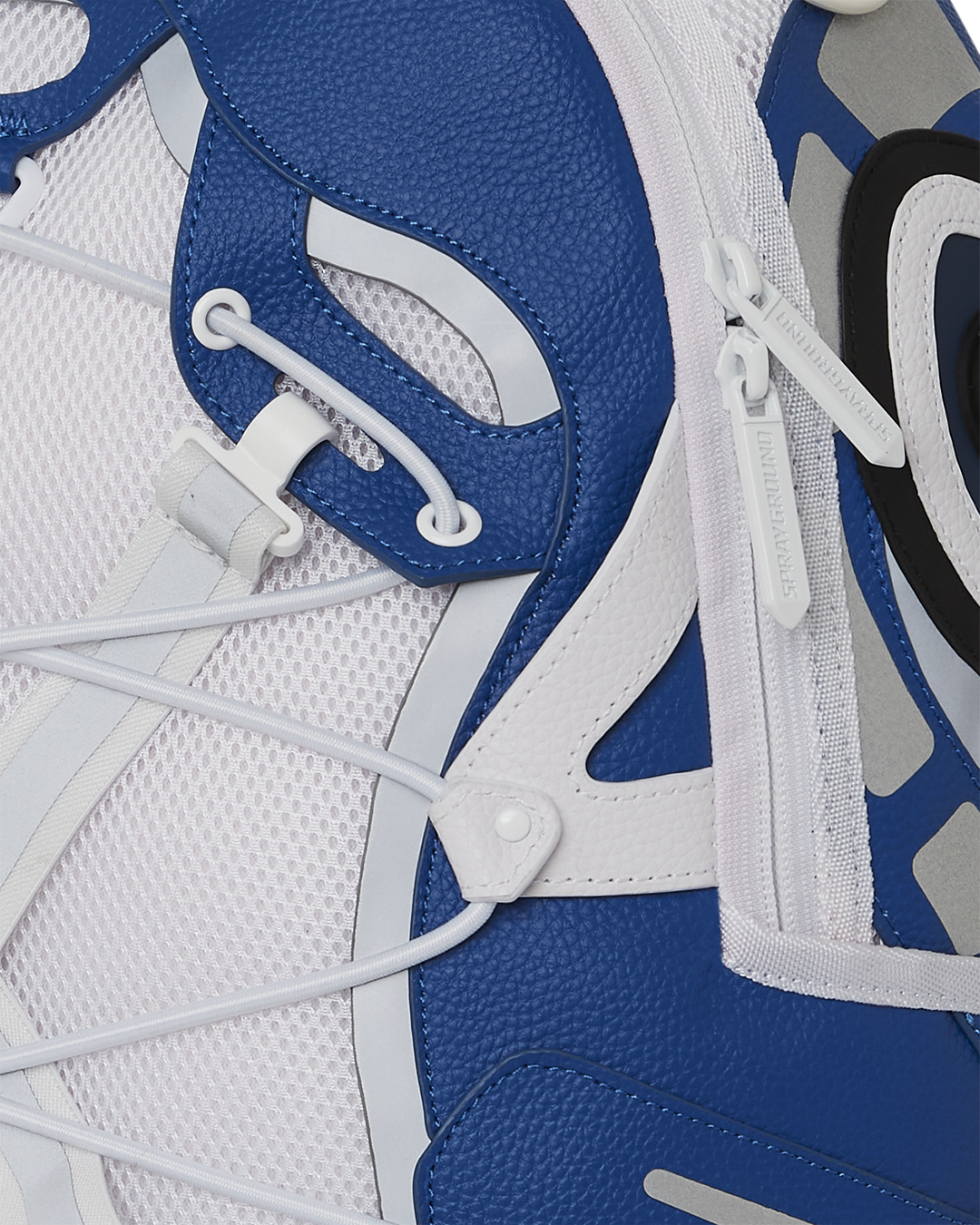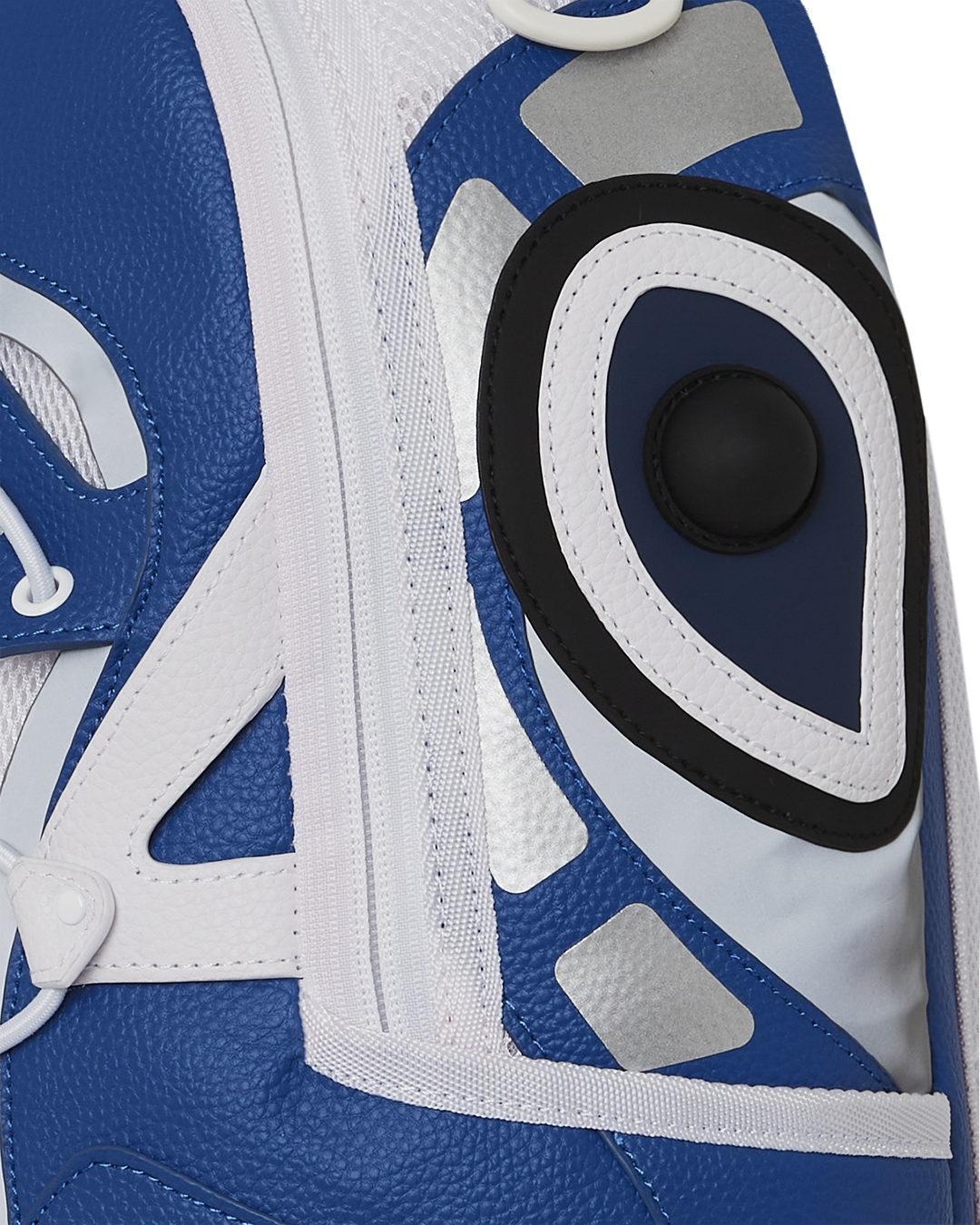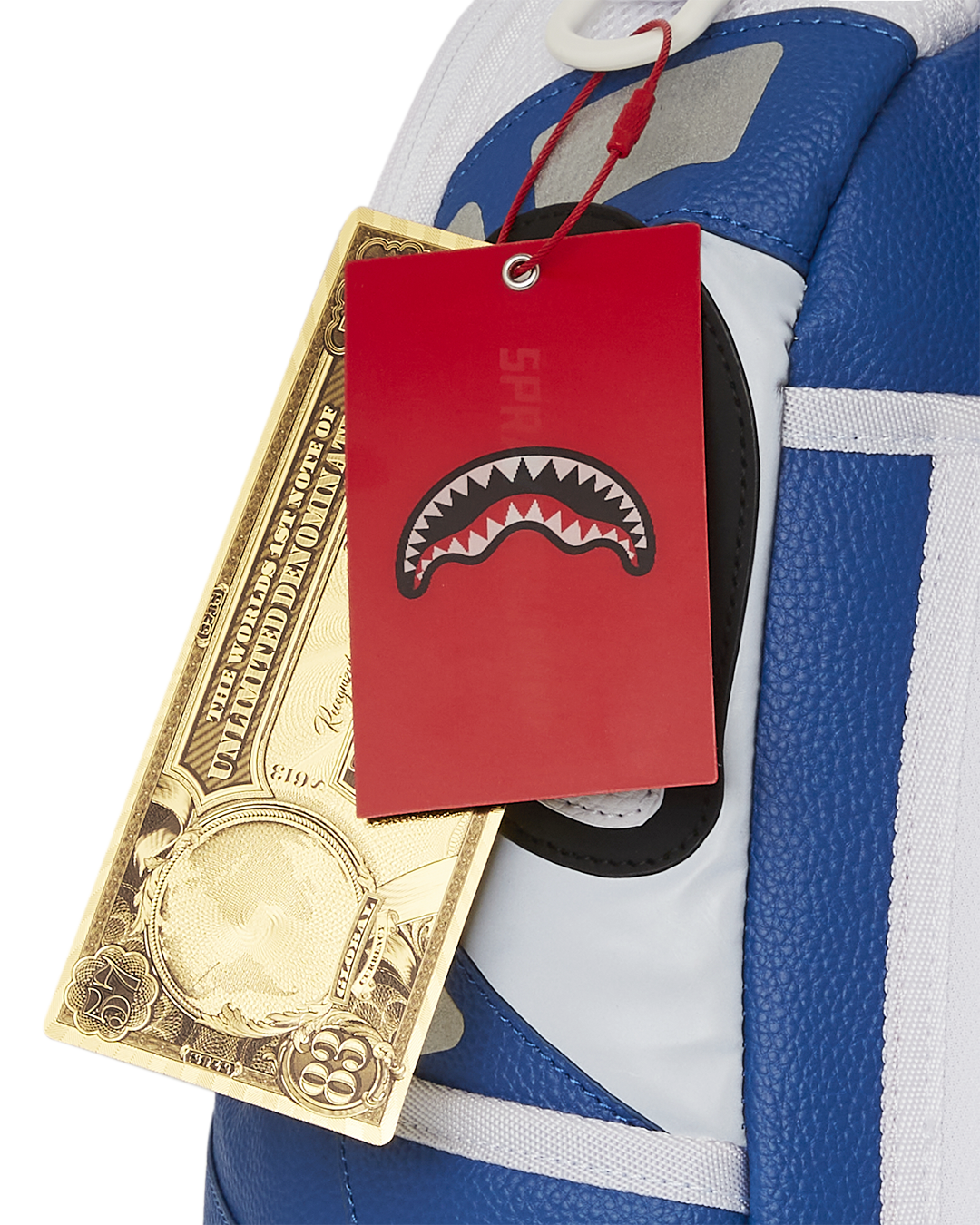 Dimensions: 18' x 6' x 11.5' • Front zipper pocket • Side pockets • Zippered Stash pocket • Separate velour sunglass compartment • Ergonomic mesh back padding • Adjustable Straps for custom sizing • Gold zippers with metal hardware • Metal 'Sprayground Authentic' badge • Slide through back sleeve connects to carry-on luggage to free your hands