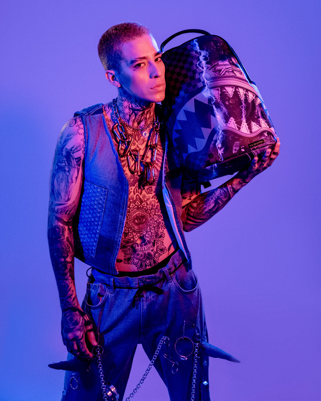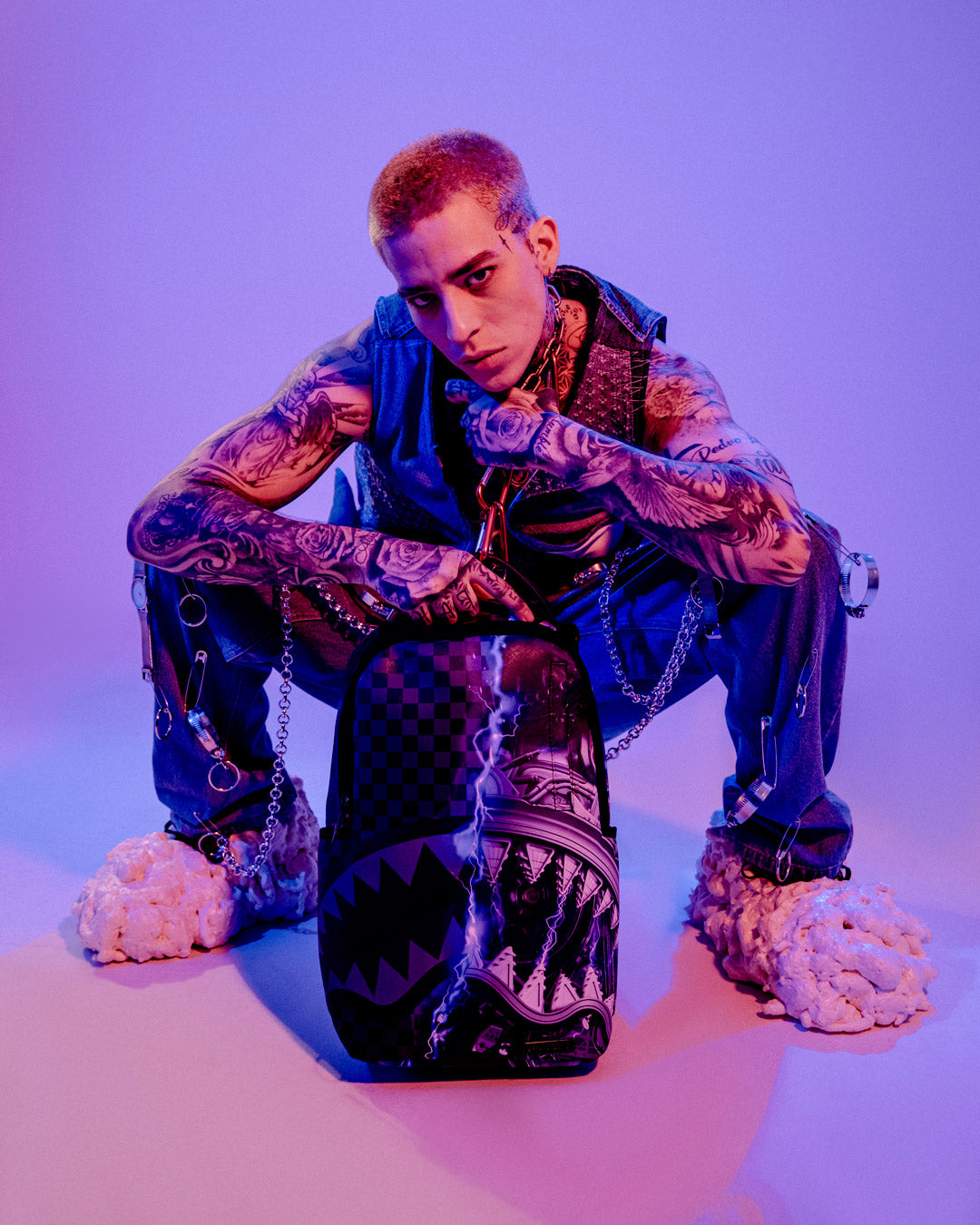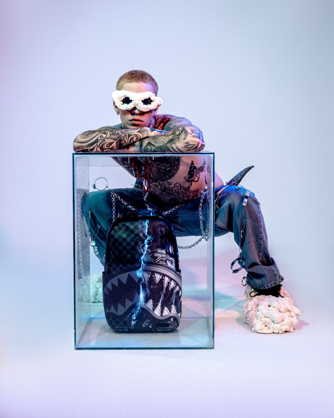 Dimensions: 18' x 6' x 11.5' • Front zipper pocket • Side pockets • Zippered Stash pocket • Separate velour sunglass compartment • Ergonomic mesh back padding • Adjustable Straps for custom sizing • Gold zippers with metal hardware • Metal 'Sprayground Authentic' badge • Slide through back sleeve connects to carry-on luggage to free your hands