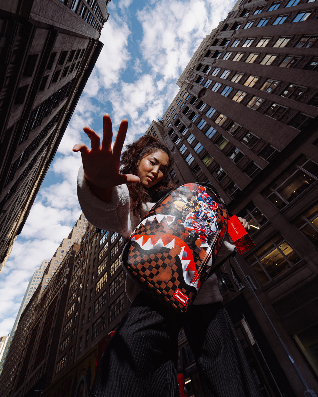 Dimensions: 18' x 6' x 11.5' • Front zipper pocket • Side pockets • Zippered Stash pocket • Separate velour sunglass compartment • Ergonomic mesh back padding • Adjustable Straps for custom sizing • Gold zippers with metal hardware • Metal 'Sprayground Authentic' badge • Slide through back sleeve connects to carry-on luggage to free your hands