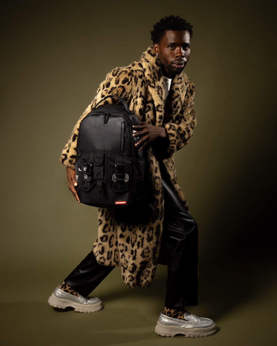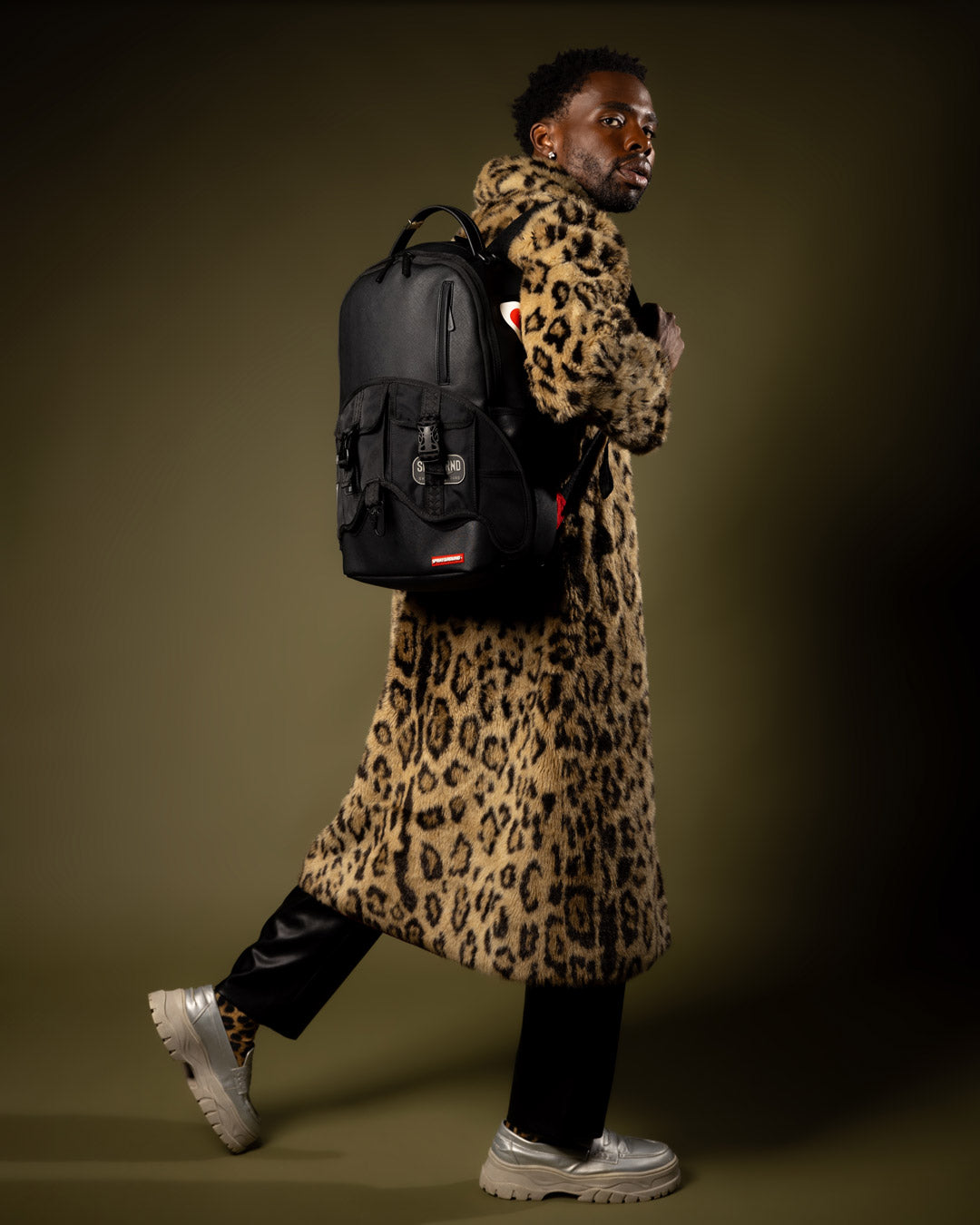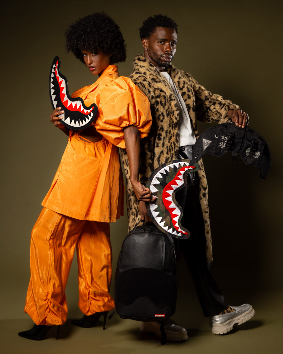 Dimensions: 18' x 6' x 11.5' • Front zipper pocket • Side pockets • Zippered Stash pocket • Separate velour sunglass compartment • Ergonomic mesh back padding • Adjustable Straps for custom sizing • Gold zippers with metal hardware • Metal 'Sprayground Authentic' badge • Slide through back sleeve connects to carry-on luggage to free your hands