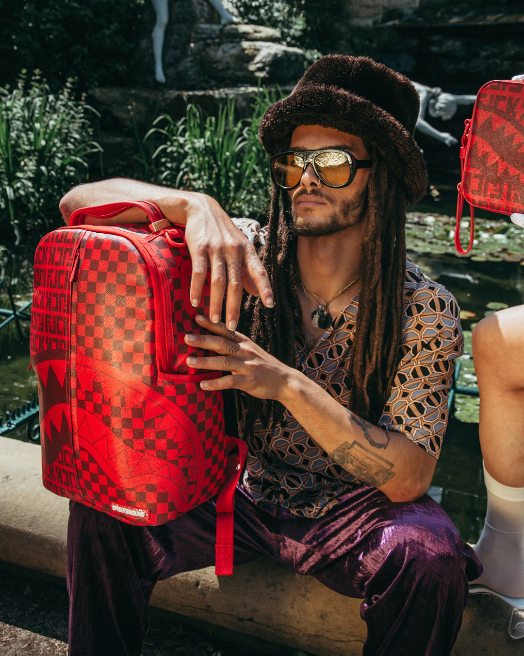 Dimensions: 18' x 6' x 11.5' • Front zipper pocket • Side pockets • Zippered Stash pocket • Separate velour sunglass compartment • Ergonomic mesh back padding • Adjustable Straps for custom sizing • Gold zippers with metal hardware • Metal 'Sprayground Authentic' badge • Slide through back sleeve connects to carry-on luggage to free your hands
