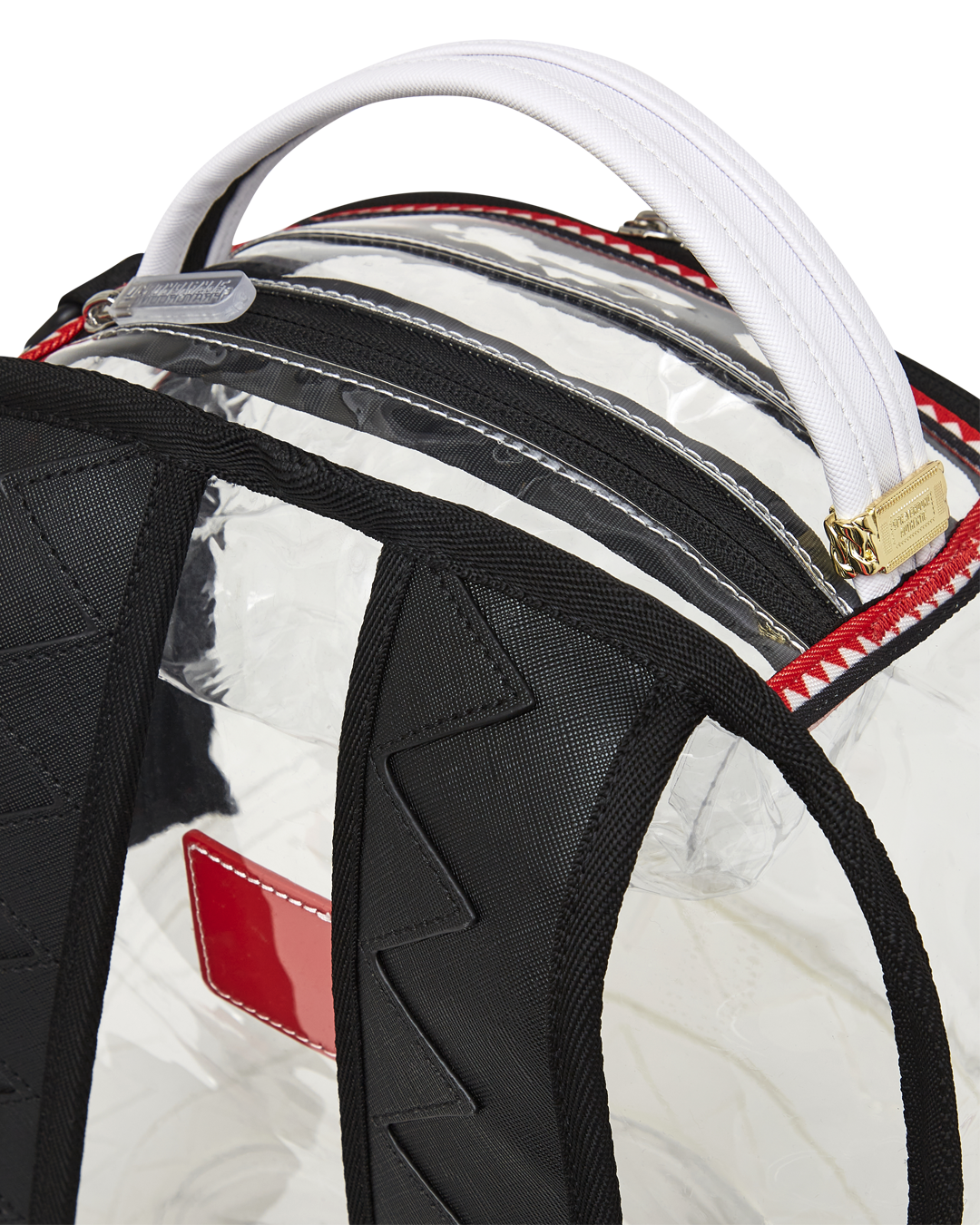 Clear PVC bag with cut and sew shark mouth with VSM patterned trims/binding