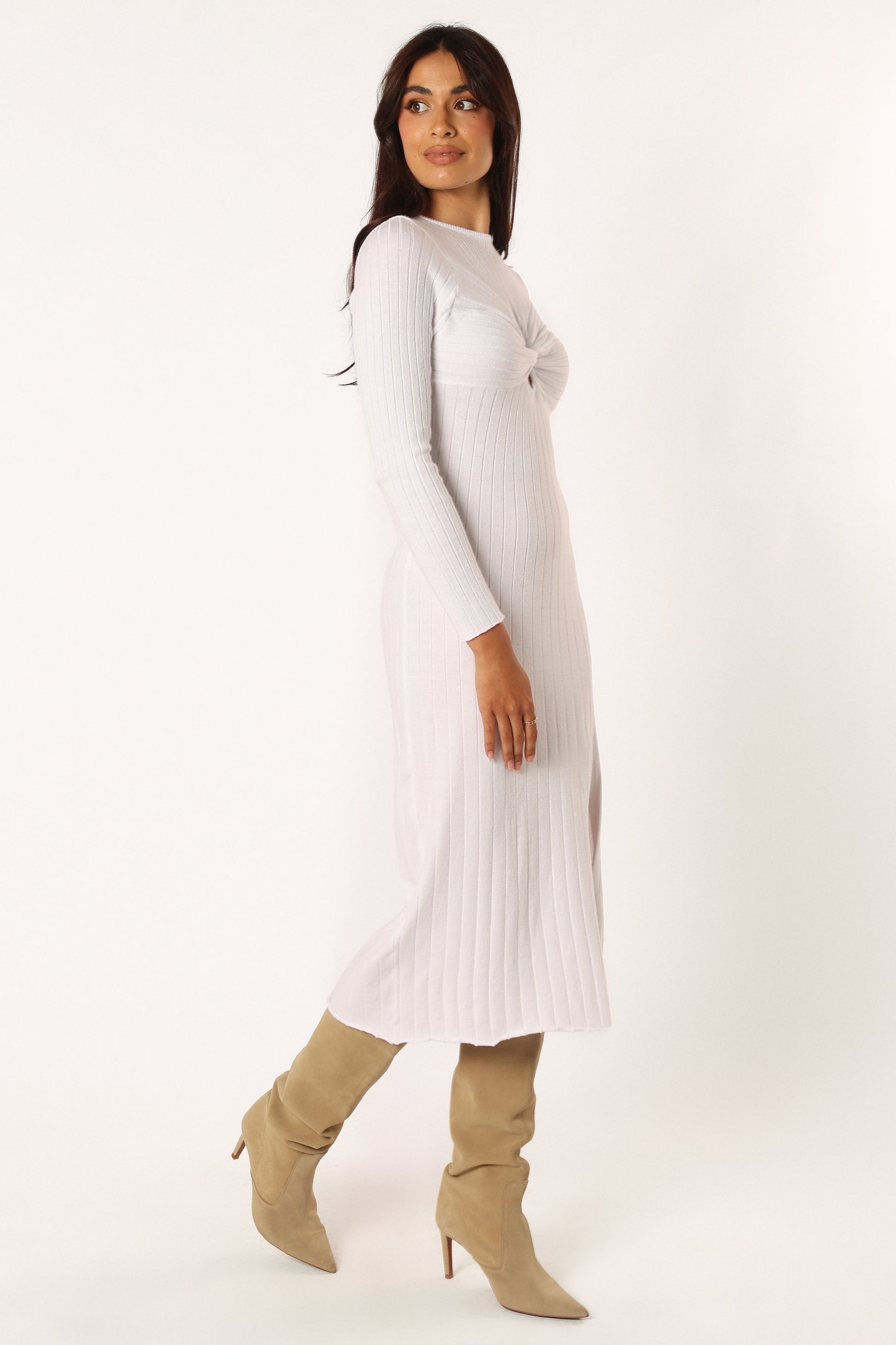 DETAILS Fashion-forward and trendy, this midi length dress is an absolute must-have in your wardrobe. The high round neckline gives a sleek and sophisticated touch while the bust twist knot adds a playful element to the overall design.